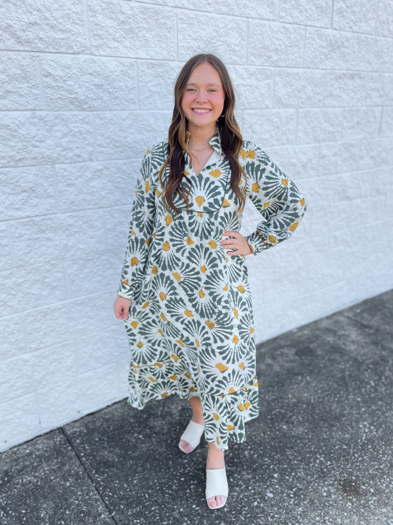Brighten your fall wardrobe with the Jodifl Olive Kendall Dress, featuring a stunning white, green, and yellow floral print that brings a fun pop of color. The playful v-neck style pairs perfectly with long sleeves for a cozy yet stylish look. This maxi dress combines vibrant patterns with comfortable elegance, making it your go-to for the season!