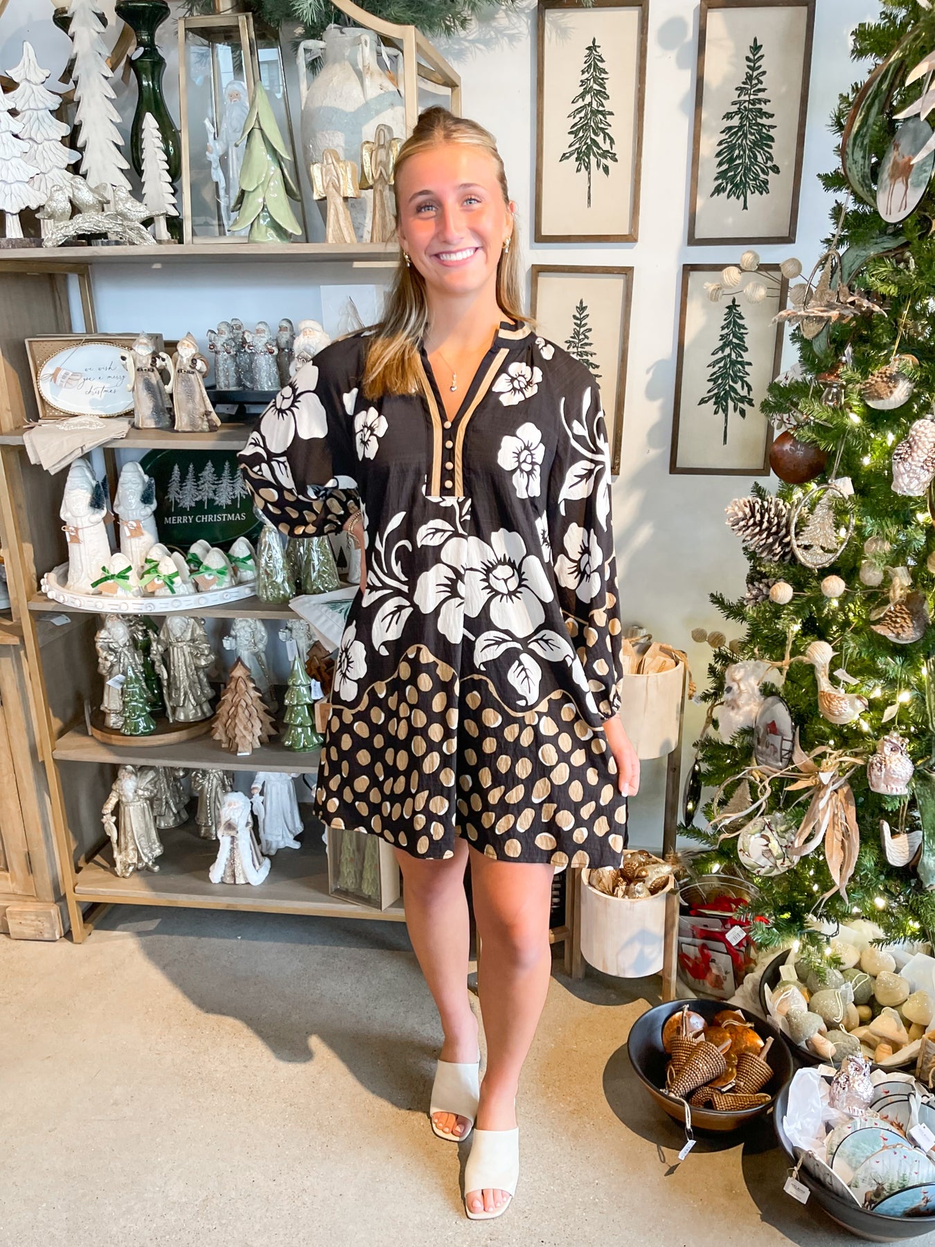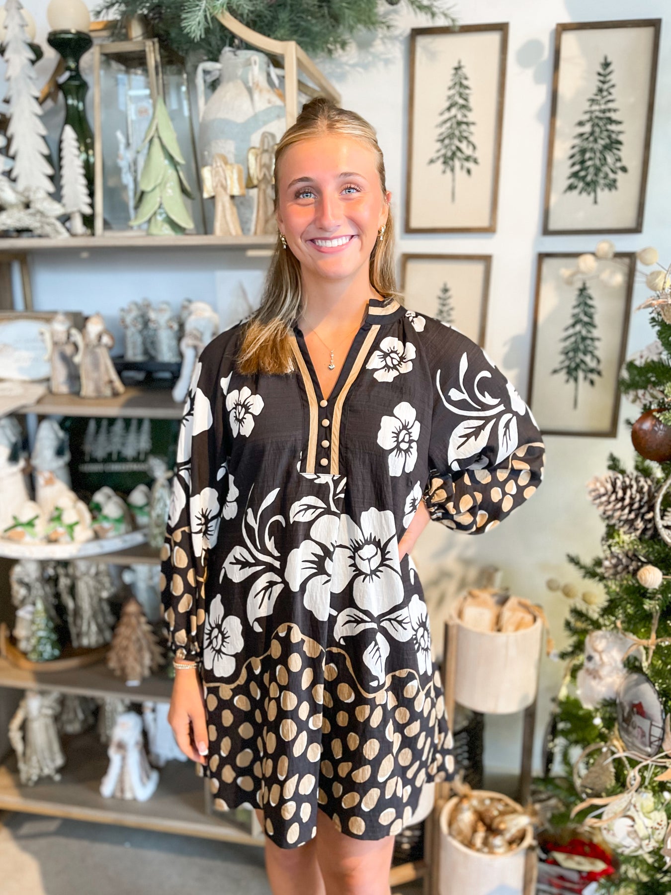 Embrace effortless elegance with the Umgee Black Halli Dress—a stunning white and black floral that's made for fall. The romantic V-neckline pairs beautifully with a sporty varsity collar detail, creating an unexpected contrast that feels totally on-trend. The longer, flowy silhouette moves with you gracefully, offering comfort and sophistication in one gorgeous package. Whether you're dressing up or keeping it casual, this dress brings that perfect blend of style and ease to your seasonal wardrobe.