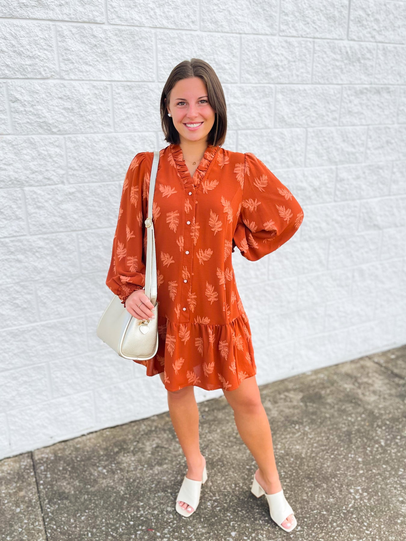 Step into fall with the playful Umgee Rust Skylar Dress, featuring a rich rust orange hue and textured floral details that add a touch of whimsy. The V-neckline is framed by a charming ruffle, complemented by buttons down the front for easy style. Long sleeves with elastic cuffs keep things cozy, while a flirty ruffle hem swings with every step. Perfect for those who love a mix of fun and flair in their wardrobe.