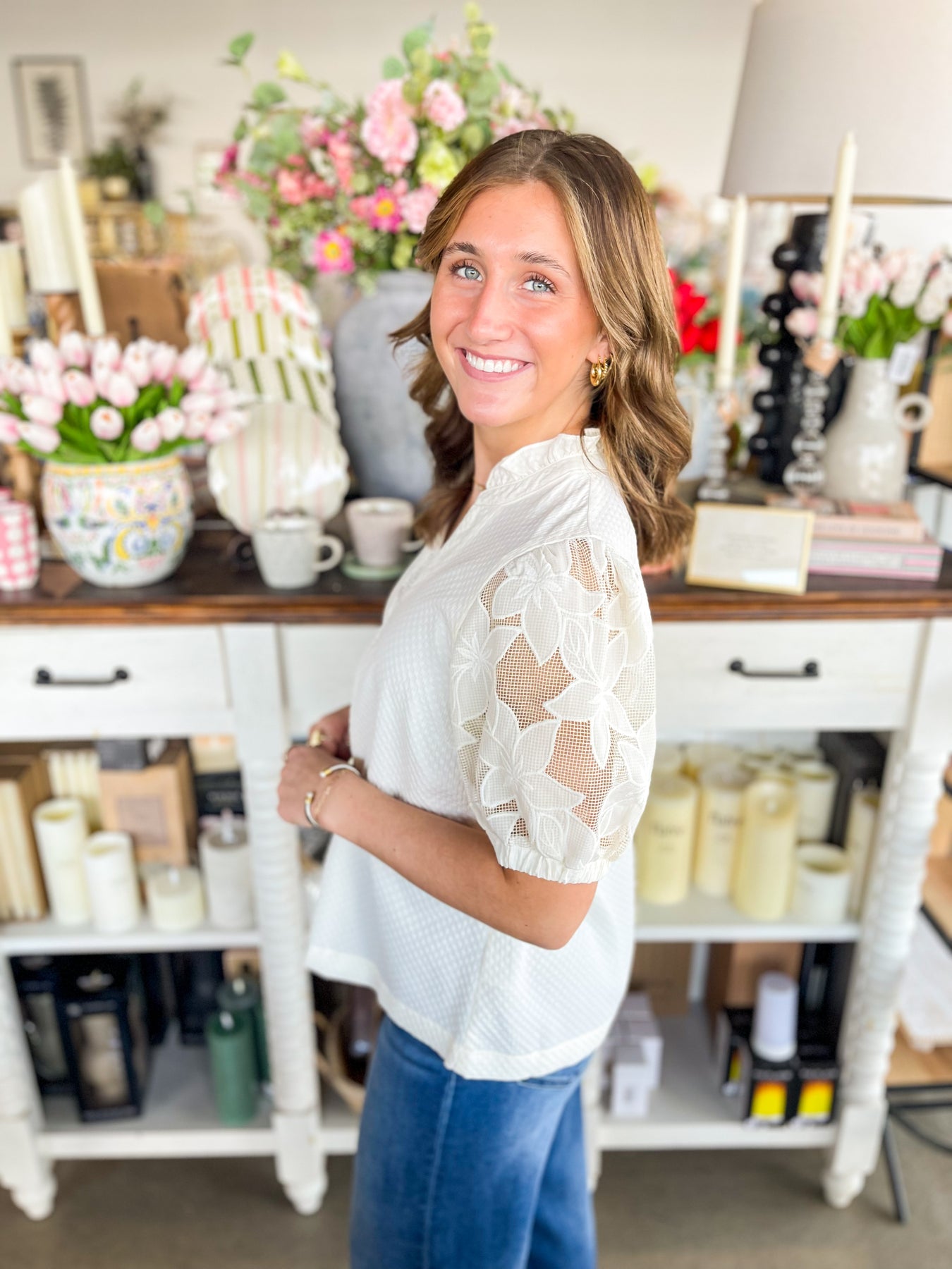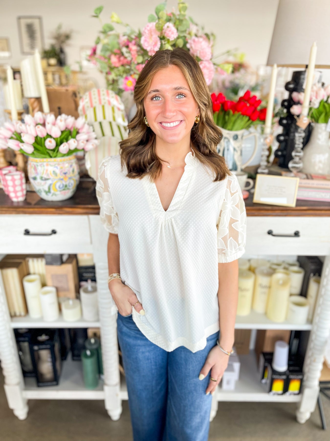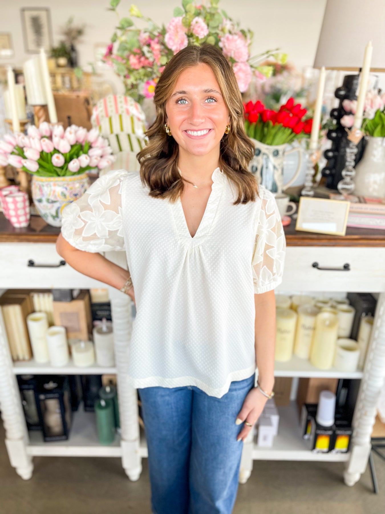 Elevate your spring wardrobe with this stunning Cream top featuring delicate lace detailing and a flattering V-neckline. The voluminous puff sleeves add a romantic touch, while the flowy silhouette ensures effortless comfort and movement. Perfect for layering or wearing solo, this versatile piece transitions seamlessly from casual days to evening occasions. A timeless essential that brings elegance and dimension to any outfit.