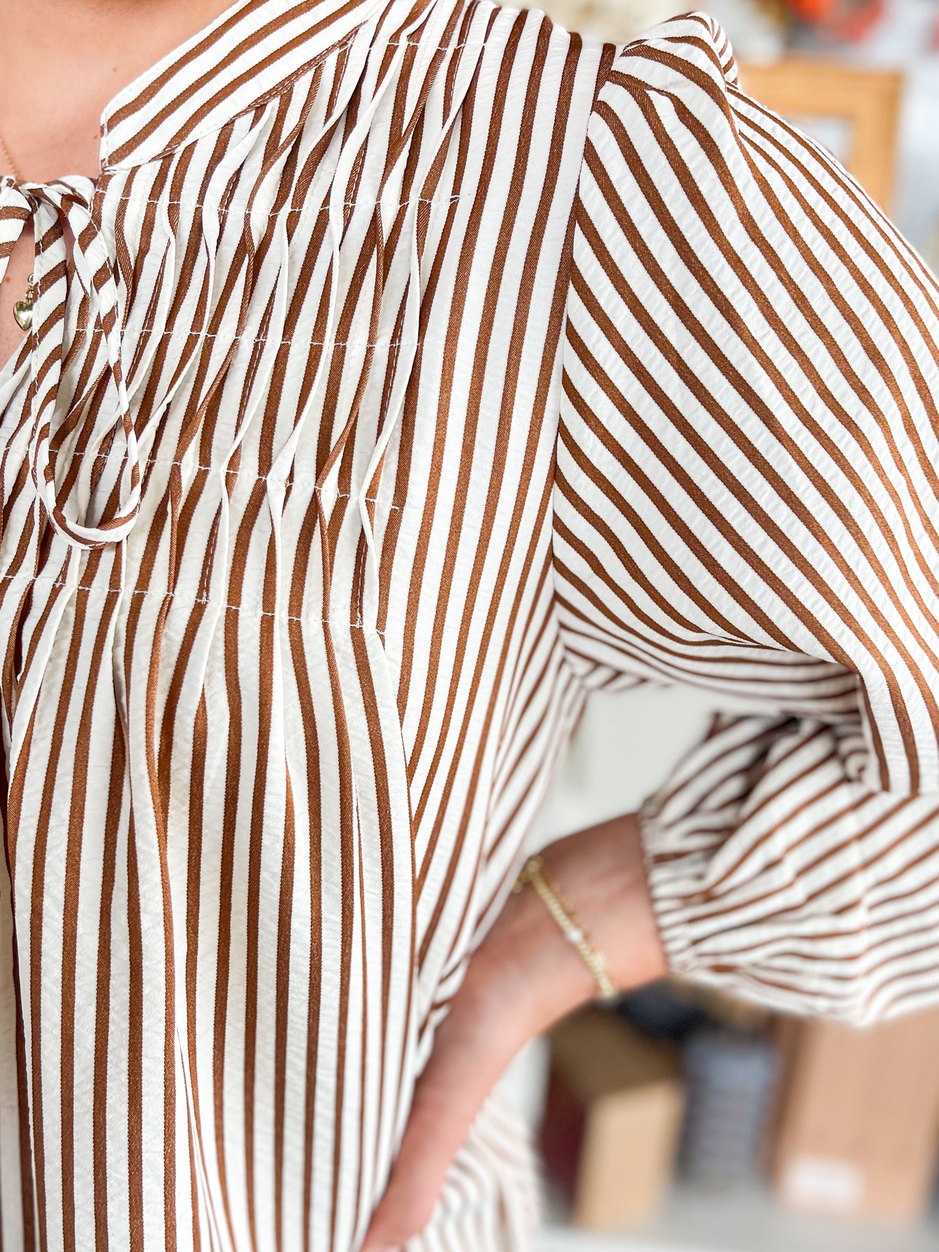 Step into fall with the Brown Harlowe Top, featuring cozy brown and white stripes in a textured fabric. Playful pleats on the bust add charm, while the tie neck detail closure brings a flirty touch. Elastic sleeves complete the look, making this top perfect for easy, stylish layering all season long.