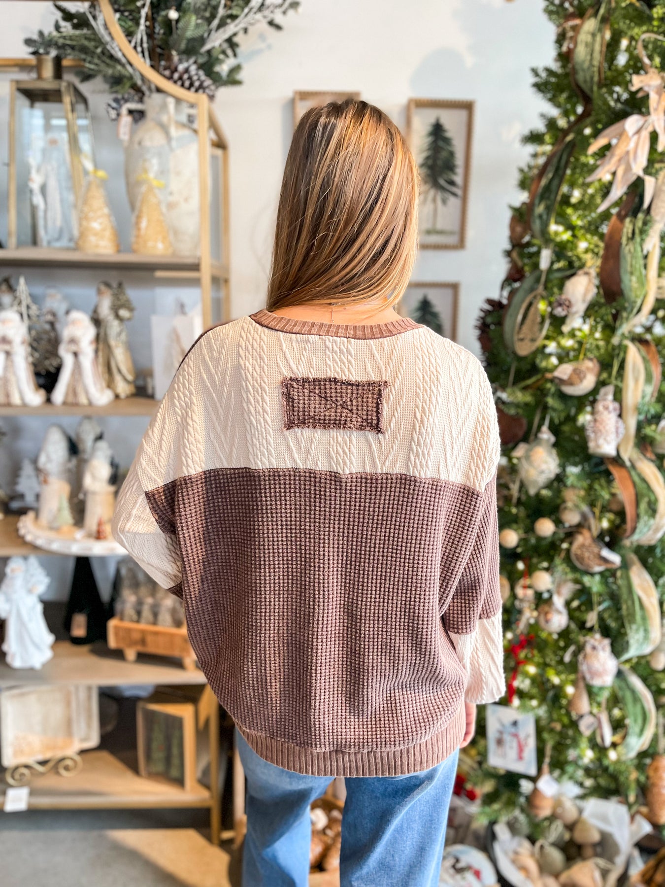 The Navy Chocolate Top is your new cozy essential with an edge. This stunning patchwork design blends brown and cream in a way that's totally on-trend, while knit details and exposed seams add authentic character. Ultra-soft to the touch, the slightly oversized fit wraps you in comfort without feeling bulky—perfect for those days when you want to feel effortlessly put-together. Layer it, wear it solo, or throw it on for instant style that feels like a warm hug.