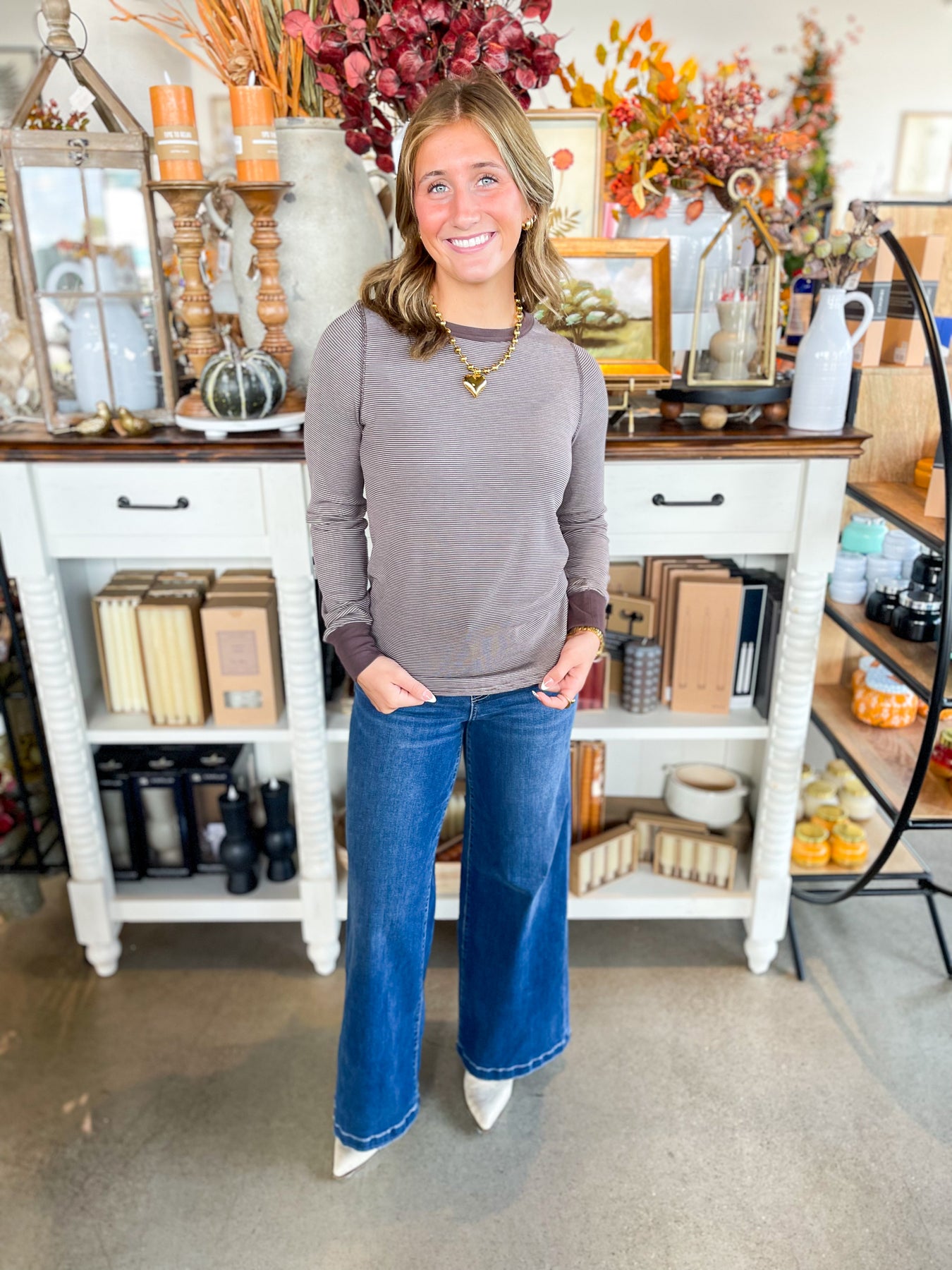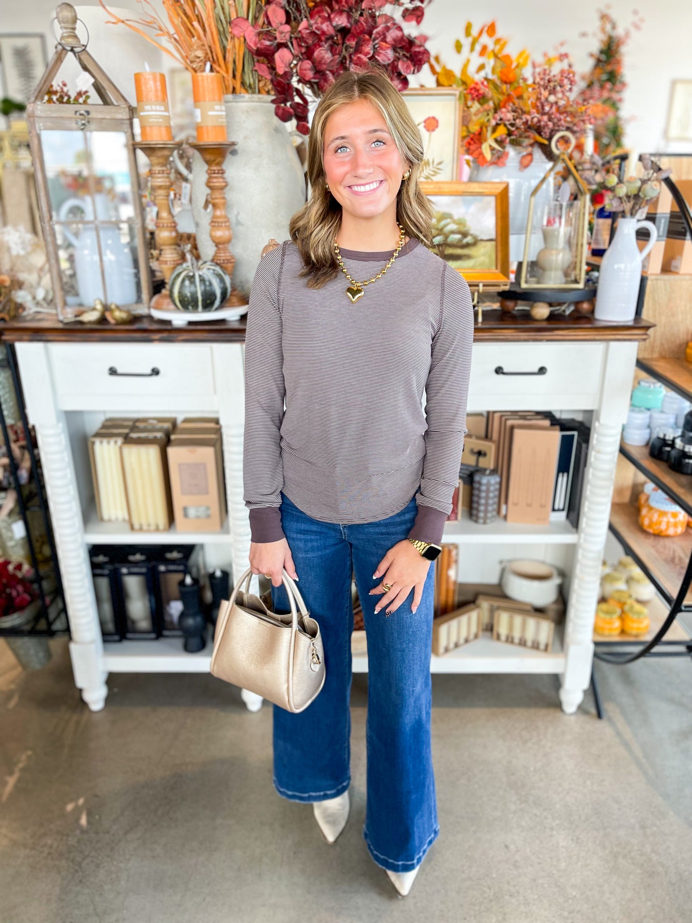 Cozy up in the Coffee Stripe Stacy Top, featuring a stunning dark brown hue with cream stripe details that’s perfect for fall vibes. This super soft long-sleeve layering essential flaunts a flattering scoop neck, making it your go-to for effortless style and warmth. Layer it up or wear it solo—either way, comfort and charm are guaranteed!