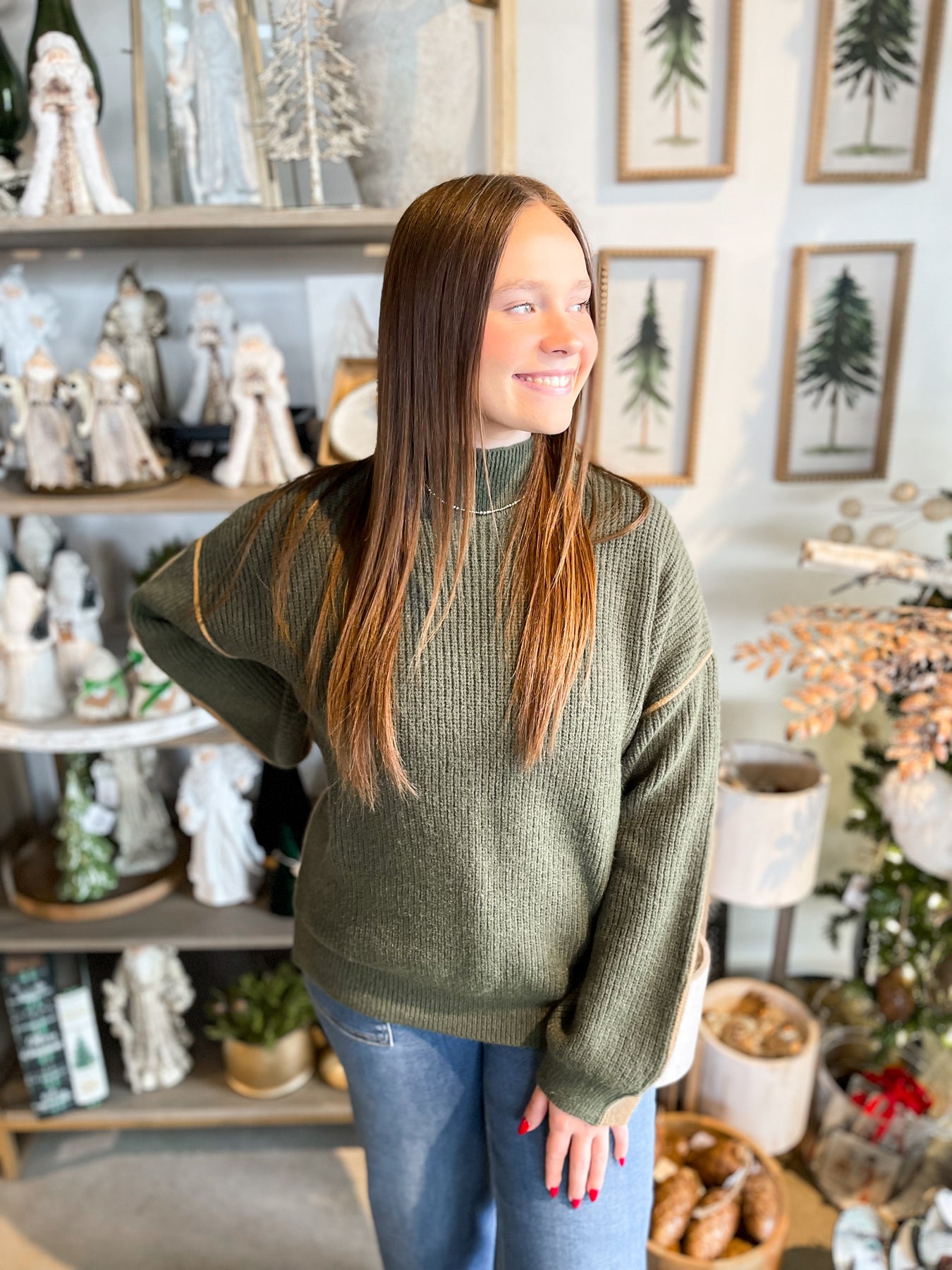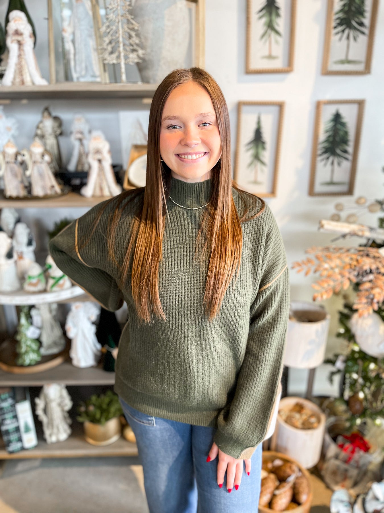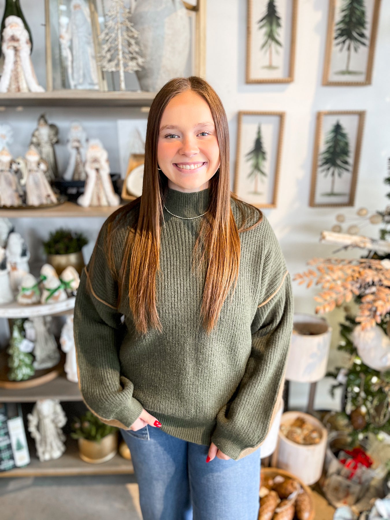 Stay cozy and cute in our Olive Mock Neck Sweater. The two-toned design and soft material add a playful touch to this must-have winter staple. Perfect for adding a touch of quirk to your wardrobe!