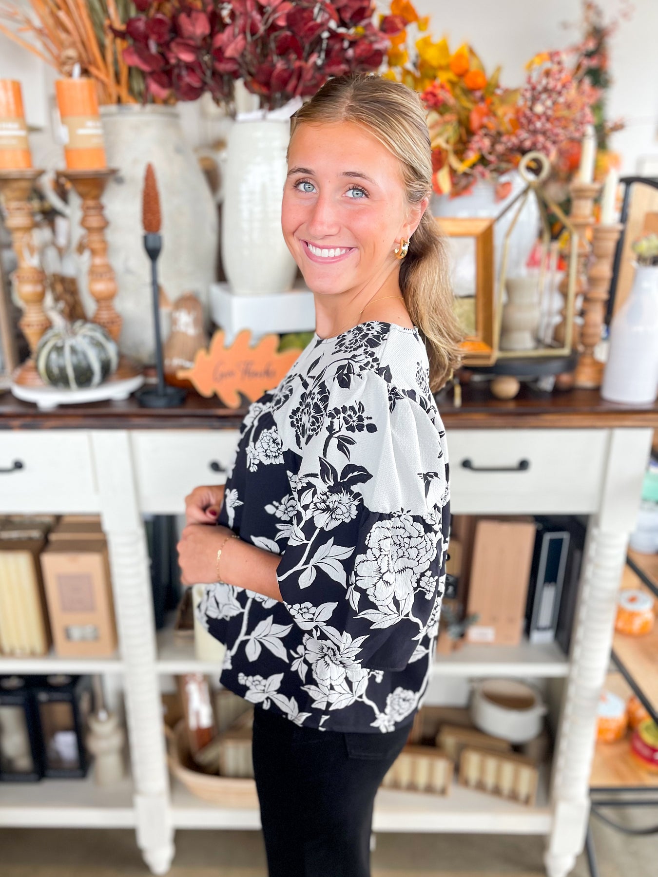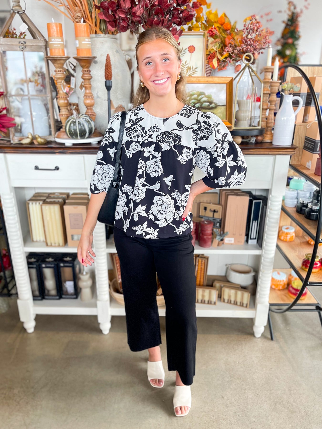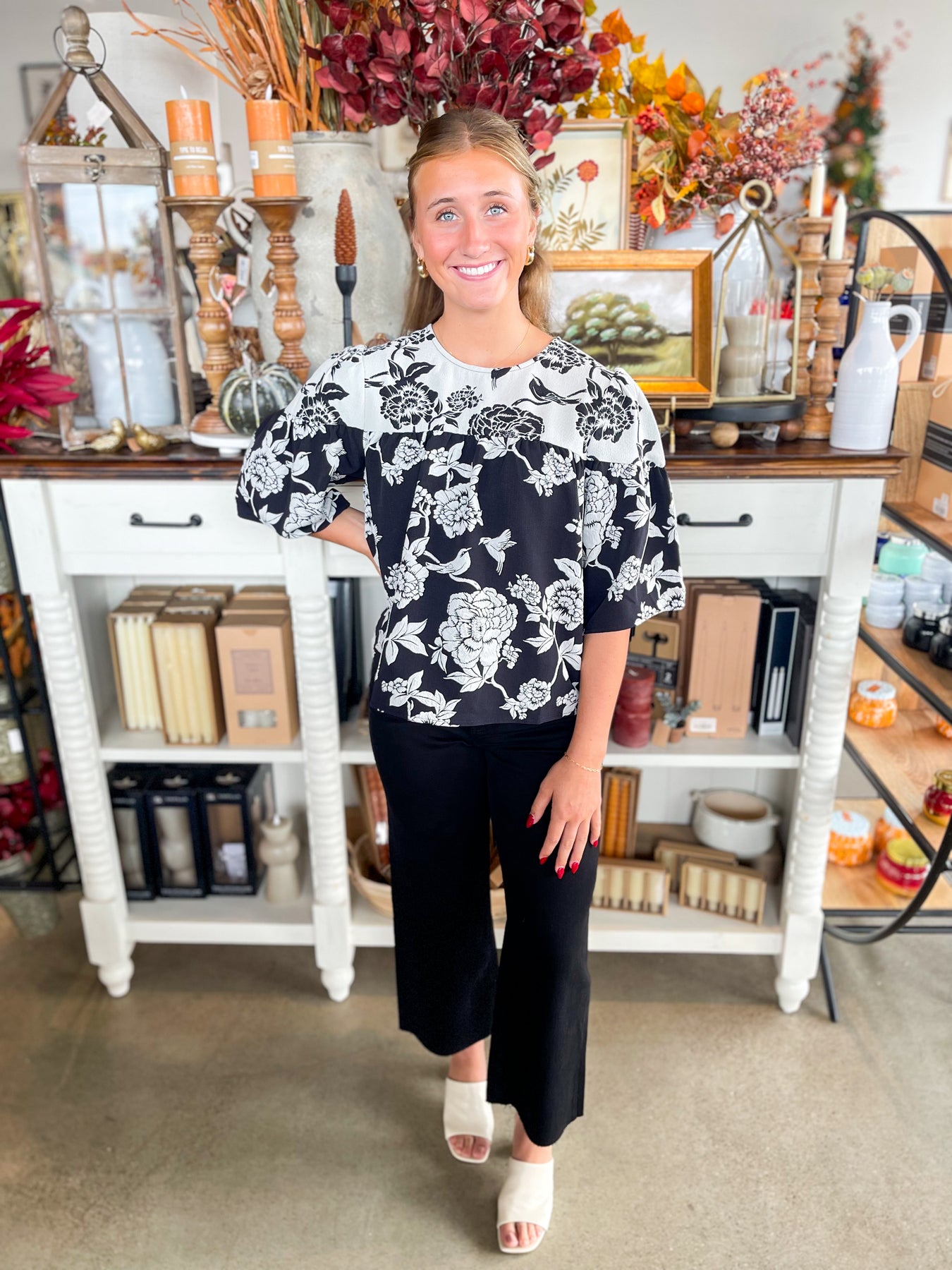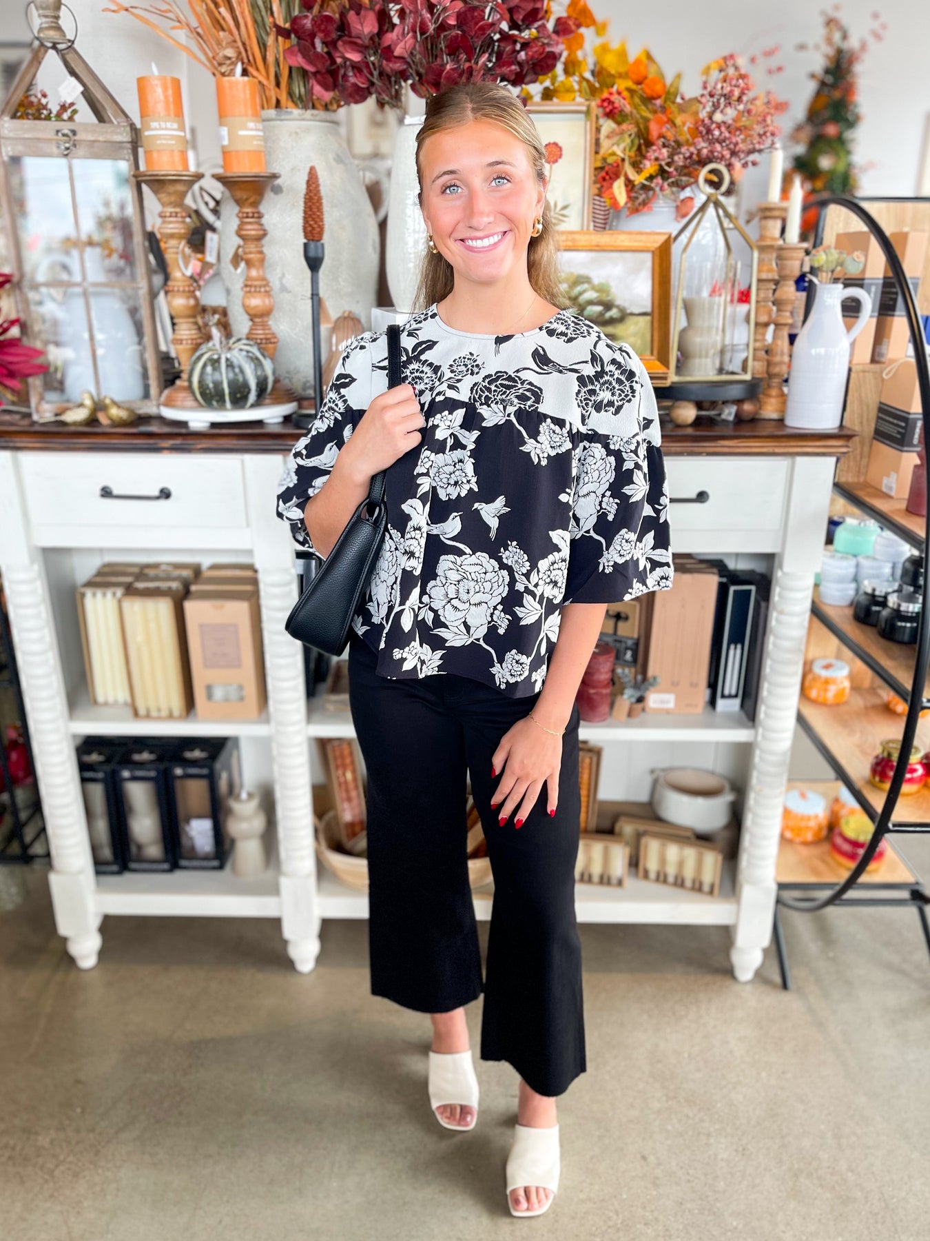 Embrace fall with the Voy Black Half Sleeve Top, a playful mix of black and white floral patterns in split tones. Its super soft, lightweight fabric and loose sleeves keep you comfortable, while the classic crew neck adds a timeless touch. Perfect for layering or wearing solo, this top brings effortless style to your seasonal wardrobe.