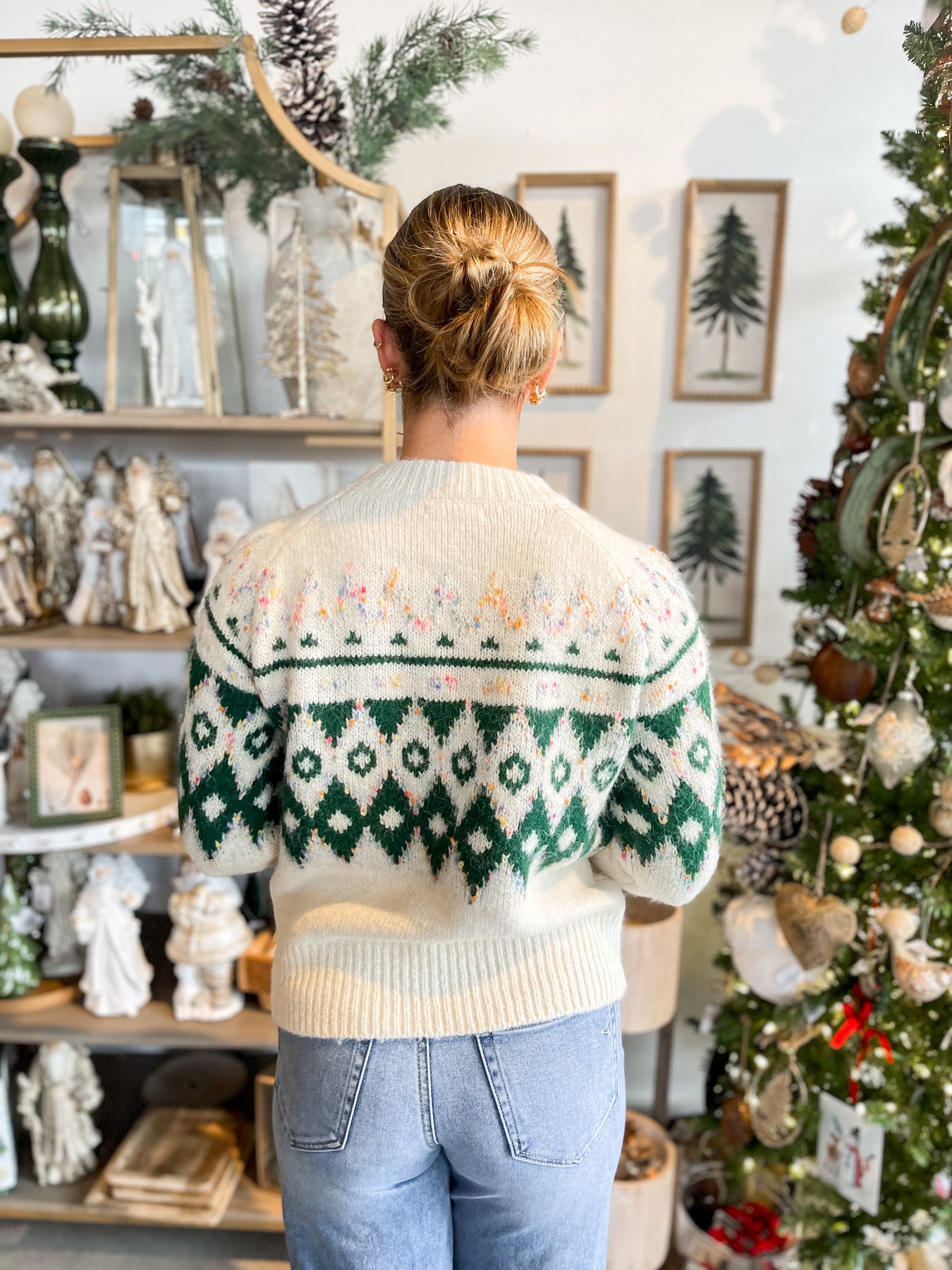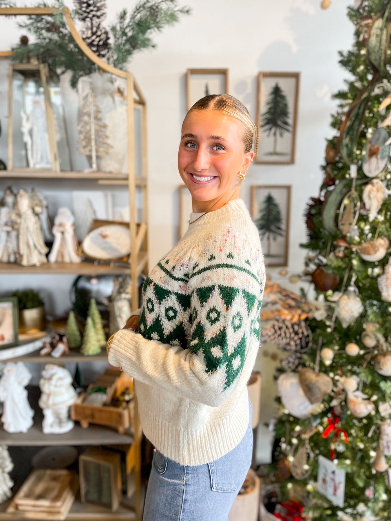 Cozy up in this Forest Fairisle Chunky Sweater, where cream and green hues dance together in a pretty print that's anything but boring. The slightly fitted silhouette flatters your frame while the chunky knit keeps things wonderfully warm. Those gorgeous pops of color make it the perfect piece to elevate your everyday look with trendy, stylish flair. Layer it, love it, live in it.