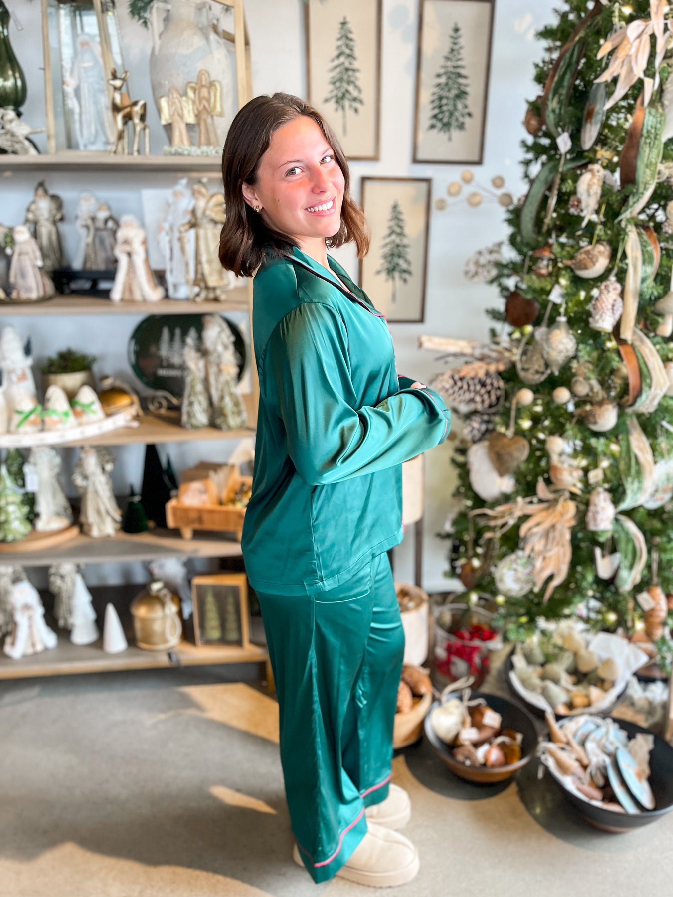 Slip into luxury with these super soft and sleek silk pajamas—the ultimate winter essential! Lined with gorgeous red satin for an extra touch of elegance, these trendy green pjs are designed for comfort and style. The wide-leg pants feature practical pockets and a comfortable elastic waistband, so you can lounge without sacrificing sophistication. Perfect for cozy nights during the holiday season or any time you want to feel pampered and put-together, these silk pajamas are your ticket to restful, fabulous sleep. Sweet dreams in style!