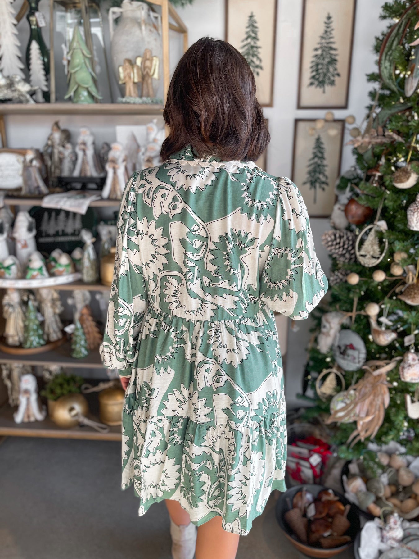 Step into fall with the Jodifl Saged Shelbie Dress, featuring a stunning light green and white floral print. Its playful ric rac collar adds a charming touch, while long sleeves and a flowy, soft fabric keep you cozy and comfortable. Perfect for embracing the season in style!