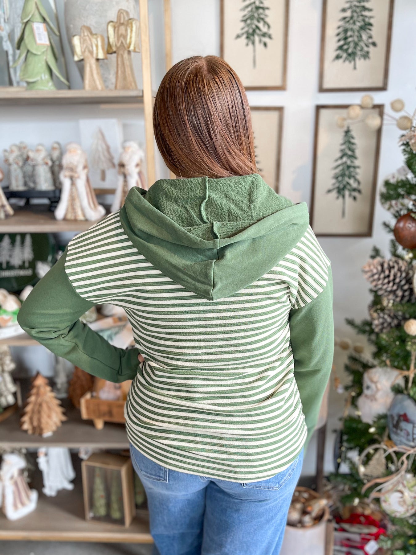 Say hello to your new casual favorite: the Olive Shannon Top w/ Hoodie. This adorable piece features charming green and cream stripes across the body paired with solid green long sleeves for a laid-back look that works. Warm wooden buttons add rustic charm, while the hoodie style keeps things cozy and fun. A front pocket is perfect for stashing essentials, and the relaxed fit makes it ideal for everything from coffee runs to campfire hangs. Whether you're layering through fall or bundling up in winter, this top brings effortless style and comfort to your seasonal rotation.