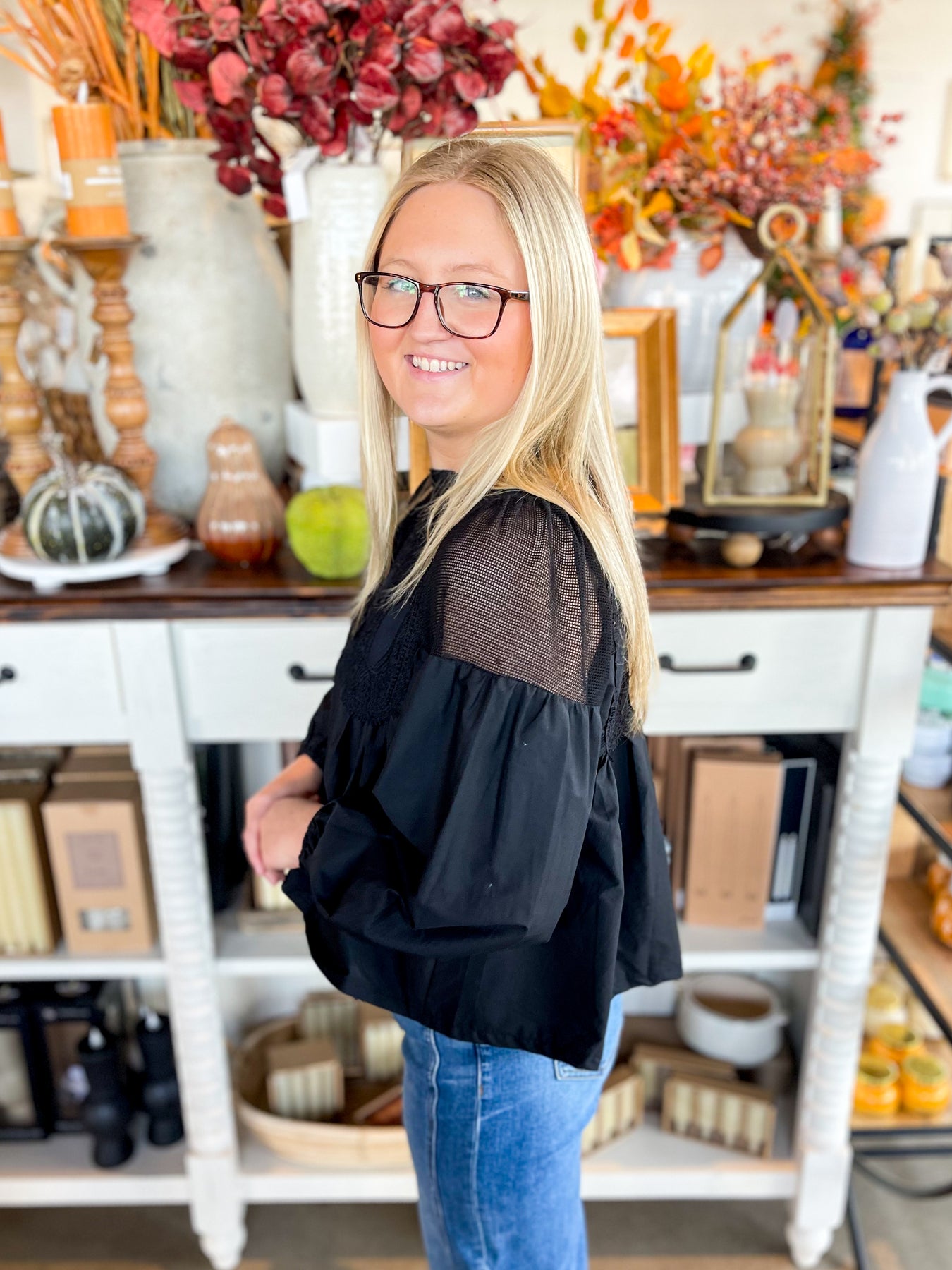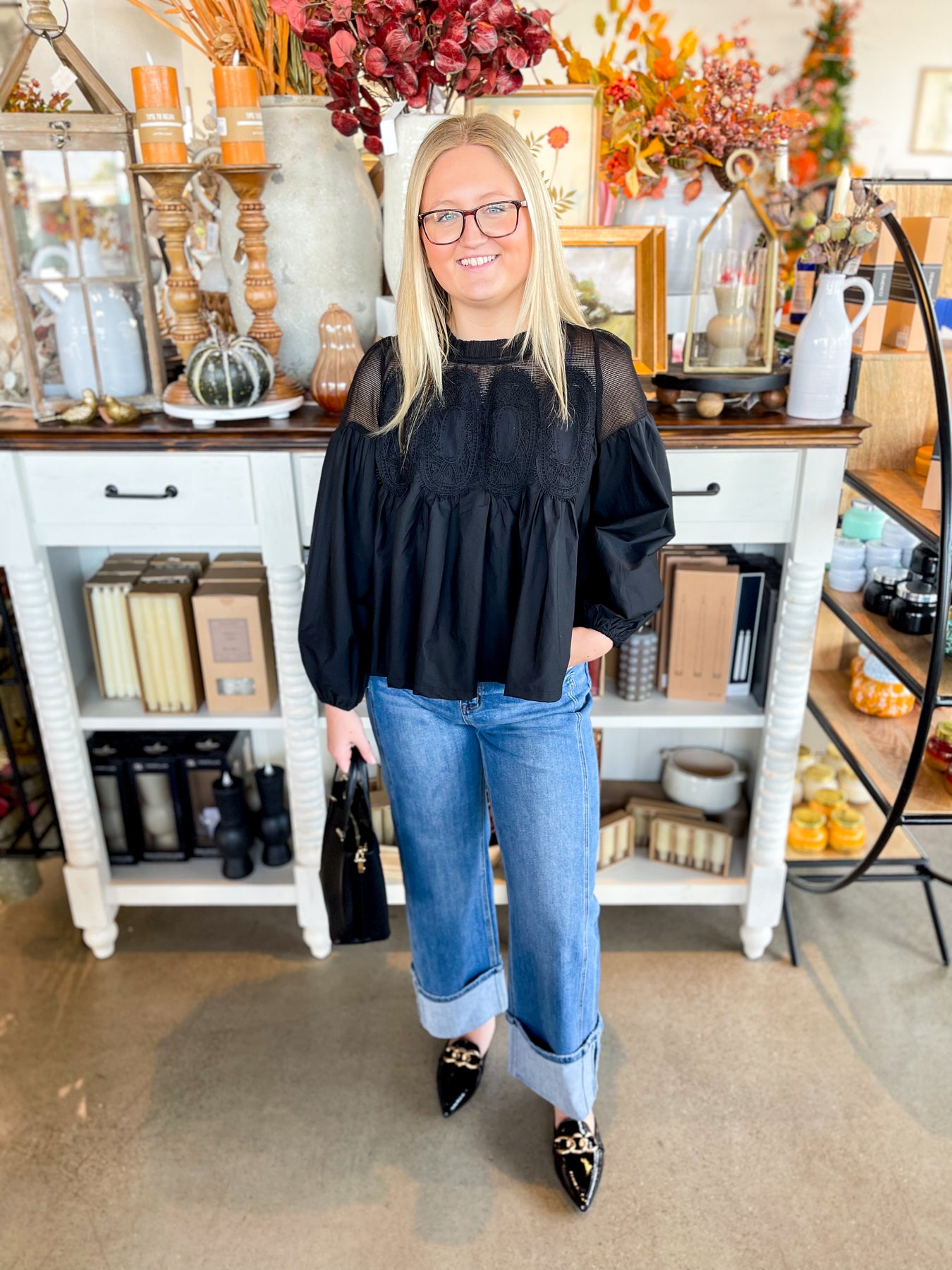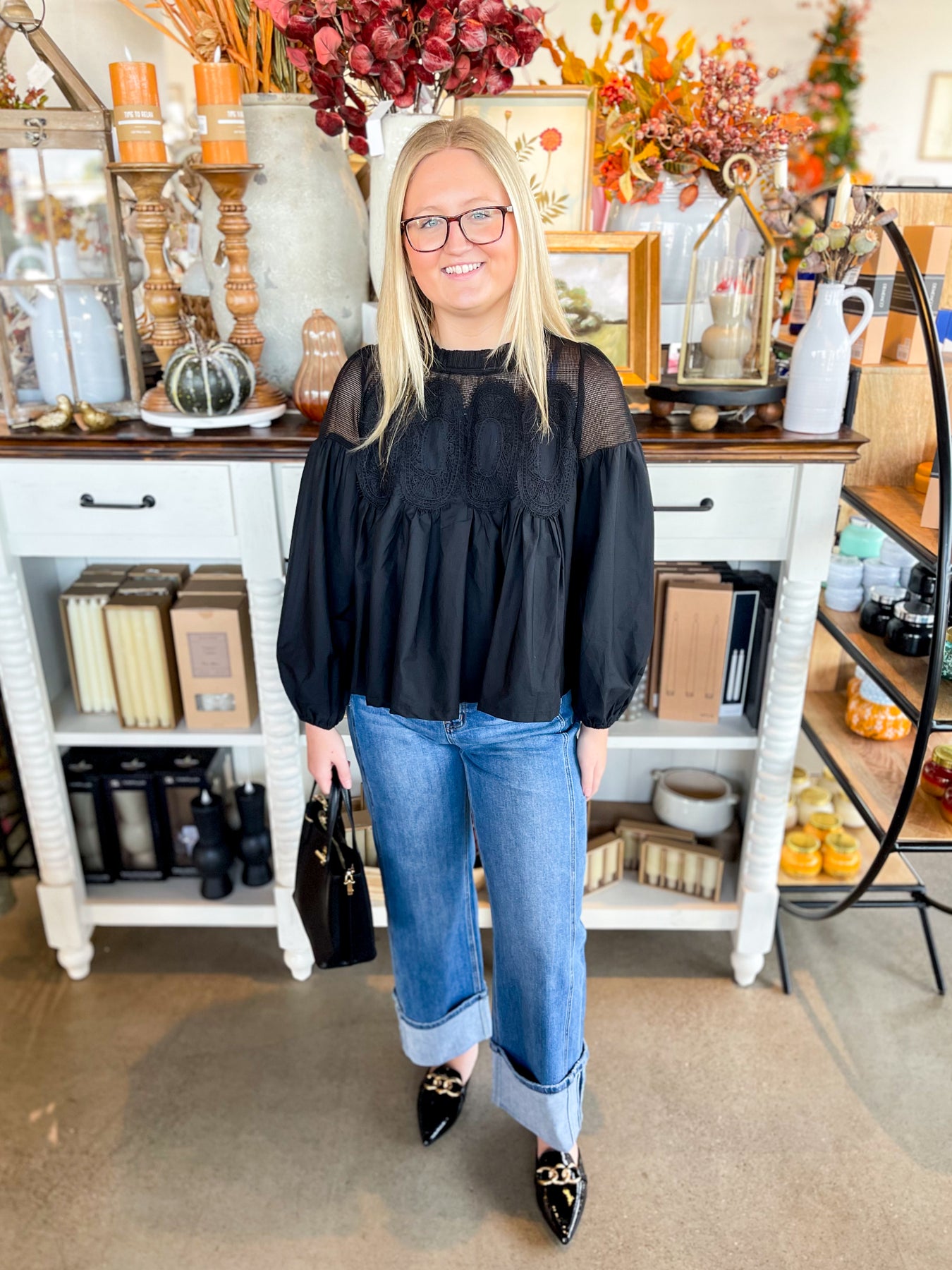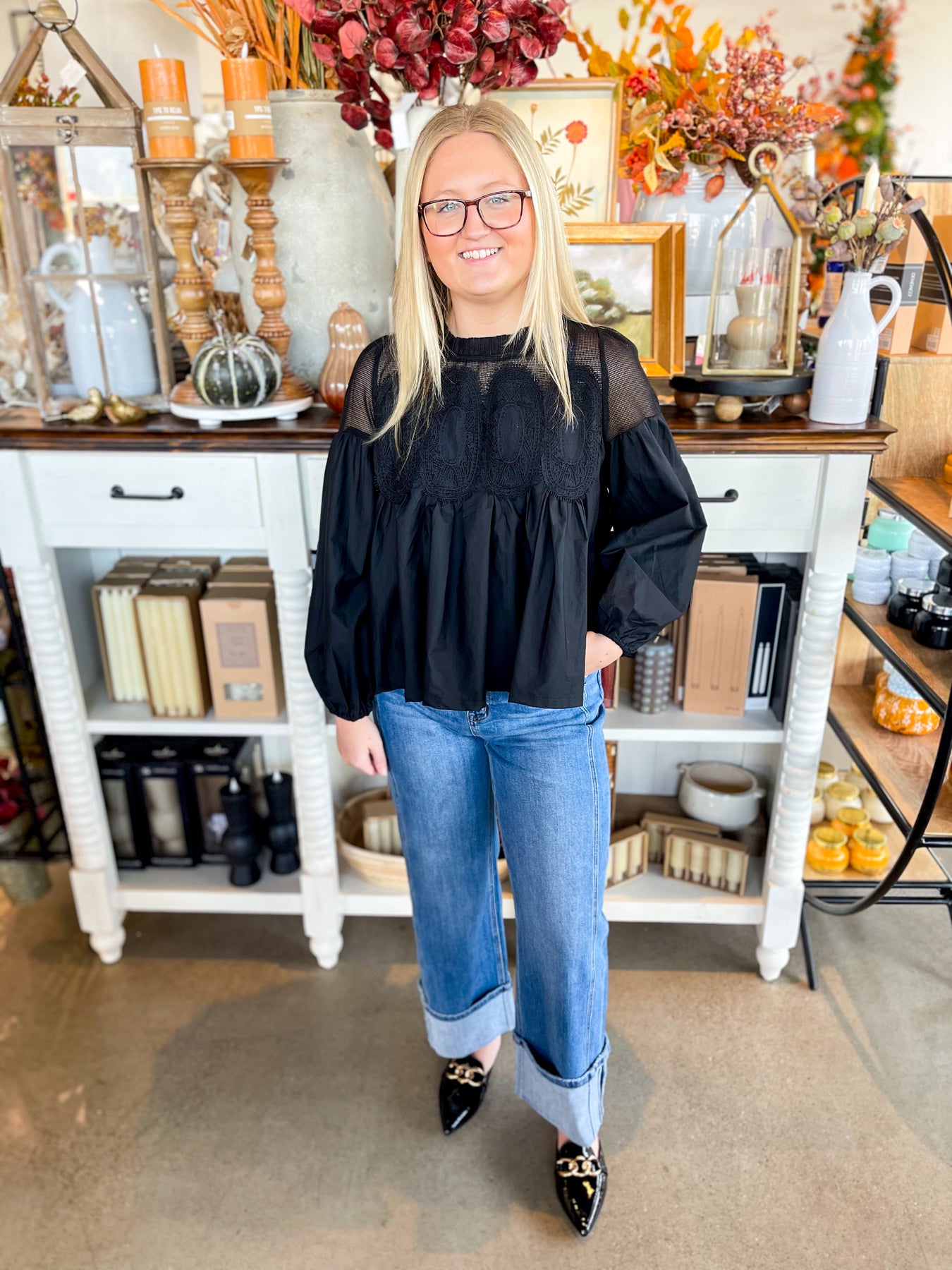 The Black Appliqué Cara Top is a stunning, flowy piece perfect for fall. Featuring trendy mesh details on the neckline and delicate lace print at the bust, this long-sleeve top adds a playful touch to your wardrobe while keeping you comfortable and stylish.