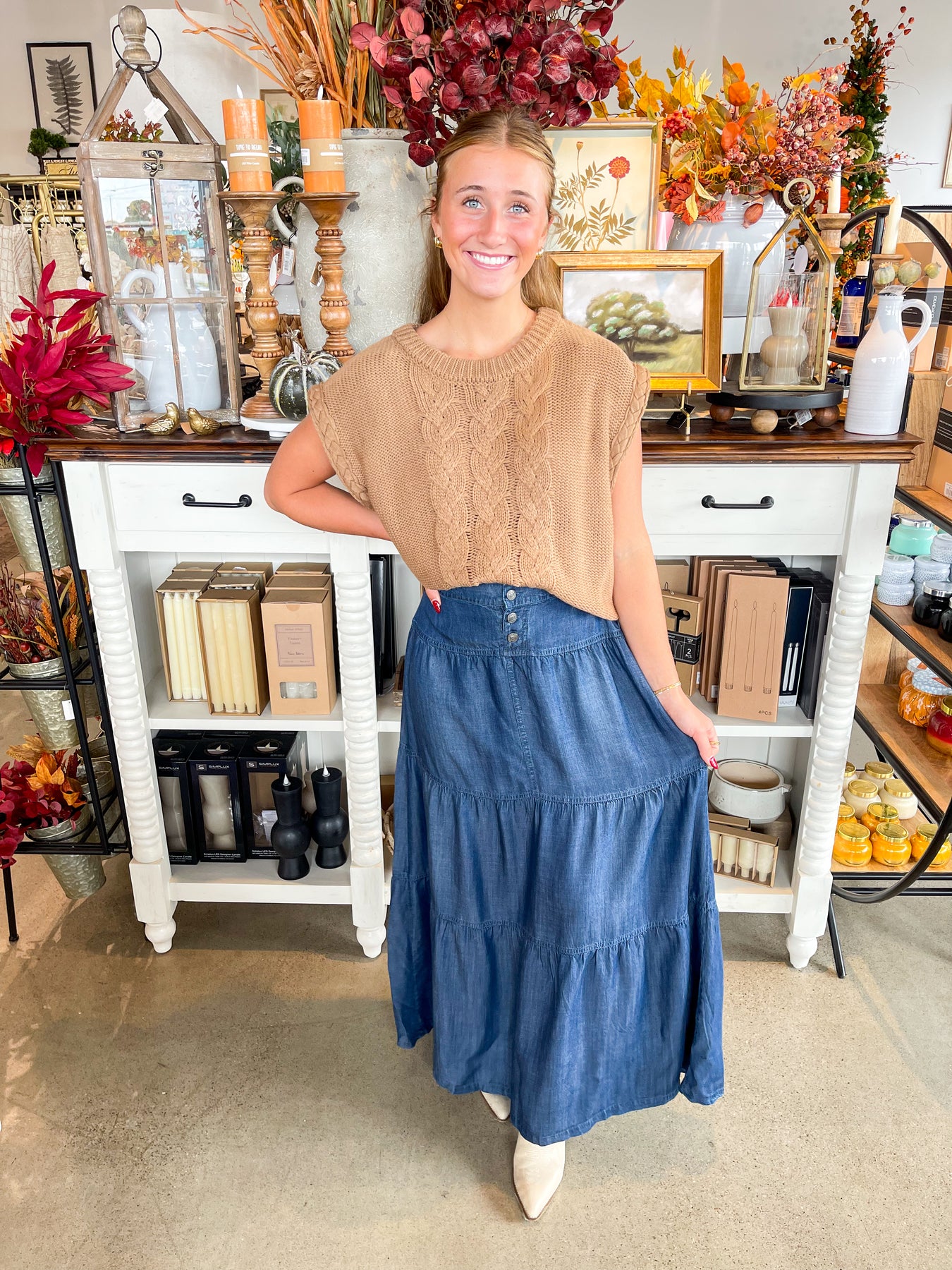Step into fall with the Denim Wash Montie Skirt, a playful maxi-length piece in a stunning dark blue wash. Featuring a trendy tiered style, three front buttons, and a comfy smocked waist in the back, this lightweight skirt offers effortless style without the bulk of pockets—perfect for breezy autumn days.
