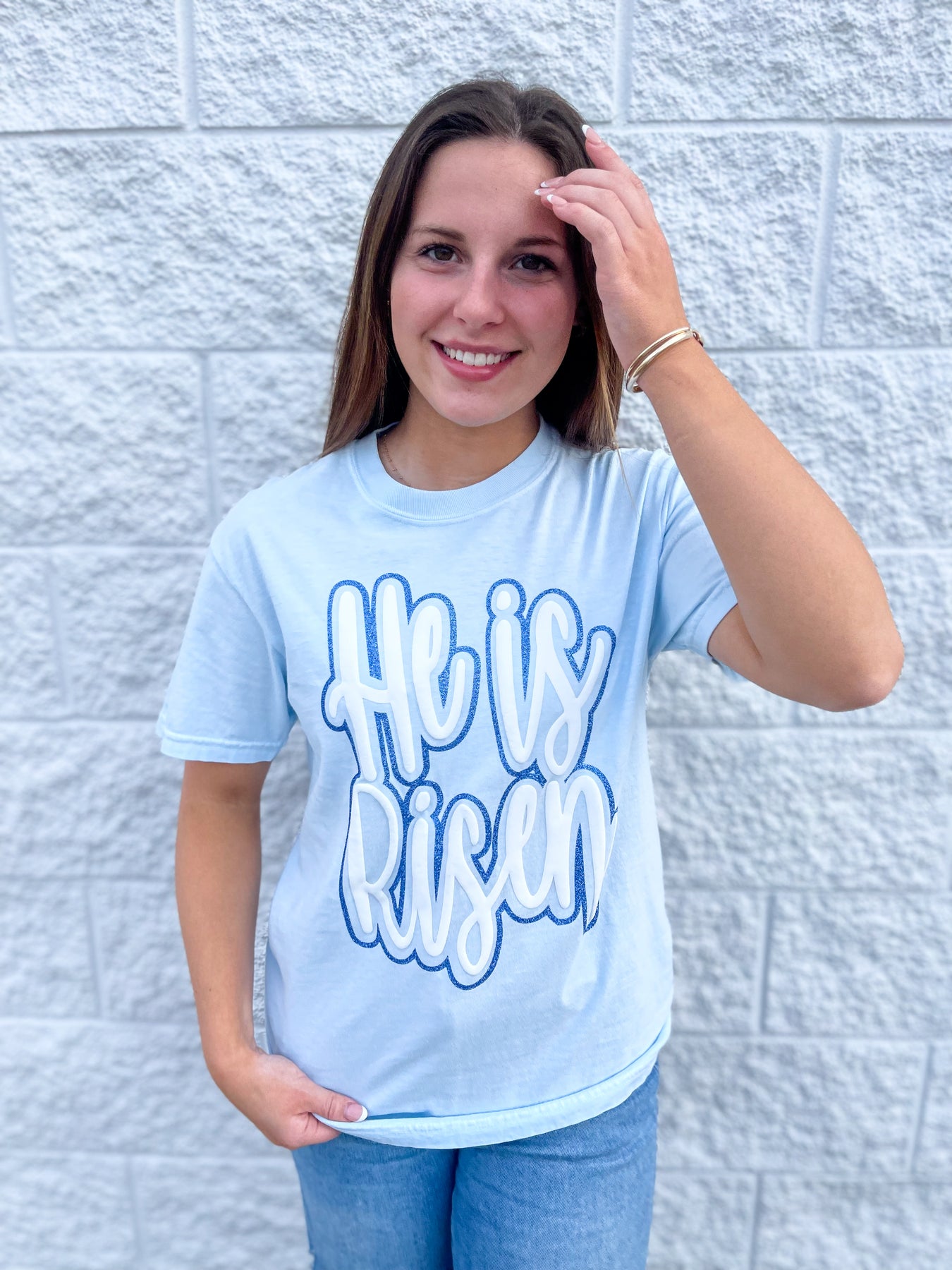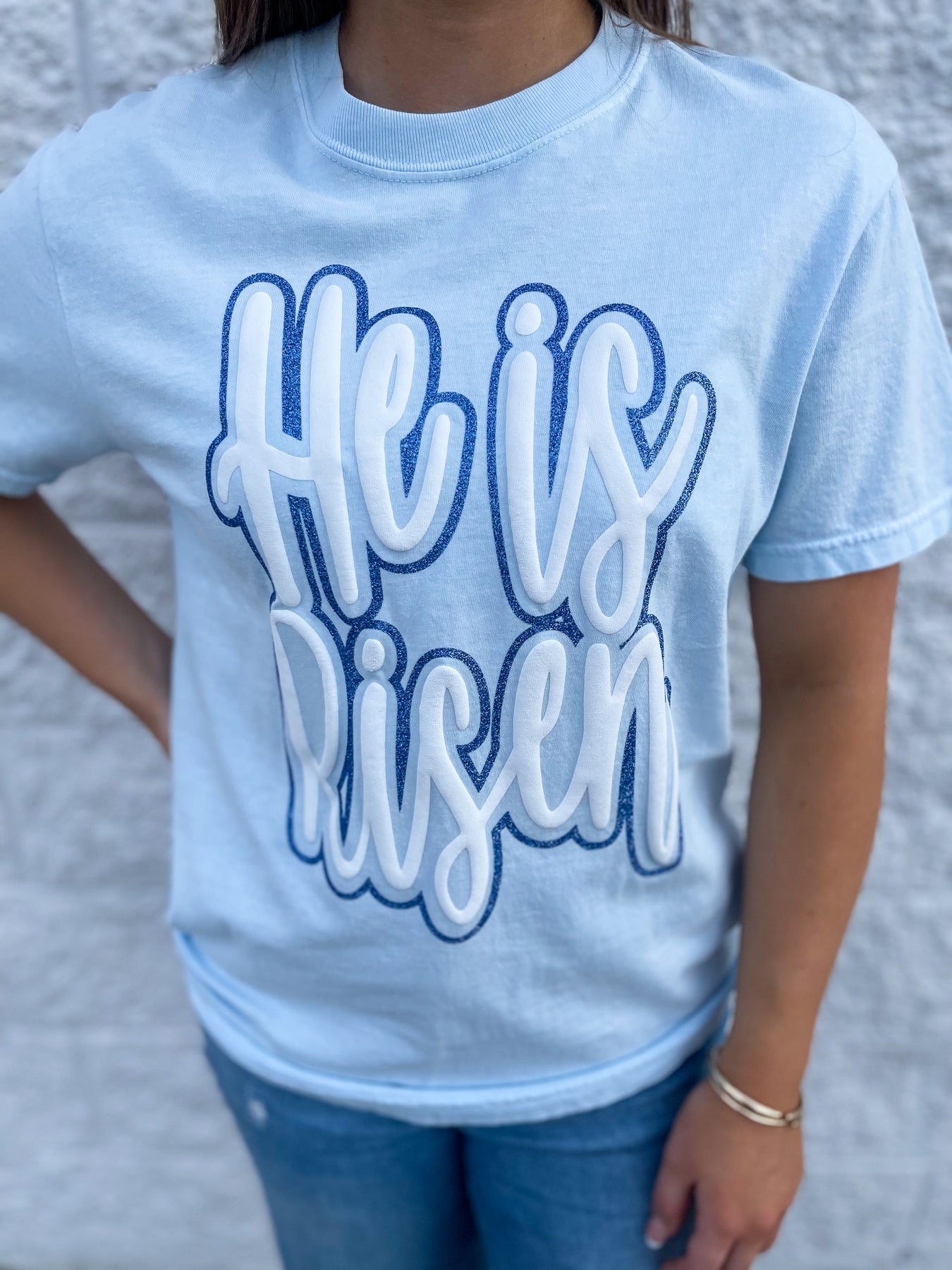 This Heidi He is Risen Tee Shirt is a perfect addition to your Easter wardrobe. With a glitter outline, this tee is cute and stylish. Let everyone know the true meaning of Easter with this He is risen tee.