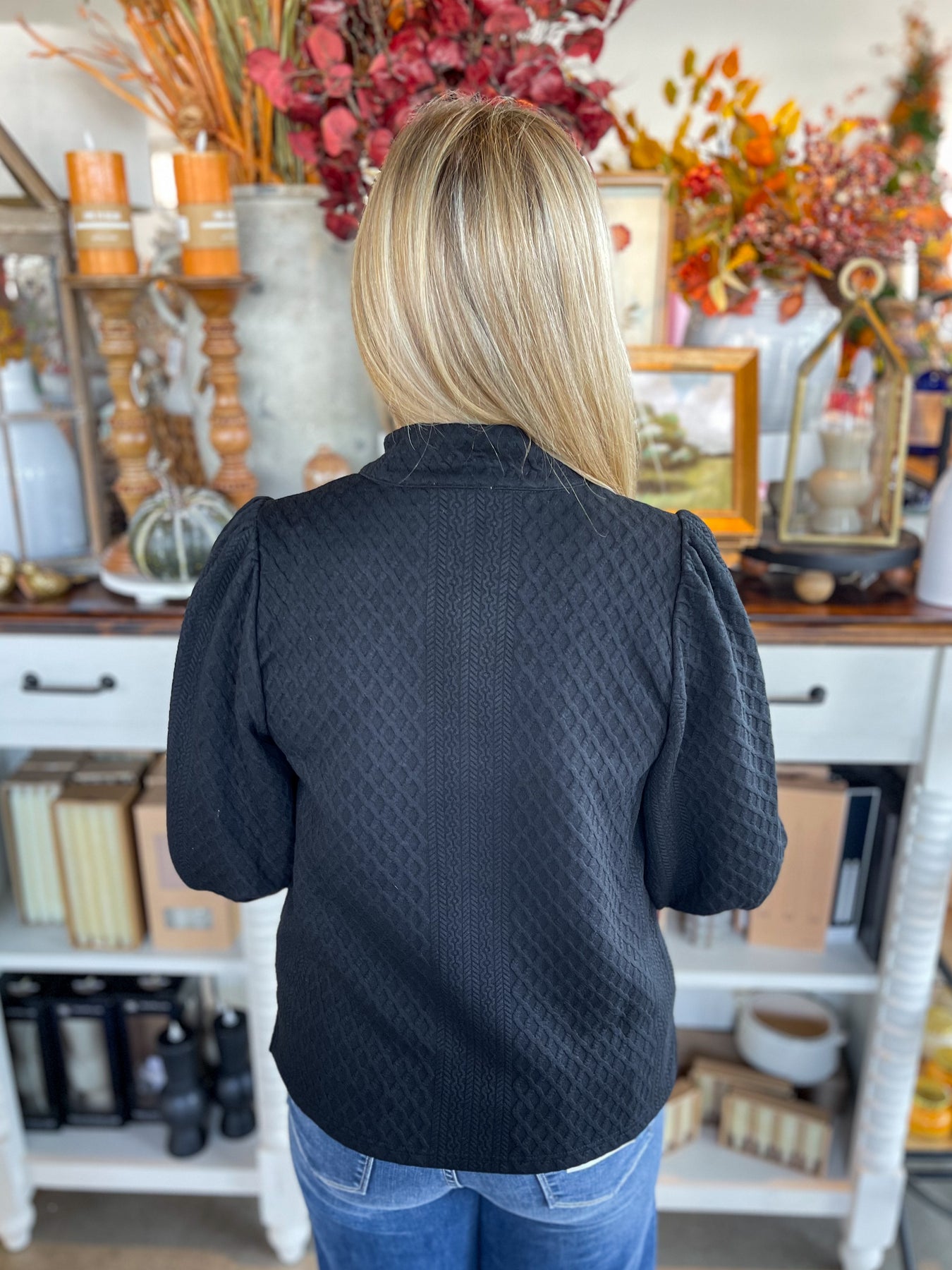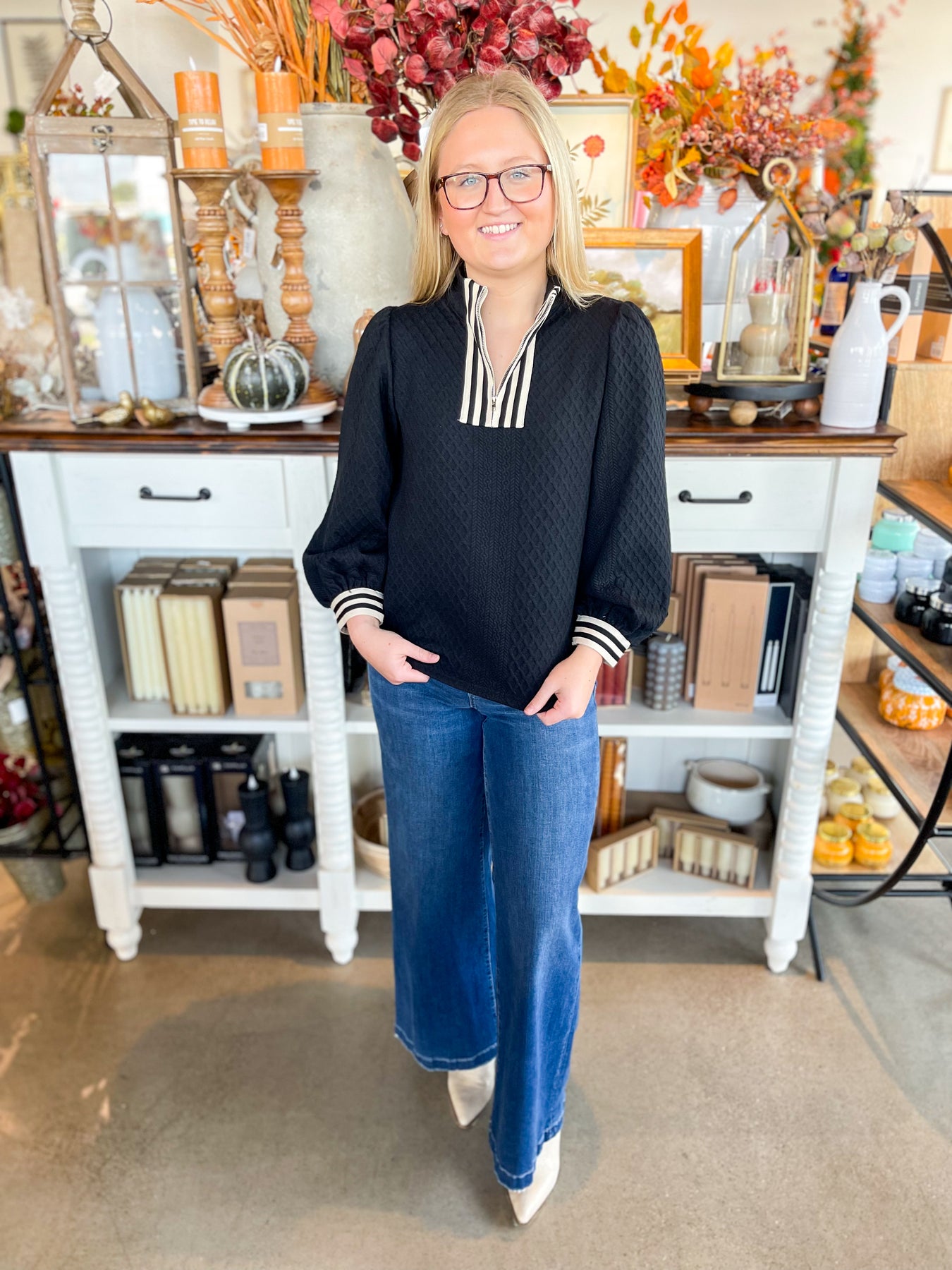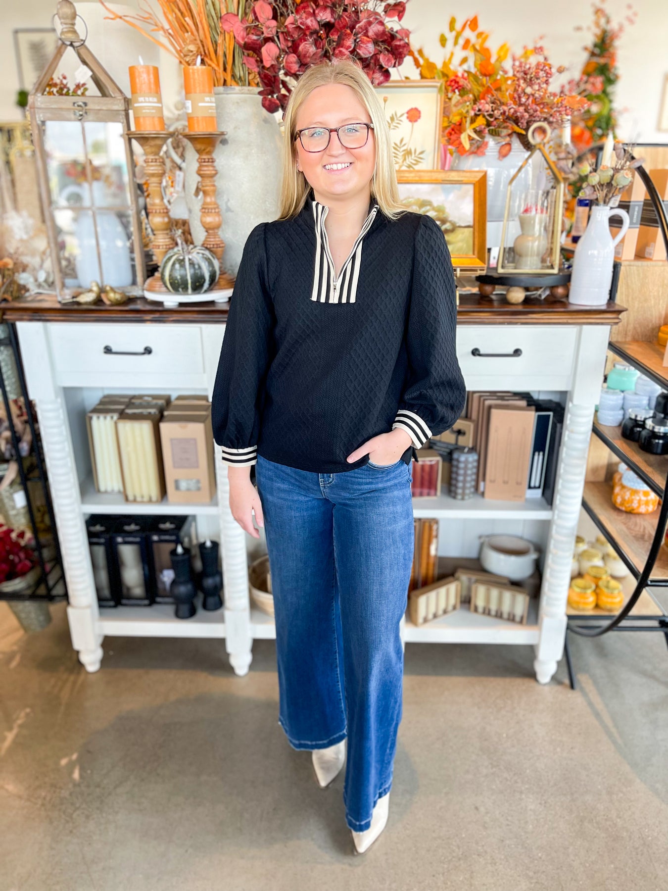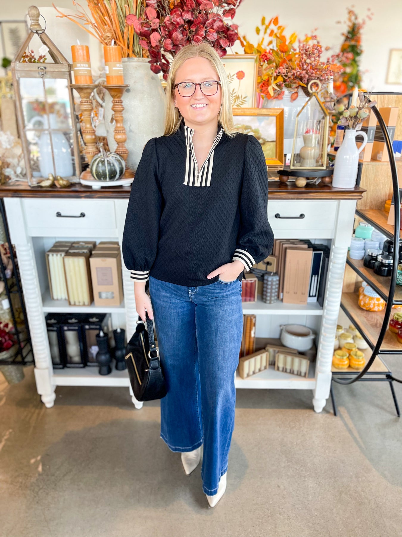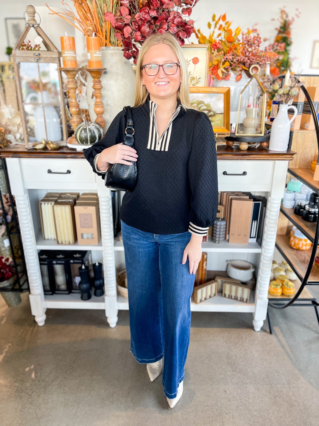 Elevate your fall wardrobe with the Jodifl Black MartyTop—a playful, textured top designed for effortless layering. Stylish black and taupe details on the collar and sleeve hems add a trendy touch, while slip side accents and a quarter zip neckline keep things cool and comfortable. Perfect for crisp days, this top blends cozy vibes with chic flair.
