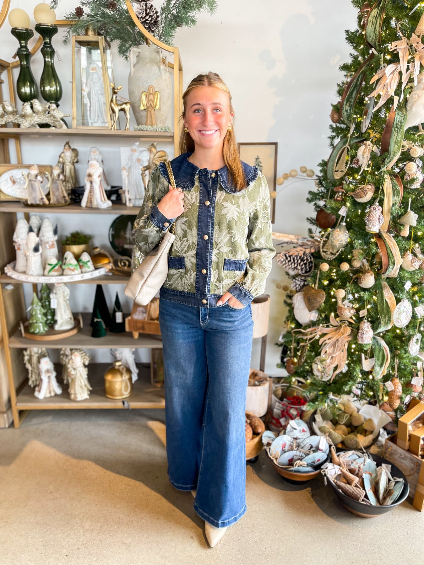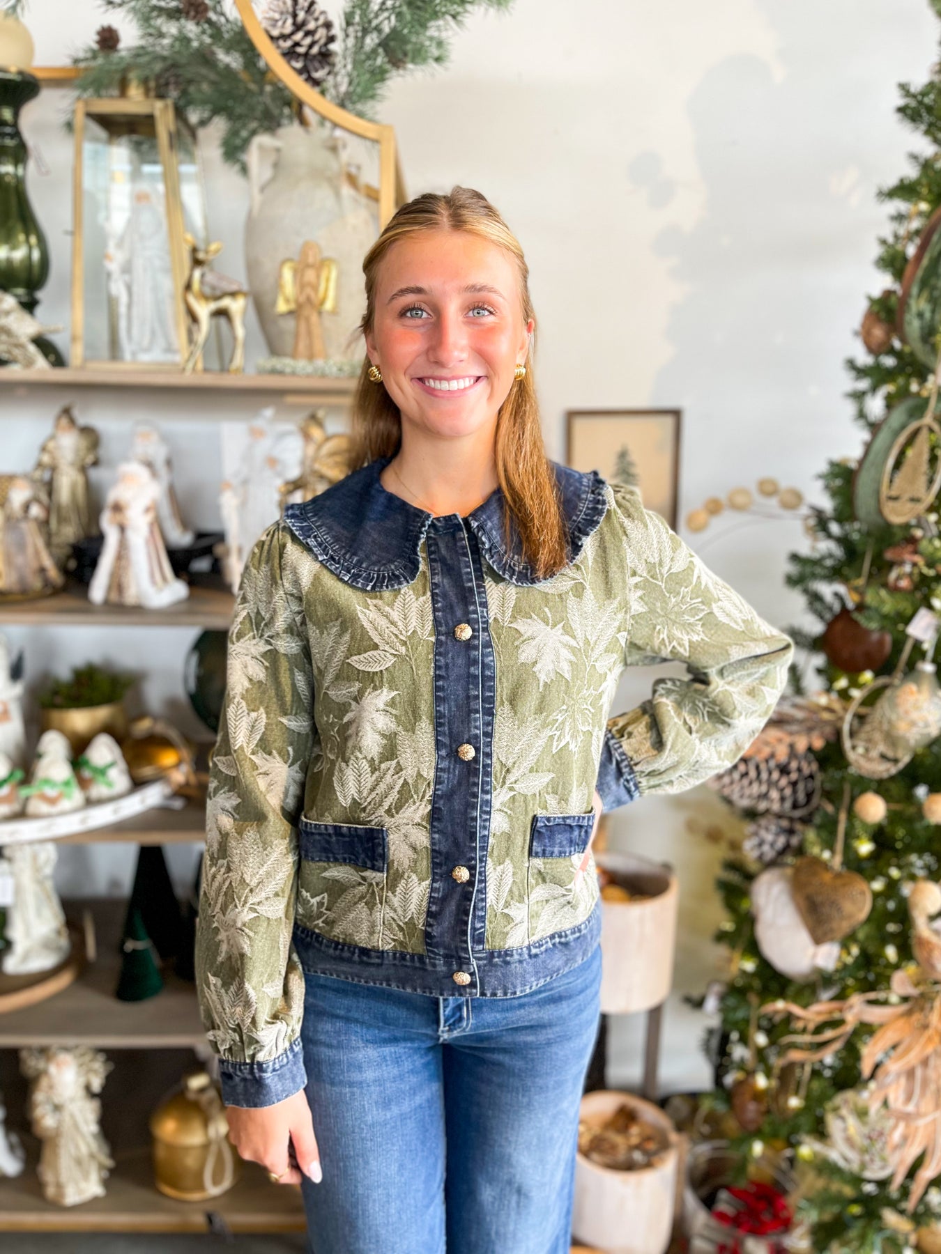 Step out in style with the Jodifl Olive Carson Jacket! This stunning twill jacket features eye-catching green and cream floral embroidery, complemented by denim color accents. Gold button closures add a chic touch down the front, while the Peterman collar and functional pockets bring both flair and practicality. Perfect for cozy fall and winter days, this jacket keeps you trendy and warm with a playful vibe.