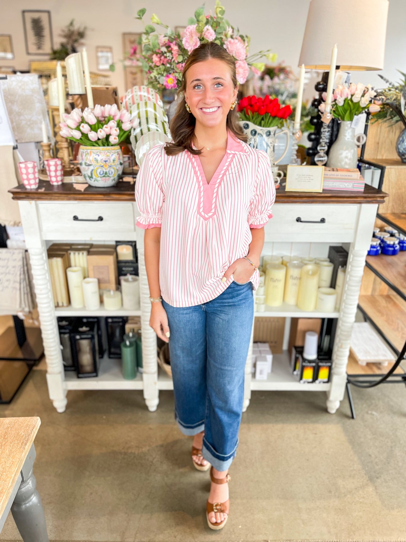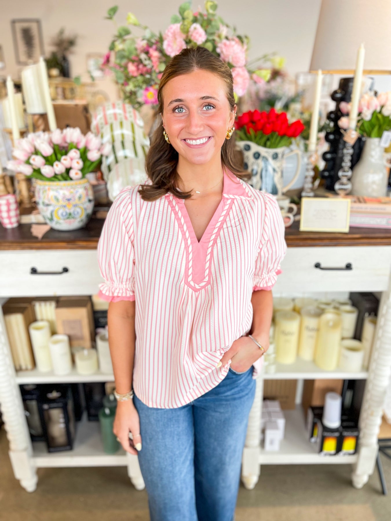 Elevate your seasonal wardrobe with this stunning Pink and white striped top. Featuring charming puff sleeves and a flattering V-neckline accented with a delicate collar detail, this piece effortlessly transitions from casual days to weekend outings. The crisp stripe pattern and thoughtful design elements make it an instant favorite for spring and summer styling. Versatile, feminine, and undeniably chic.