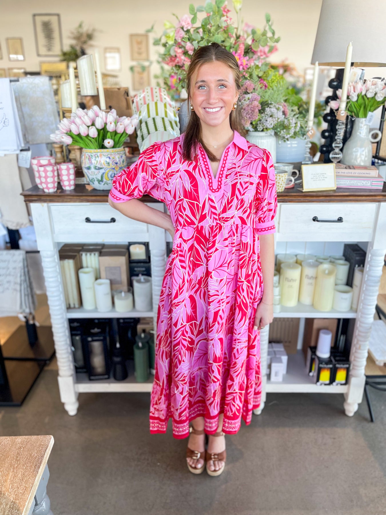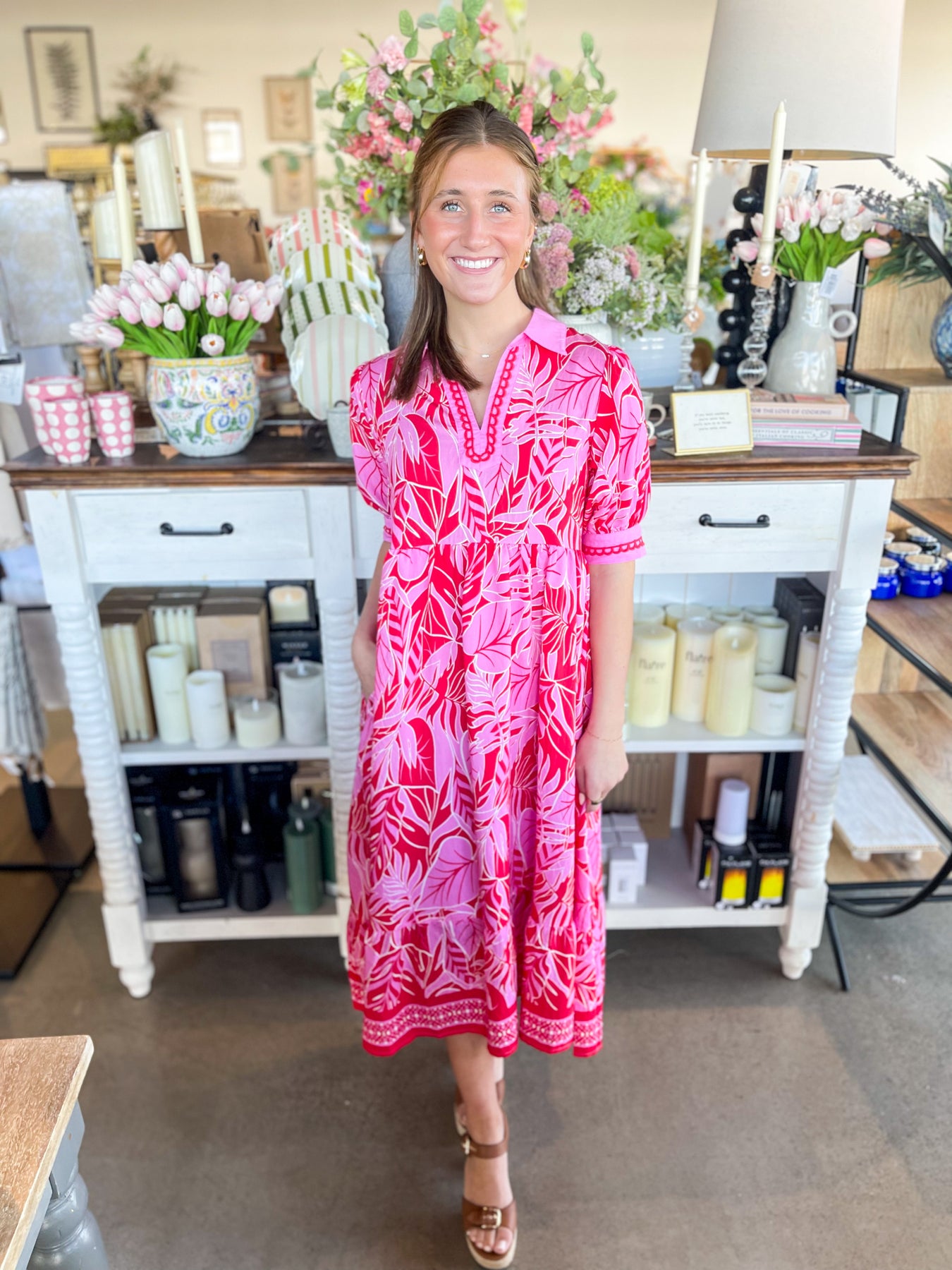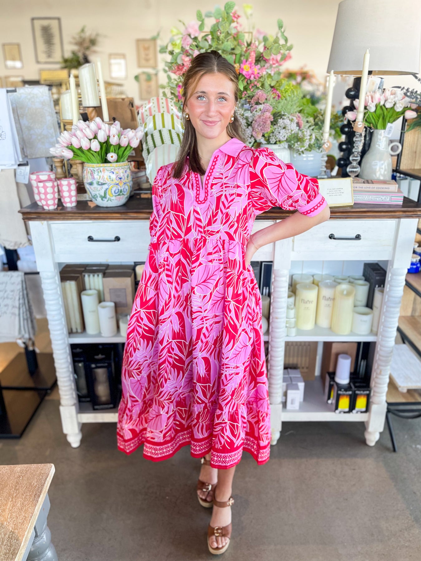 Elevate your warm-weather wardrobe with this stunning red and pink floral midi dress. Designed for effortless style, it features a flattering V-neckline, short sleeves, and charming collar detail that adds visual interest. The lightweight fabric keeps you cool and comfortable whether you're lounging by the pool or exploring a new destination. Perfect for vacation getaways and summer adventures, this trendy piece transitions seamlessly from day to night.