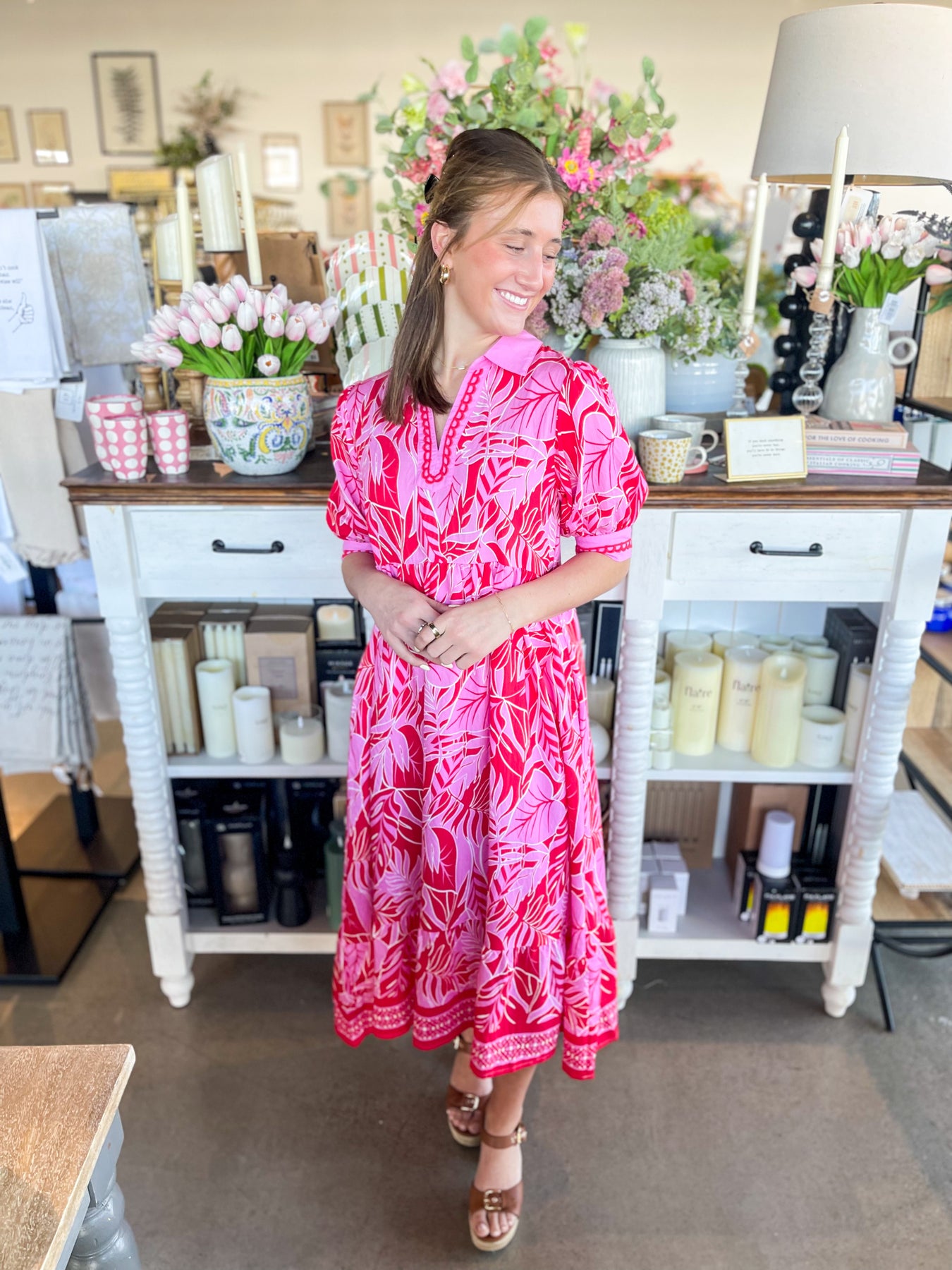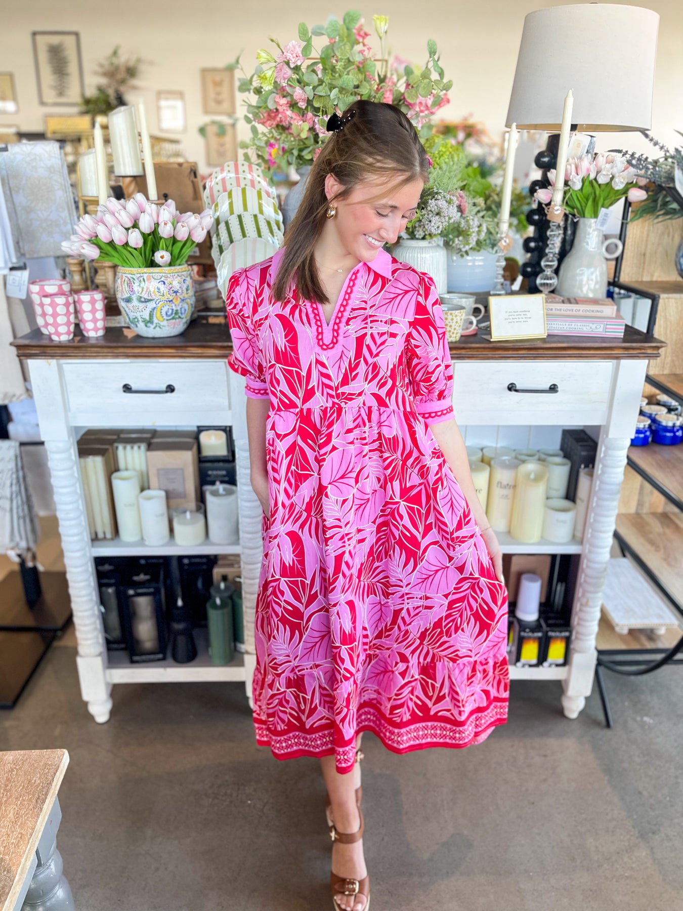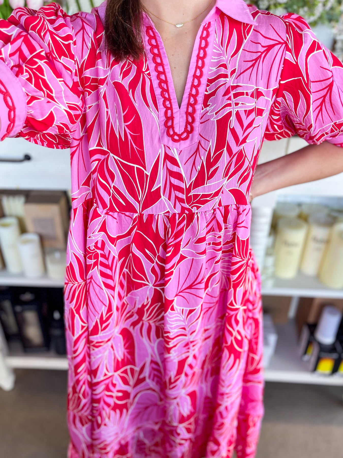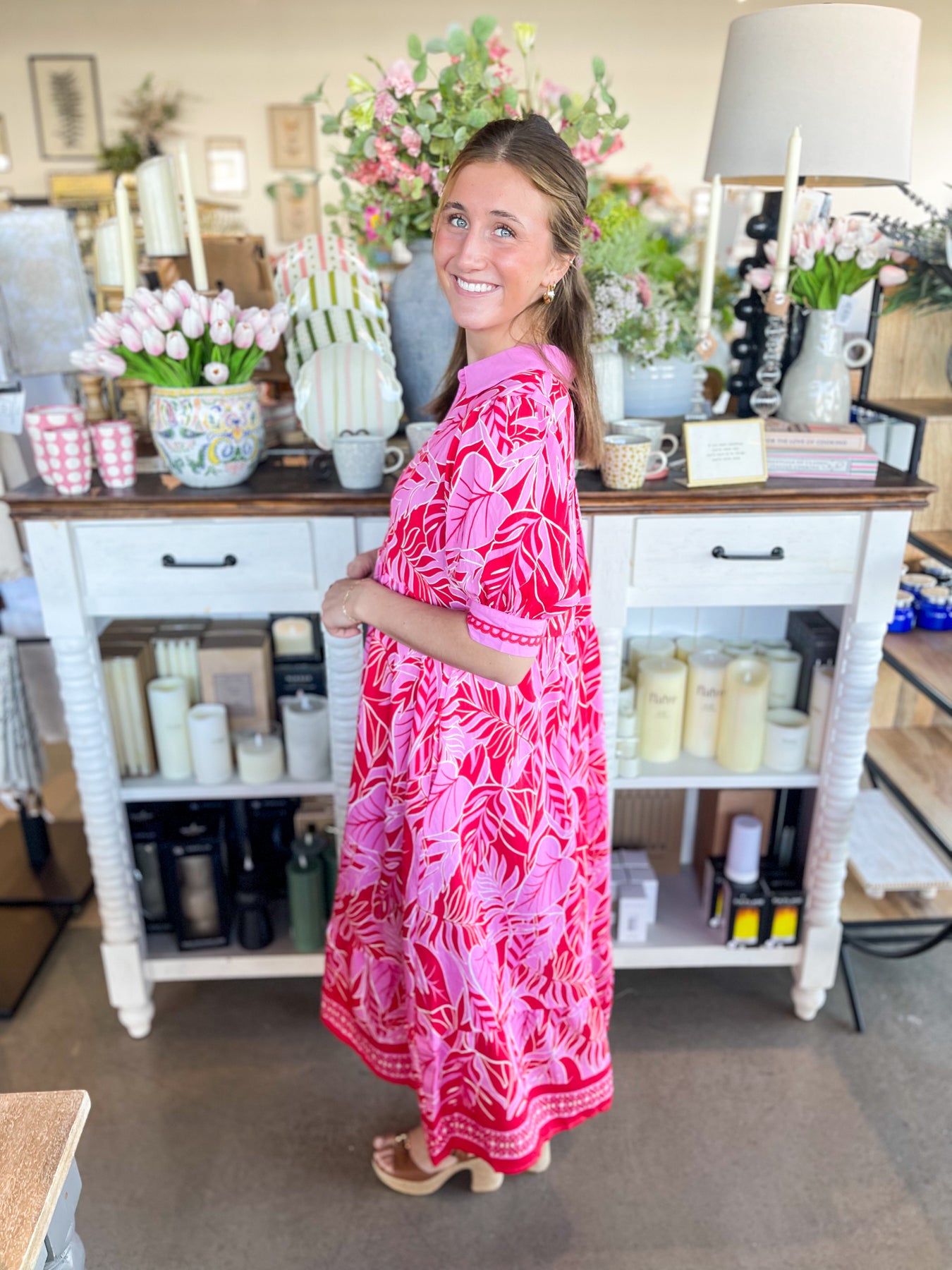 Elevate your warm-weather wardrobe with this stunning red and pink floral midi dress. Designed for effortless style, it features a flattering V-neckline, short sleeves, and charming collar detail that adds visual interest. The lightweight fabric keeps you cool and comfortable whether you're lounging by the pool or exploring a new destination. Perfect for vacation getaways and summer adventures, this trendy piece transitions seamlessly from day to night.