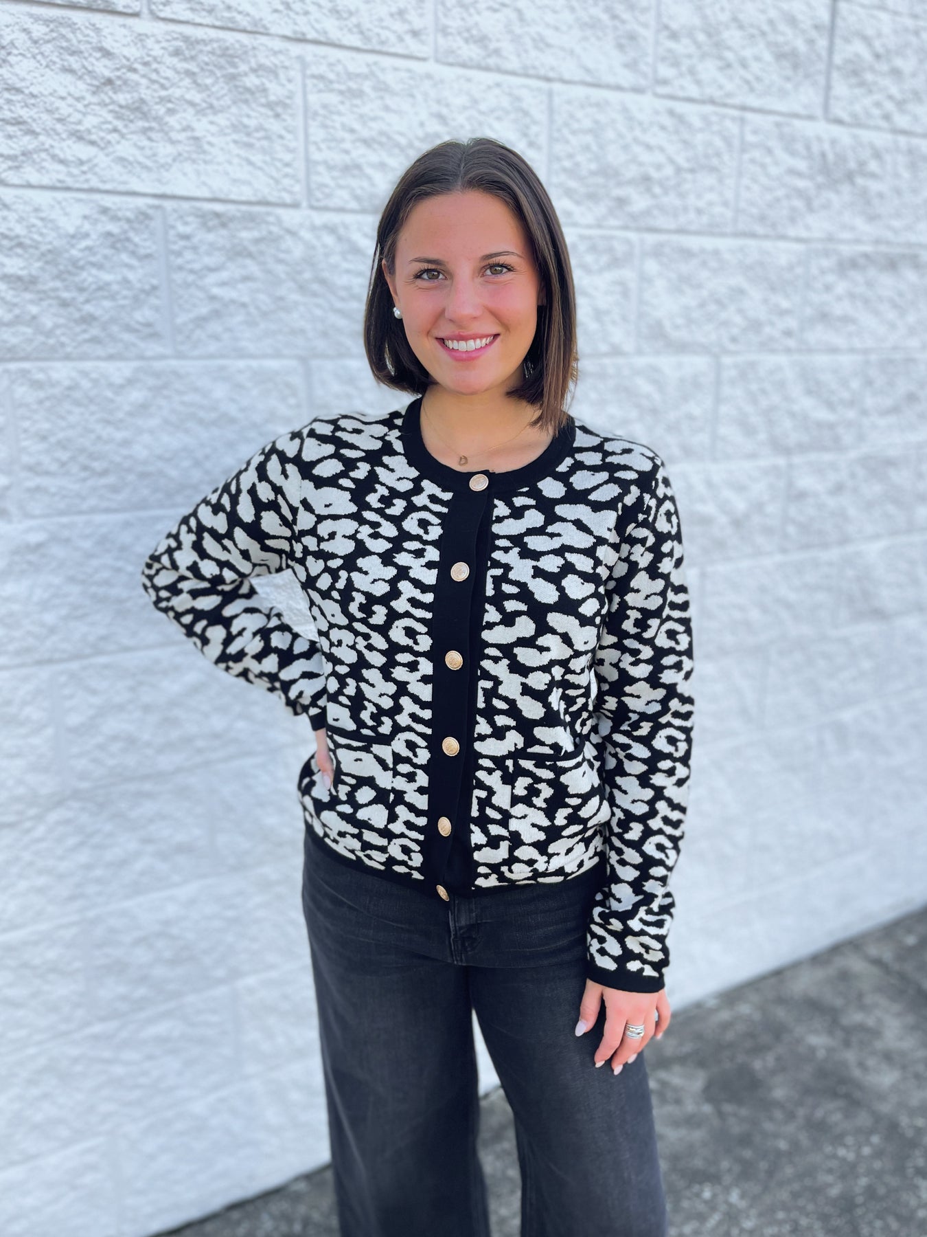 Add a playful edge to your fall wardrobe with this stunning black and taupe animal print cardigan. Lightweight and trendy, it features chic gold buttons that make it the perfect layering piece for cozy, stylish days.