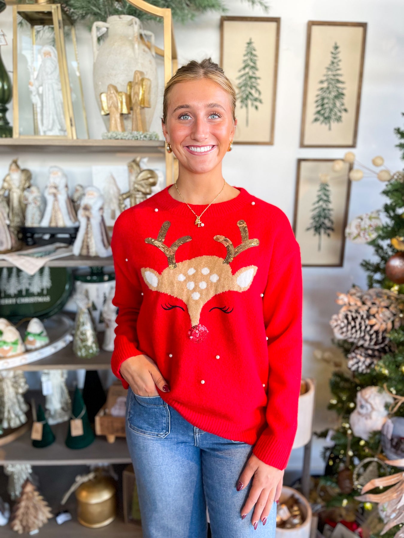 Meet your new holiday obsession—a stunning red sweater that's equal parts festive and fabulous. Soft knit material showcases an embroidered reindeer accented with delicate pearl embellishments that catch the light beautifully. The slightly oversized silhouette pairs perfectly with long sleeves and a cozy crew neck for that effortless, comfortable vibe. Layer it, style it solo, or wear it to every holiday gathering on your calendar. This sweater brings just the right amount of sparkle and cheer to make your season merry and bright.