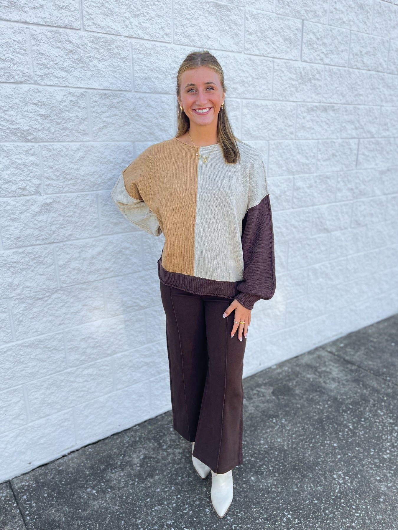 Embrace fall vibes with the Brown Sugar Color Block Sweater, featuring cozy oversized fit and a playful scoop neck. Its stunning knit boasts color blocking in taupe, camel, dark brown, and cream, making it the perfect statement piece to keep you warm and stylish all season long.