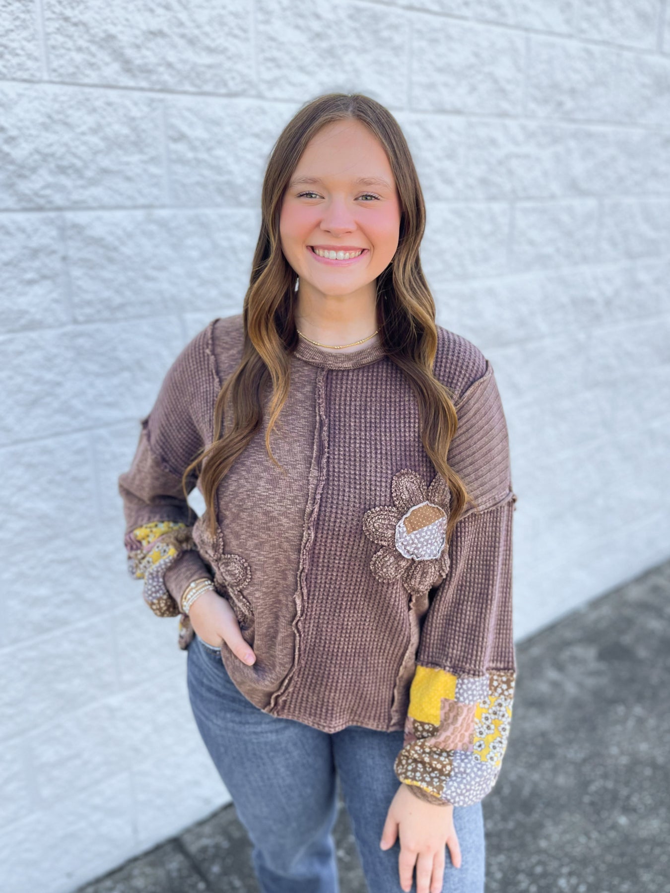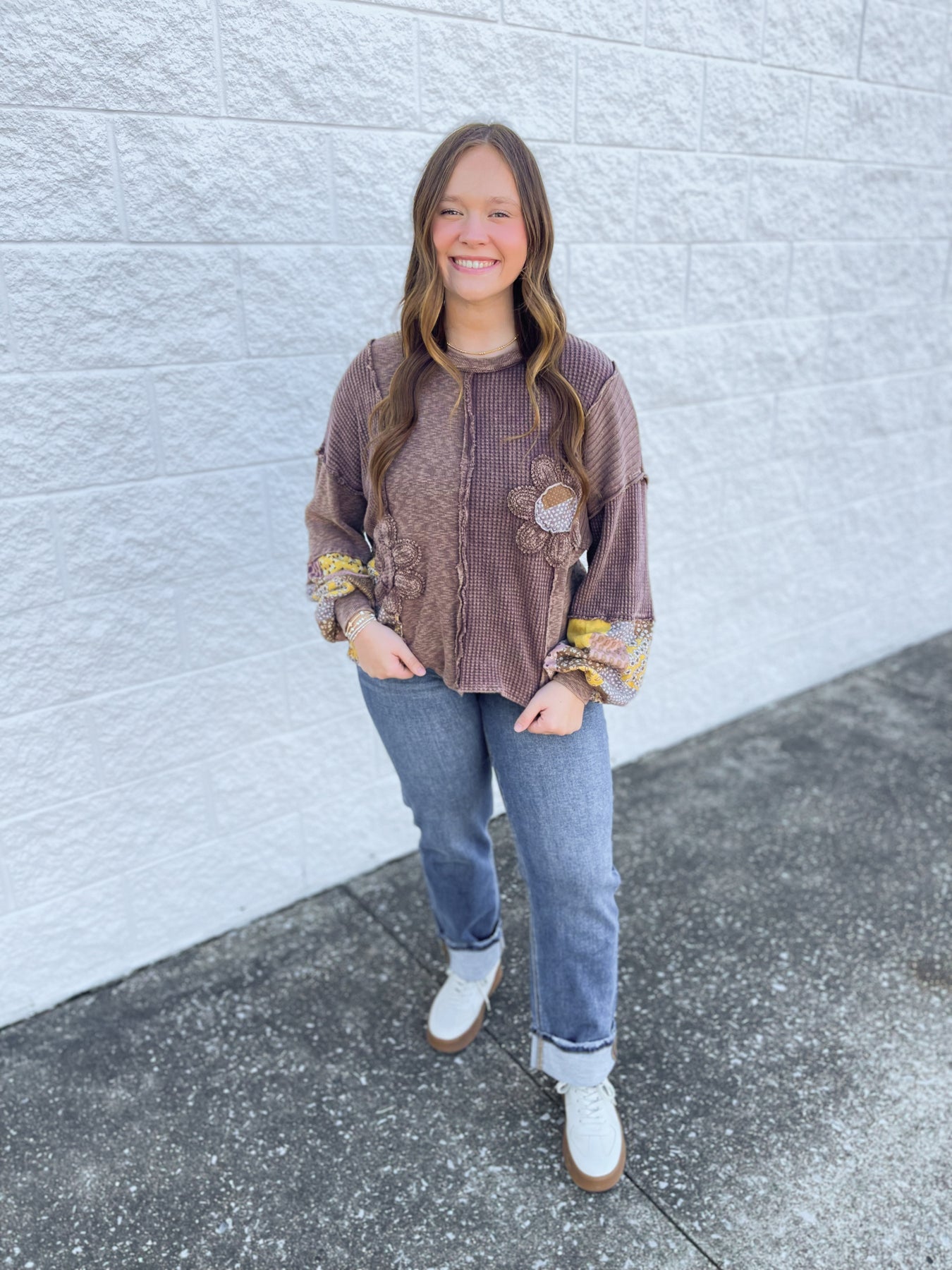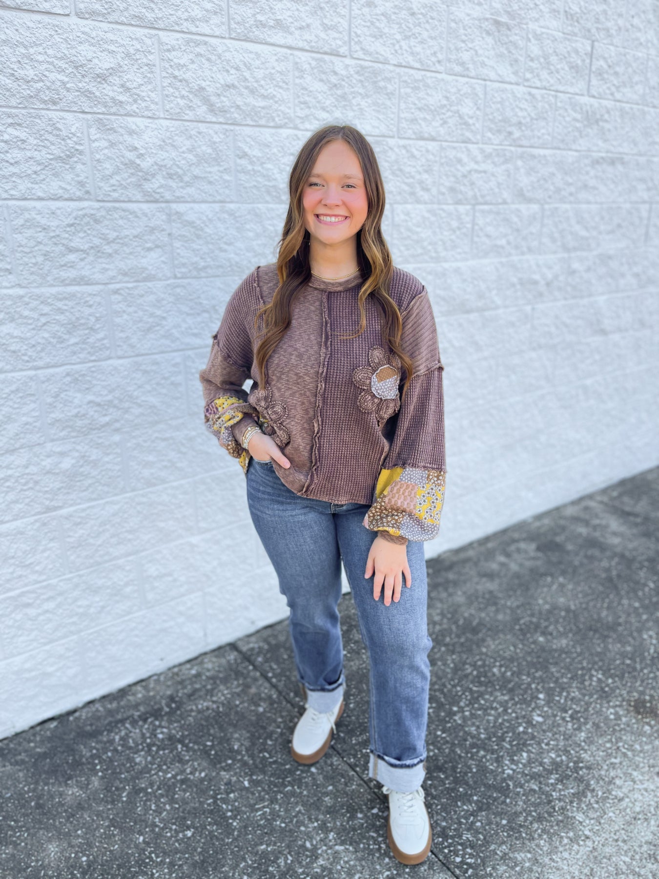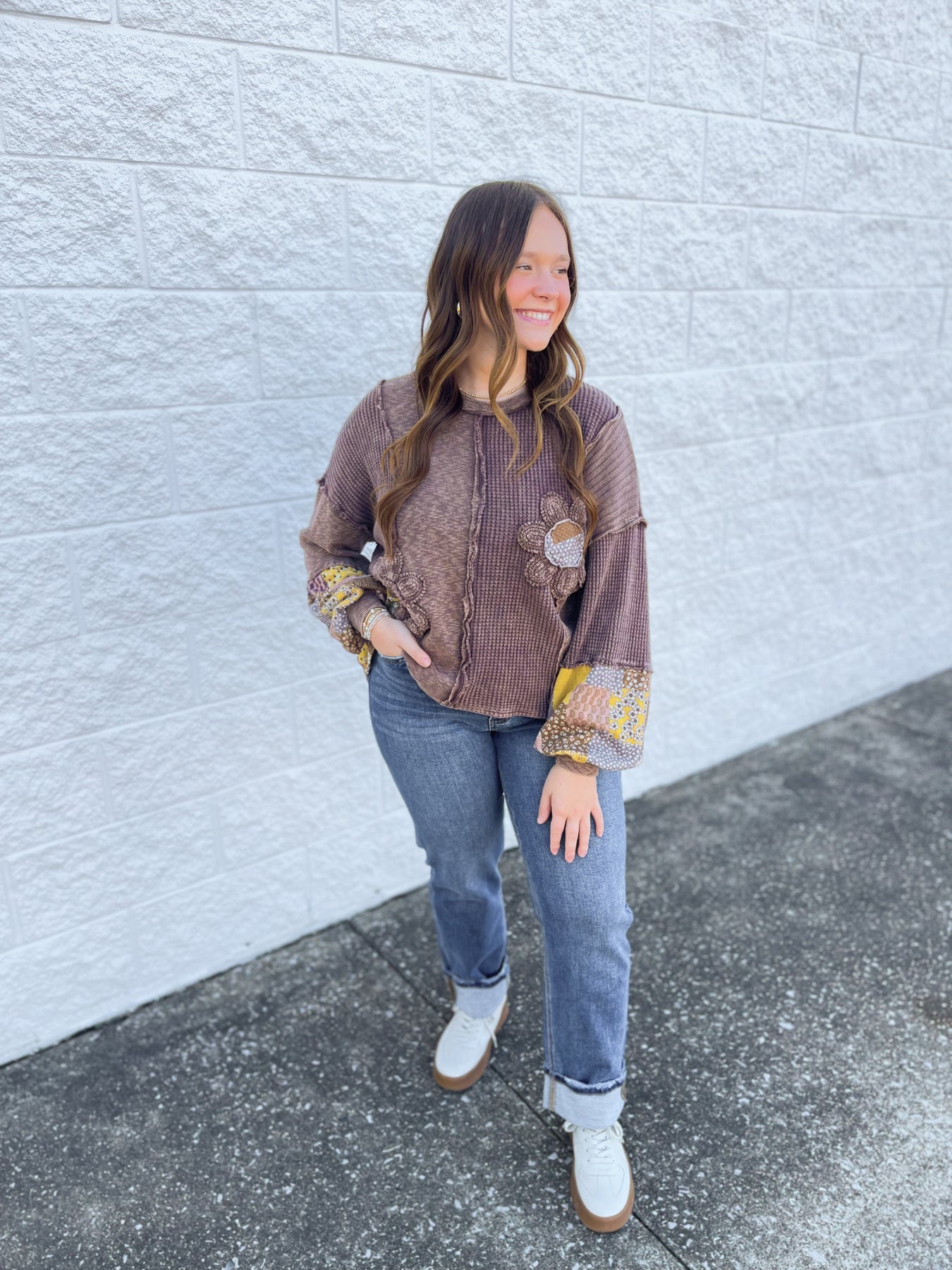 Enjoy cozy fall days in the Chocolate J Her Pullover, a stunning dark brown acid wash waffle knit top that’s soft to the touch. The playful patchwork flowers in pops of yellow and taupe add a cute, casual vibe, while the slightly oversized fit keeps it comfy and relaxed. Perfect for layering with your favorite autumn looks!