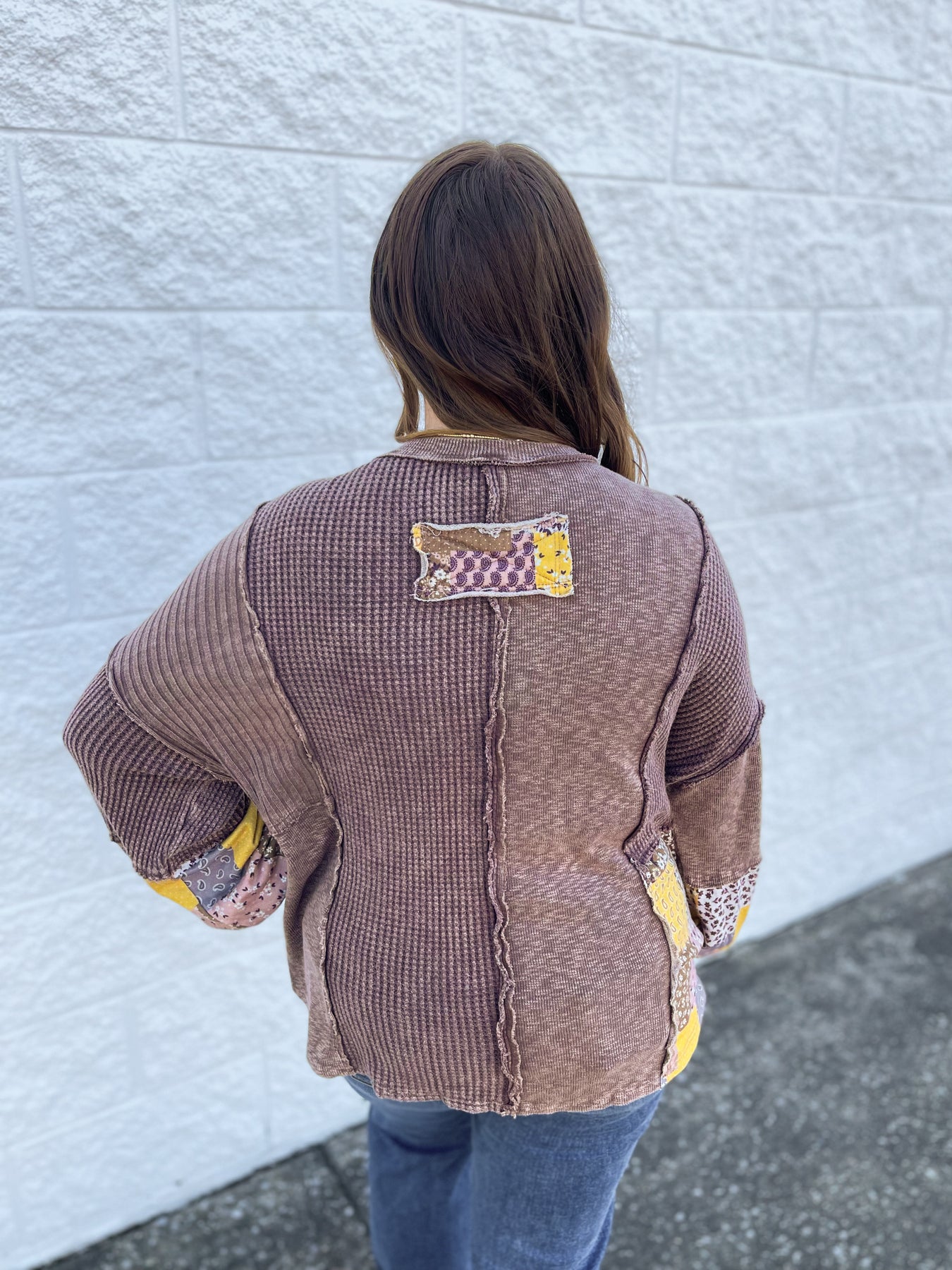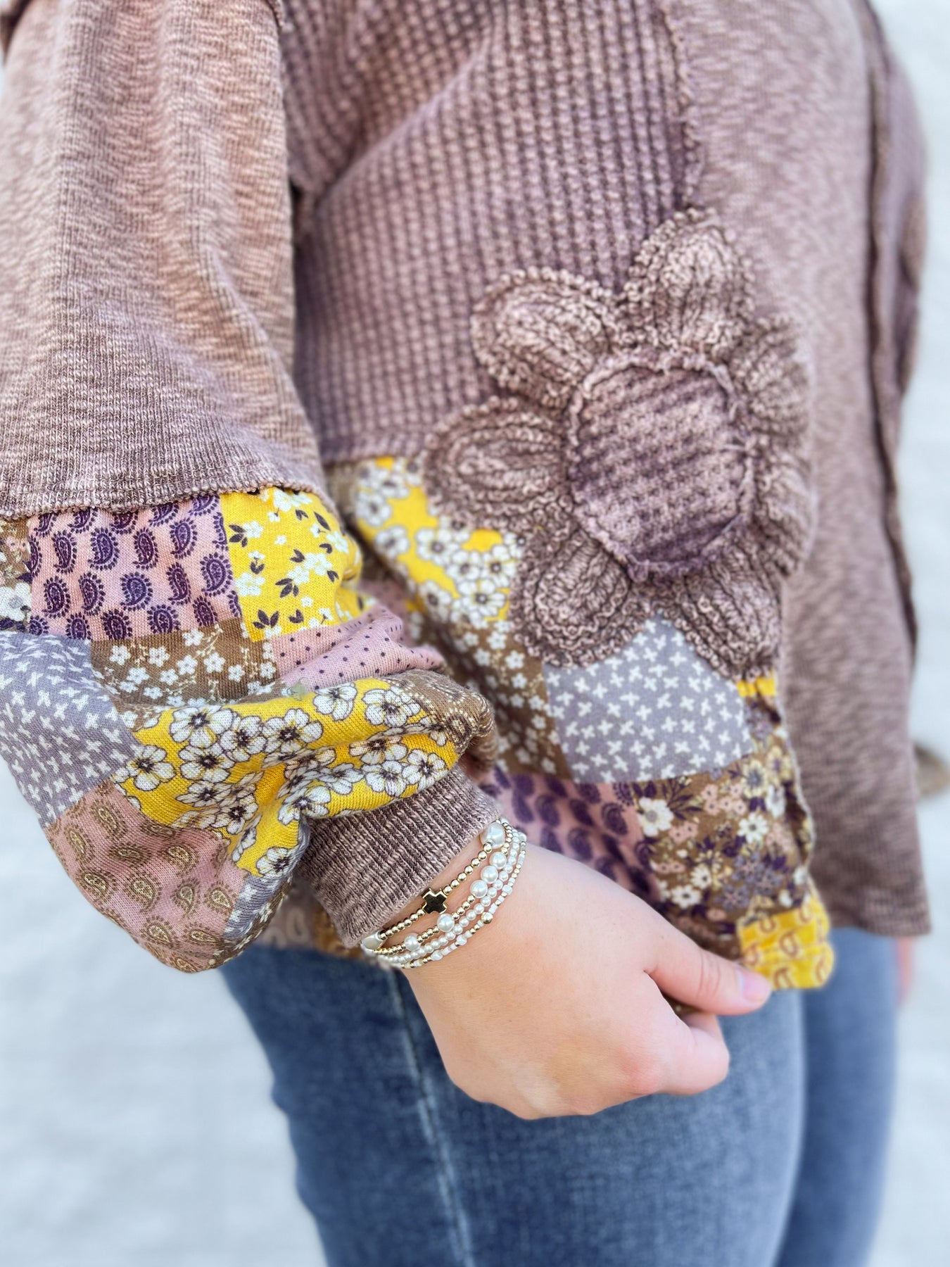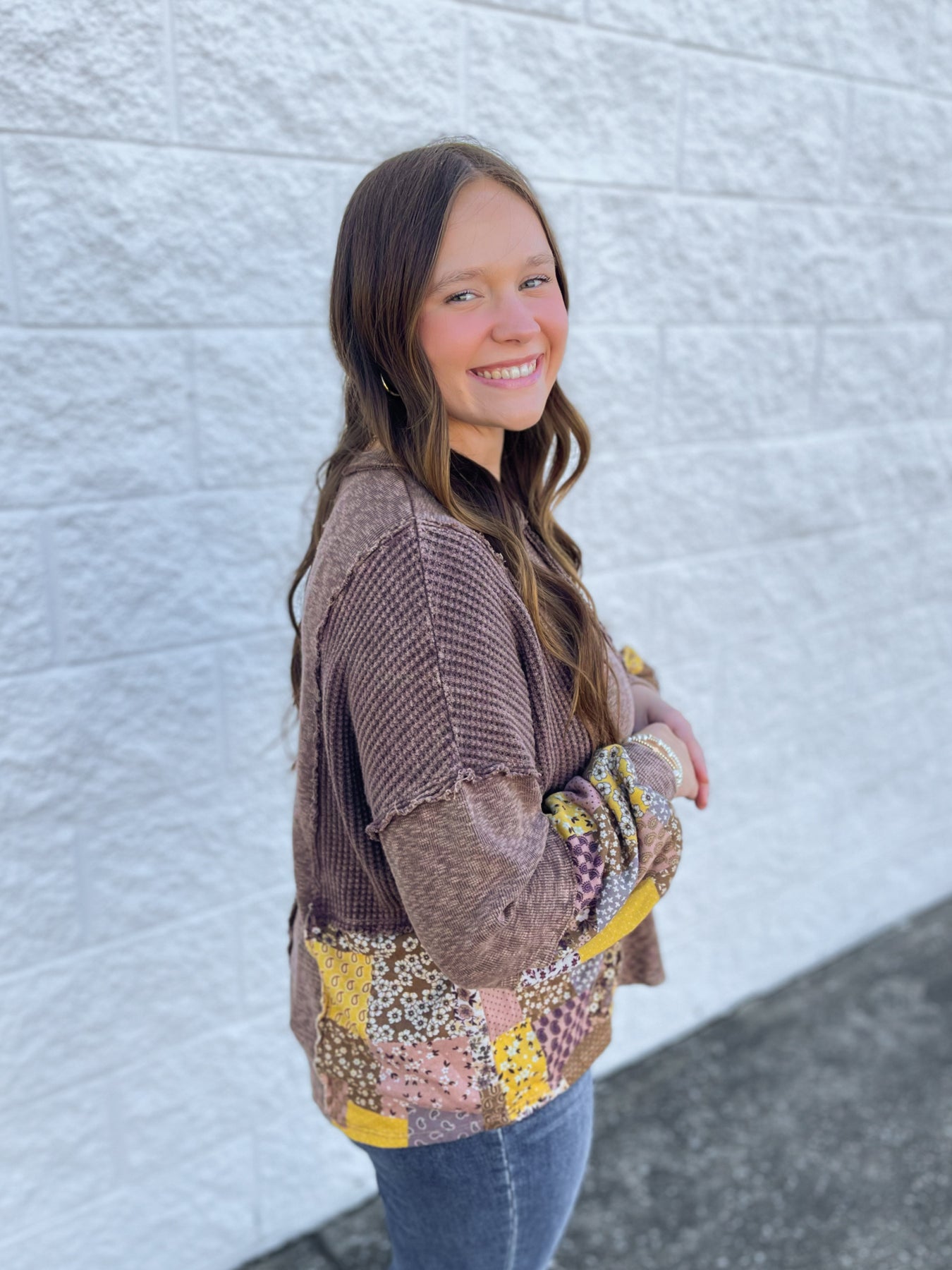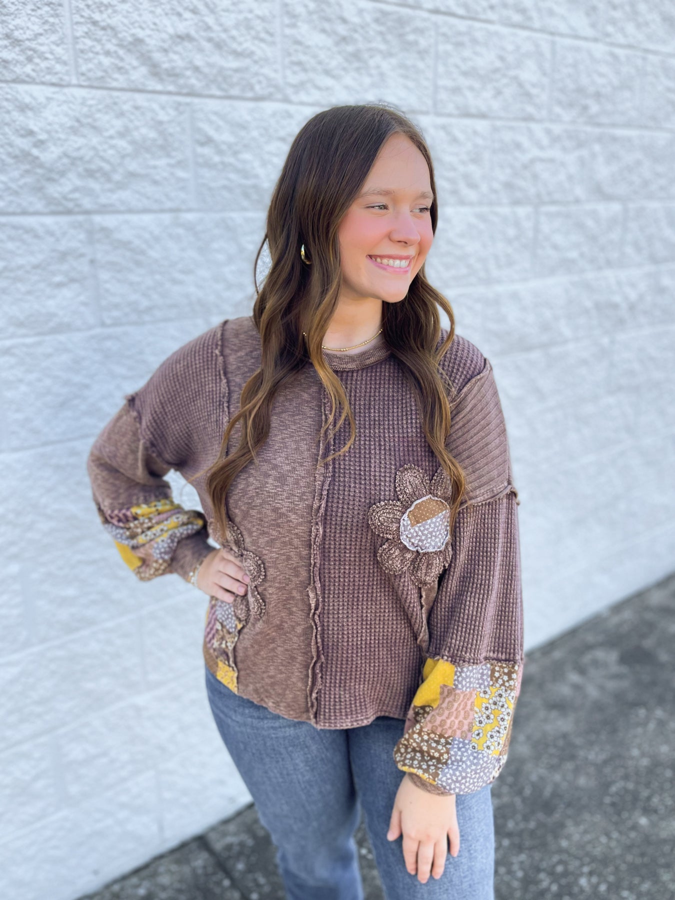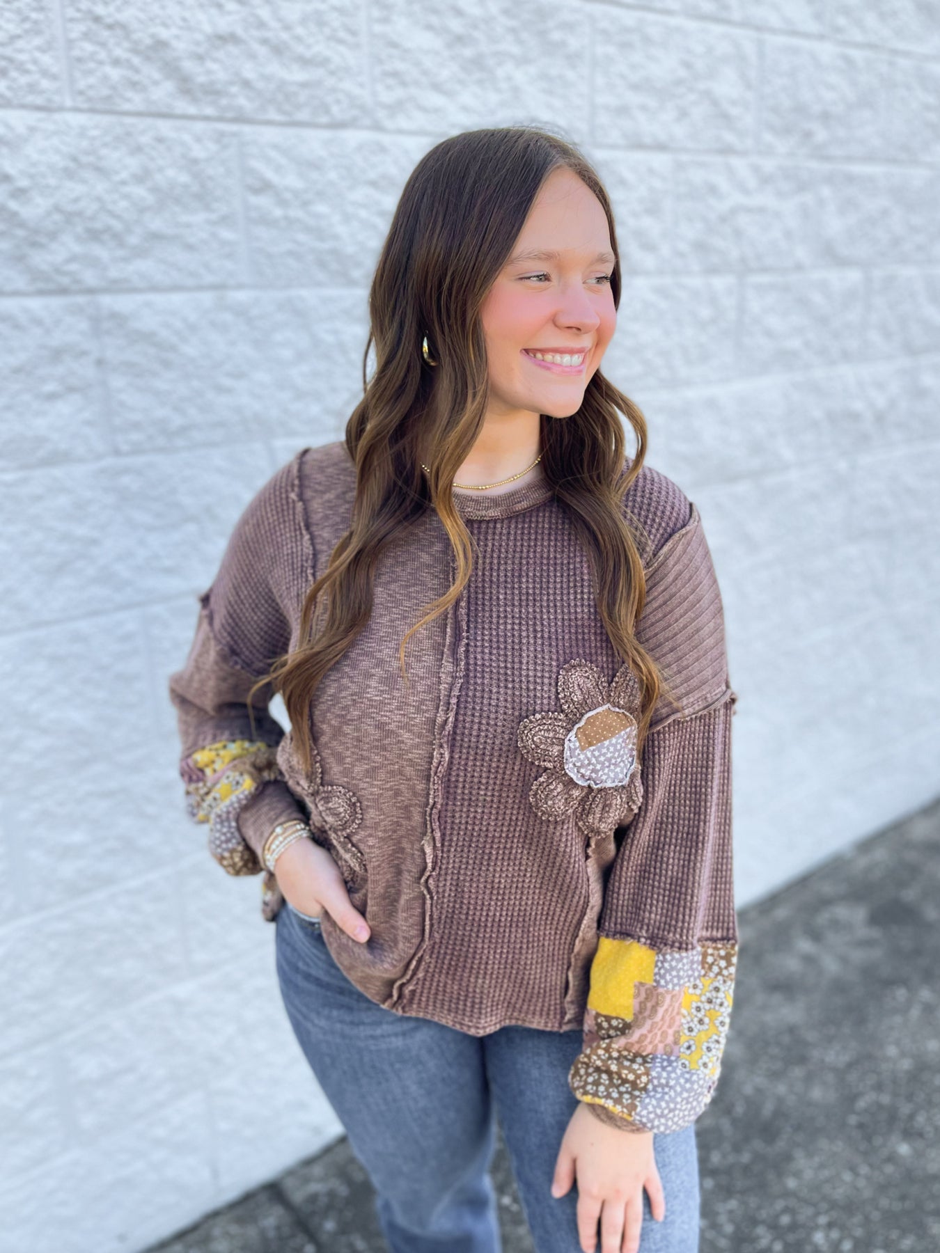 Enjoy cozy fall days in the Chocolate J Her Pullover, a stunning dark brown acid wash waffle knit top that’s soft to the touch. The playful patchwork flowers in pops of yellow and taupe add a cute, casual vibe, while the slightly oversized fit keeps it comfy and relaxed. Perfect for layering with your favorite autumn looks!