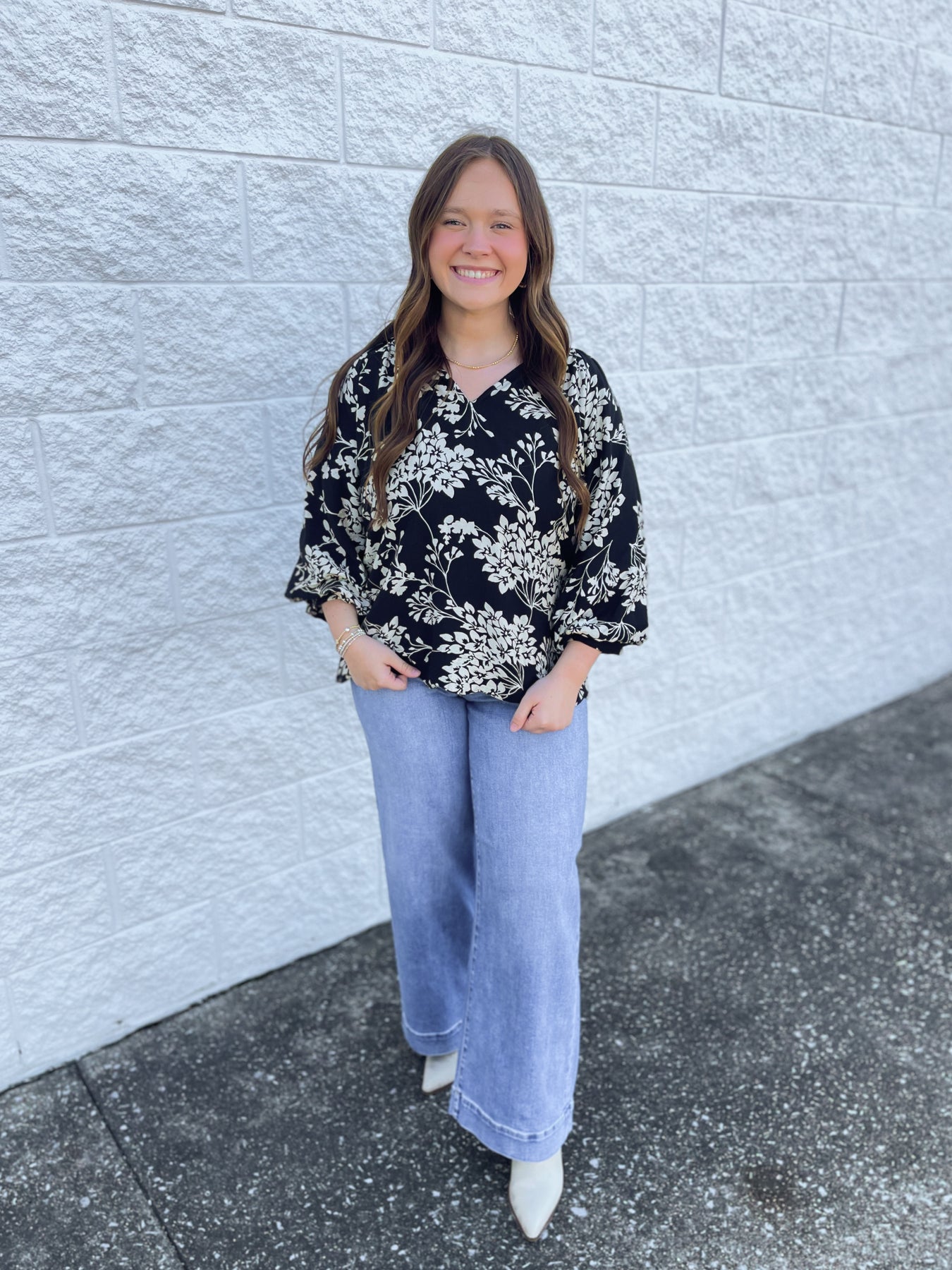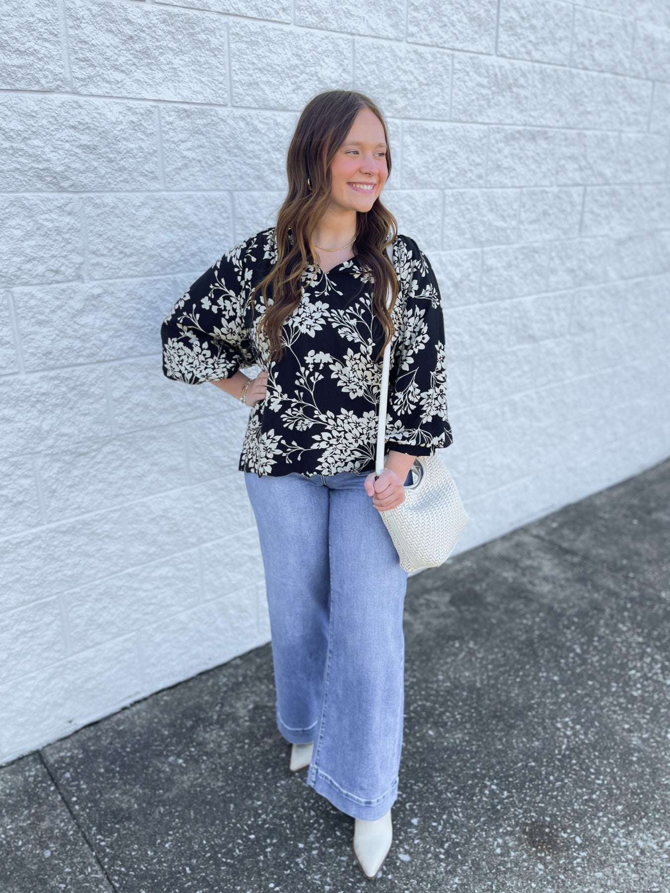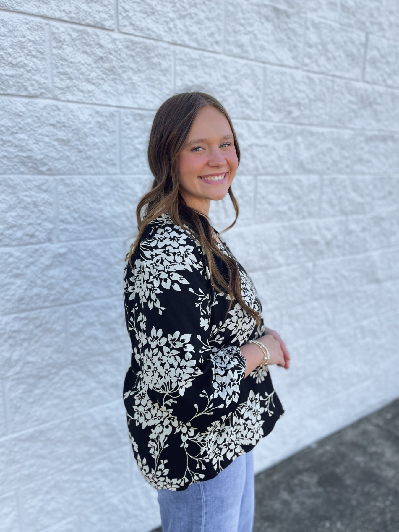 Step into fall with the Umgee Black Cherry Blossom Top, where a stunning black and white floral pattern meets super soft, flowy fabric. The playful v-neckline and ruffle collar add a flirty flair, while puff sleeves bring a touch of fun and volume to your look. Perfect for cozy, stylish days ahead!