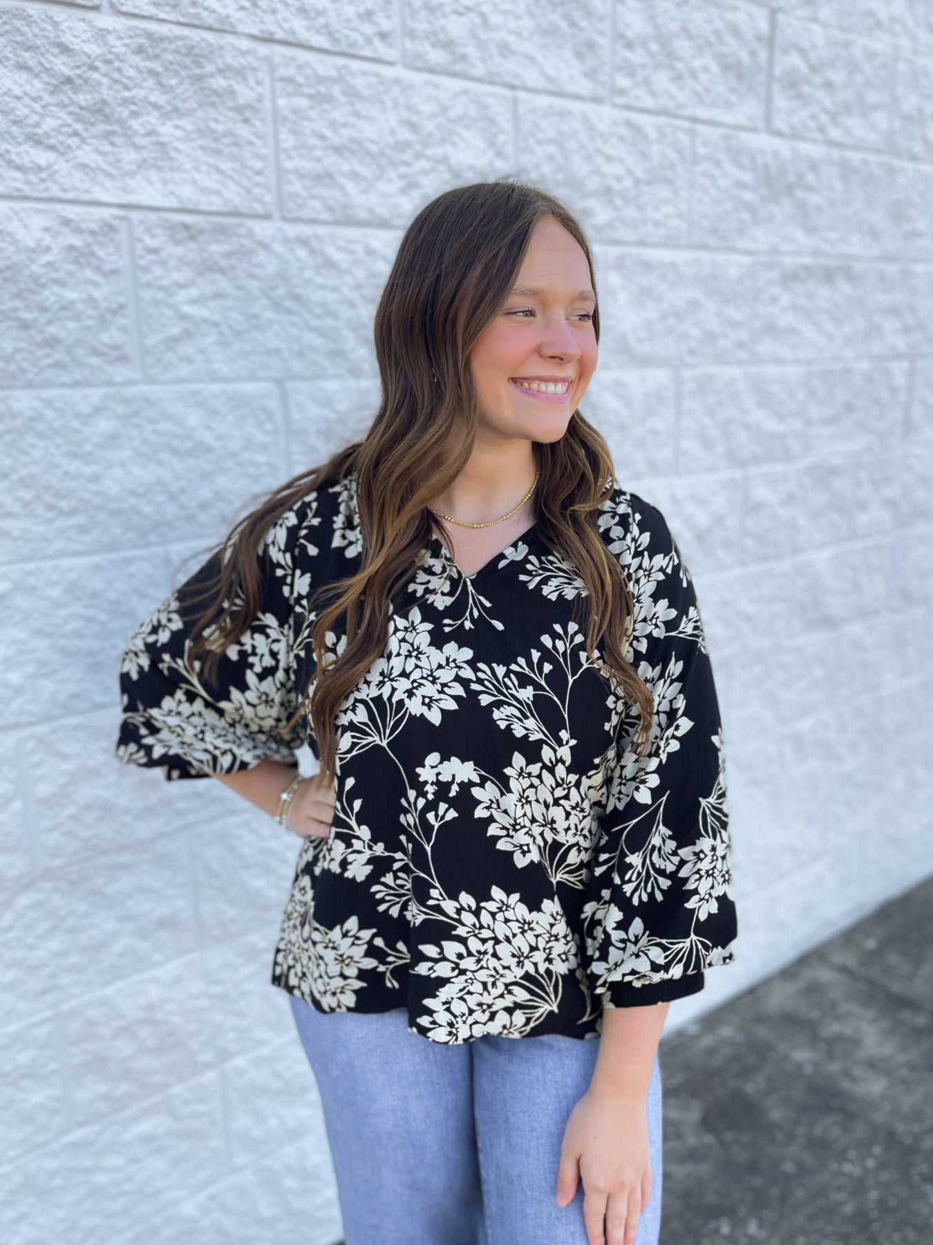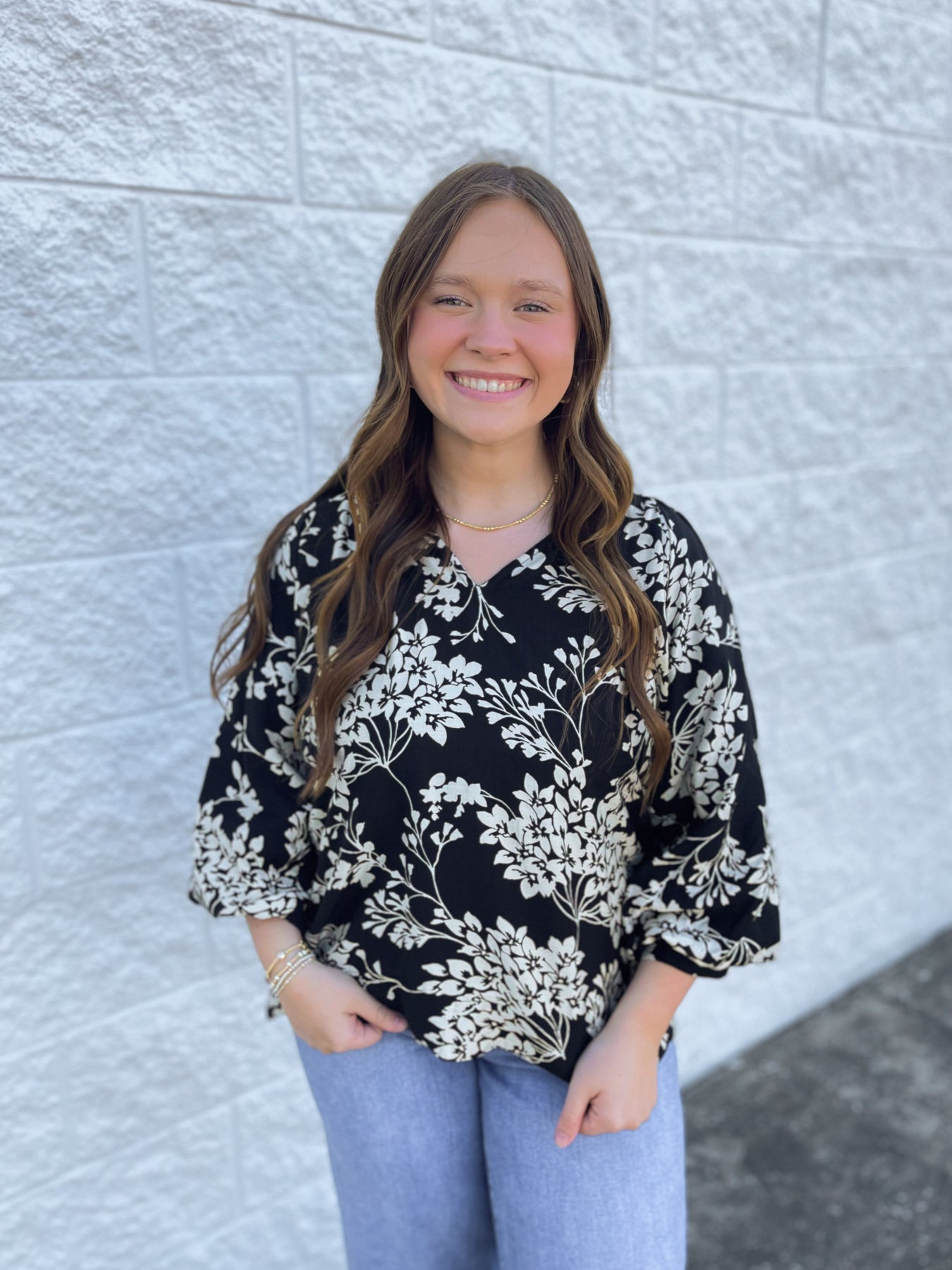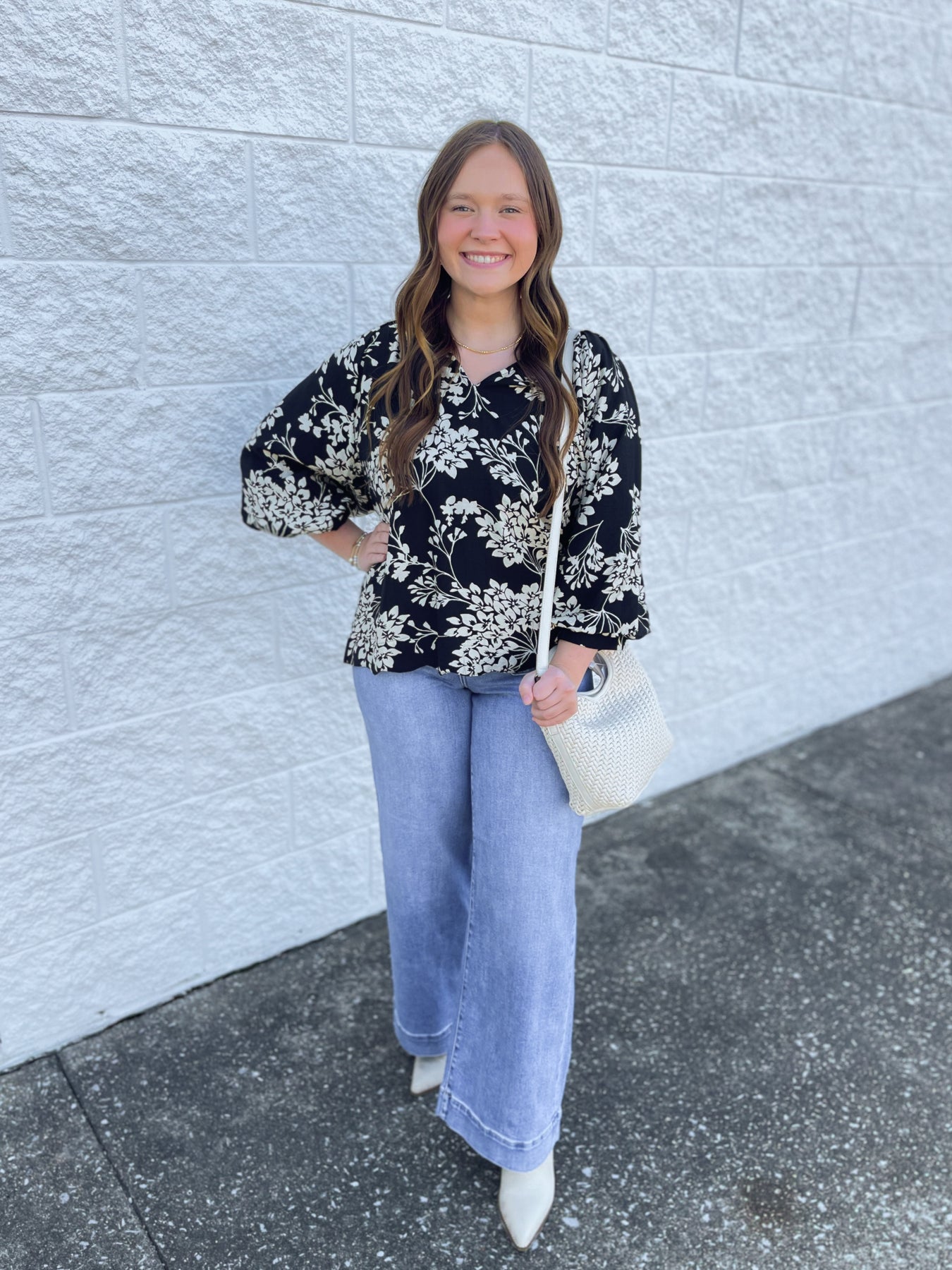 Step into fall with the Umgee Black Cherry Blossom Top, where a stunning black and white floral pattern meets super soft, flowy fabric. The playful v-neckline and ruffle collar add a flirty flair, while puff sleeves bring a touch of fun and volume to your look. Perfect for cozy, stylish days ahead!