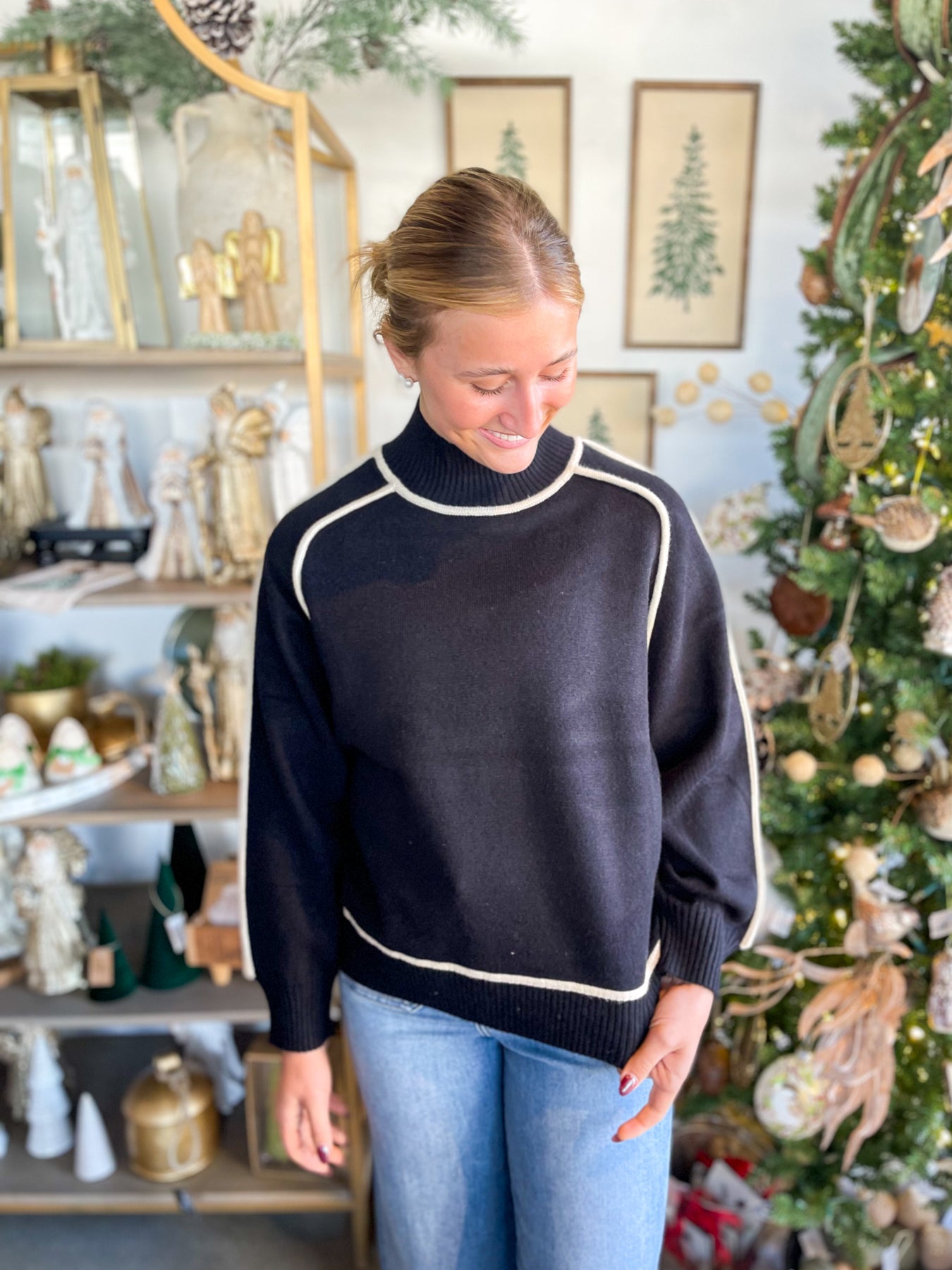 You'll be absolutely obsessed with this stunning sweater! Crafted from super soft fabric, it features a chic mock neck and long sleeves with a slightly cropped silhouette that hits just right. The elegant ivory trim detailing adds a sophisticated touch that transitions seamlessly from casual to dressy occasions. Whether you're dressing it down with jeans or pairing it with tailored trousers, this trendy piece is versatile enough to become a wardrobe staple. Effortlessly stylish and irresistibly cozy—what's not to love?