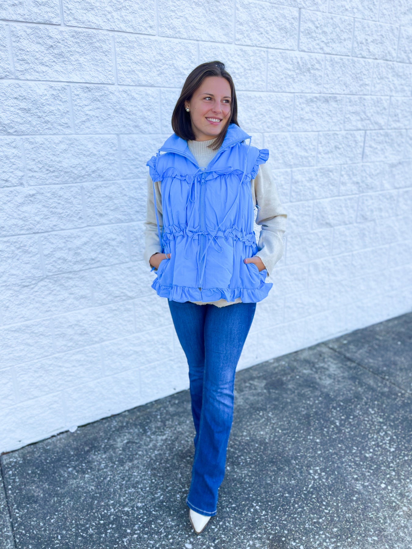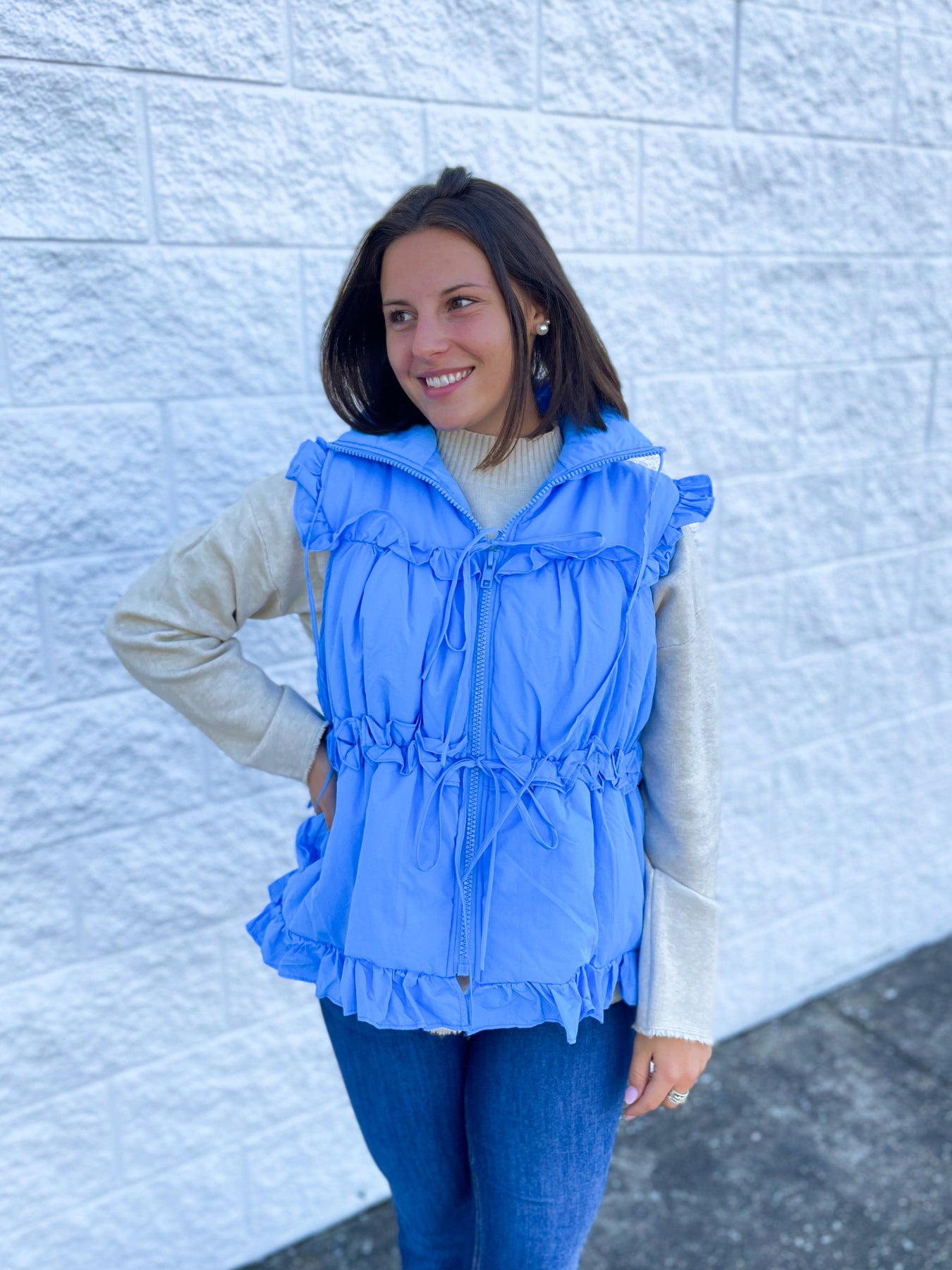 Turn heads this fall with the Blue Bow Back Puffer Vest! This stunning bright blue vest features a playful ruffle design, trendy tie front closure with zipper, and an eye-catching big bow in the back. It’s the perfect fun and stylish layer to brighten up cooler days.