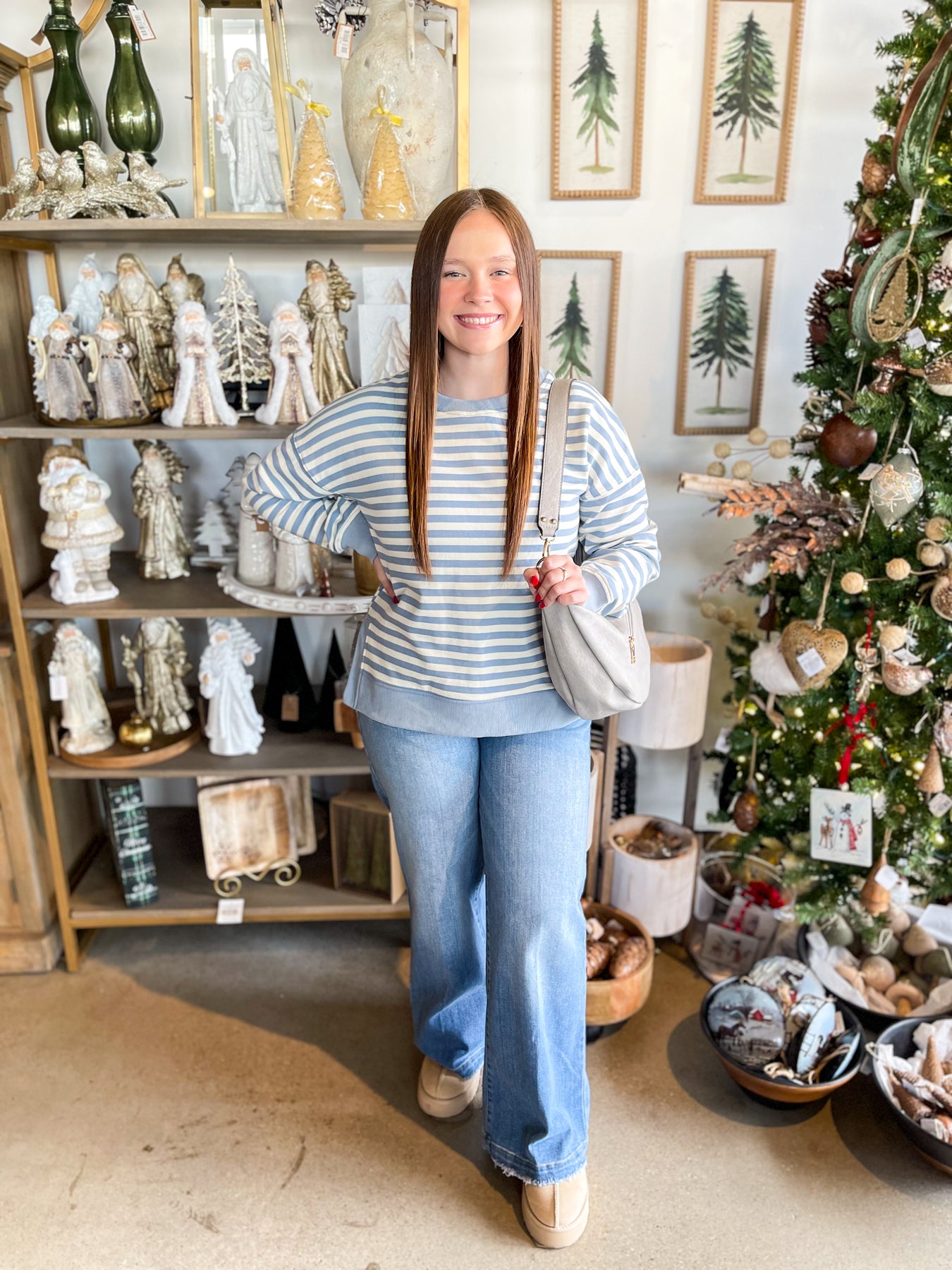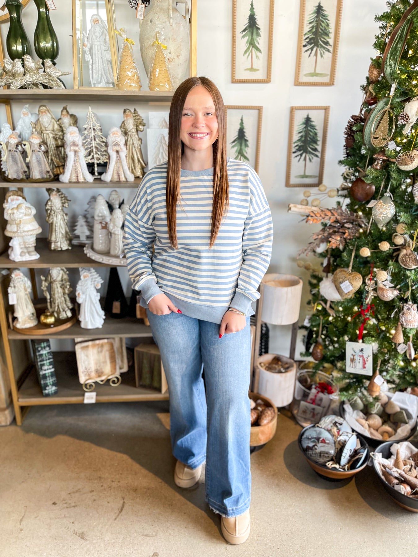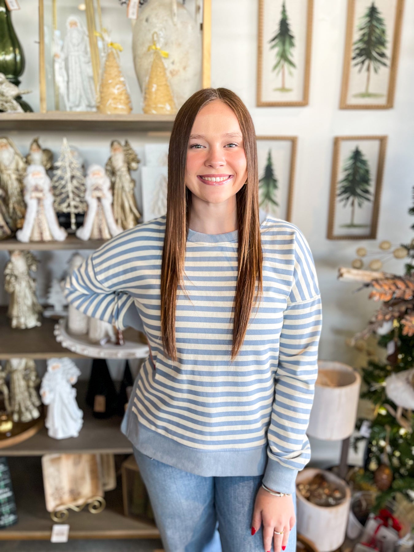 The Blue Jenny Crewneck Pullover is your new comfort essential. This super soft and cozy piece features a charming blue and white stripe that's both timeless and on-trend. The slightly oversized fit gives you that relaxed, effortless vibe while the subtle crop keeps proportions perfectly balanced. The classic crew neckline pairs beautifully with everything in your closet—dress it up with jeans or keep it casual with sweats. Soft enough to live in, stylish enough to wear anywhere, this pullover is pure coziness wrapped up in one irresistible package.