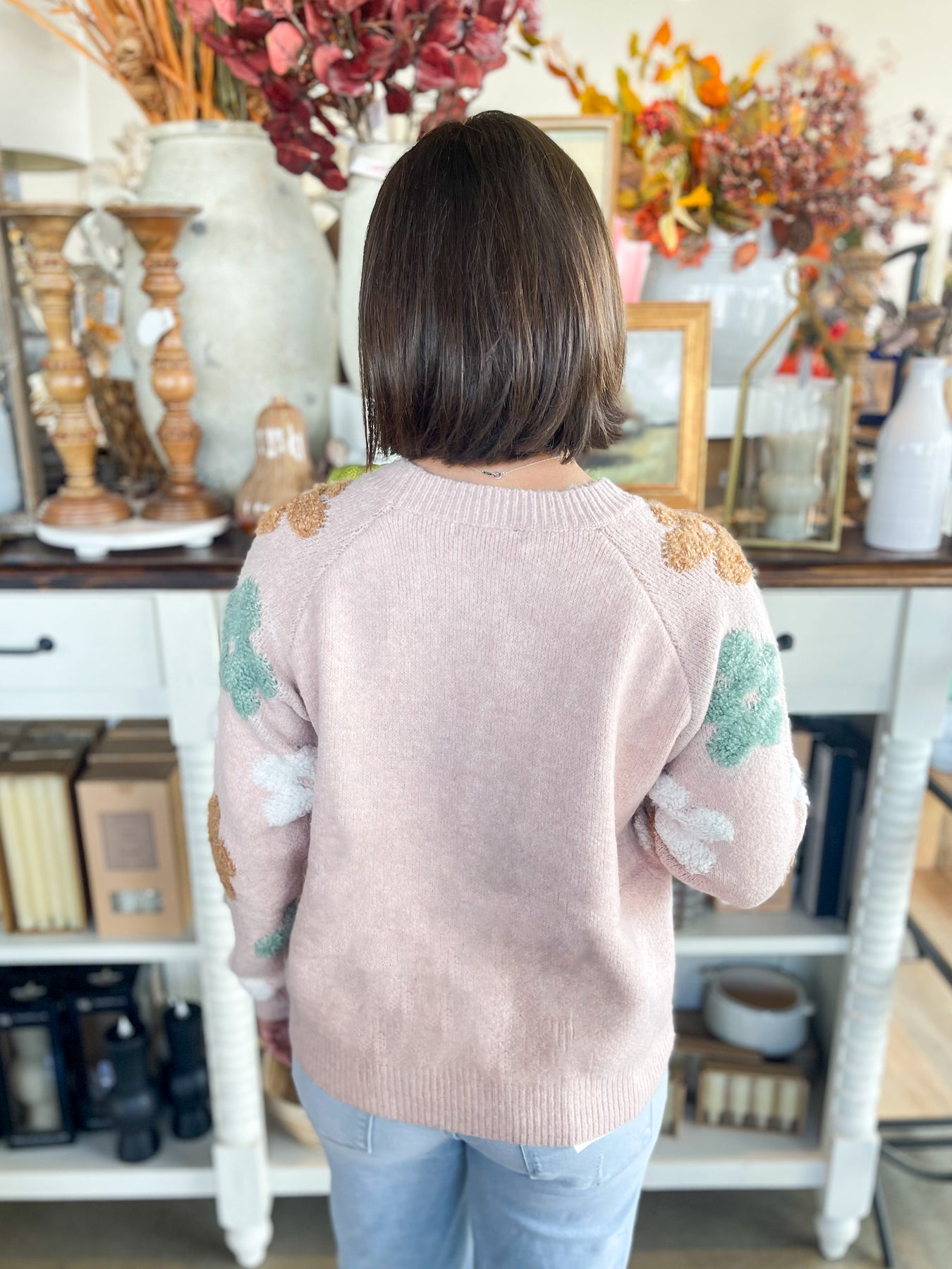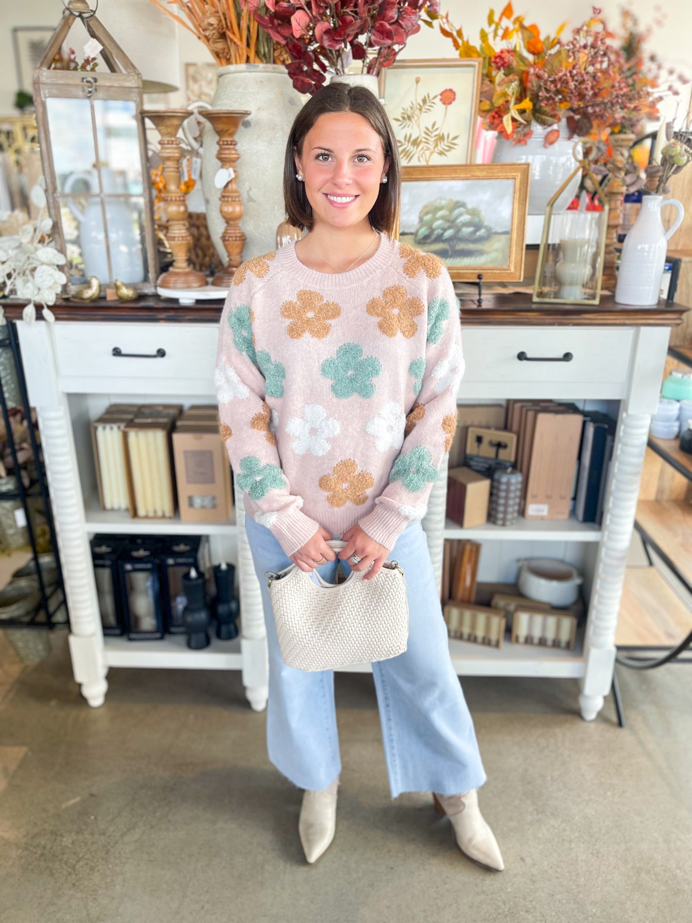 The Blush Floral Sweater is a playful fall essential with a trendy brown, blue, and white floral pattern set against a soft light pink background. This lightweight knit sweater can be dressed up or down, making it a versatile and stylish addition to your seasonal wardrobe.