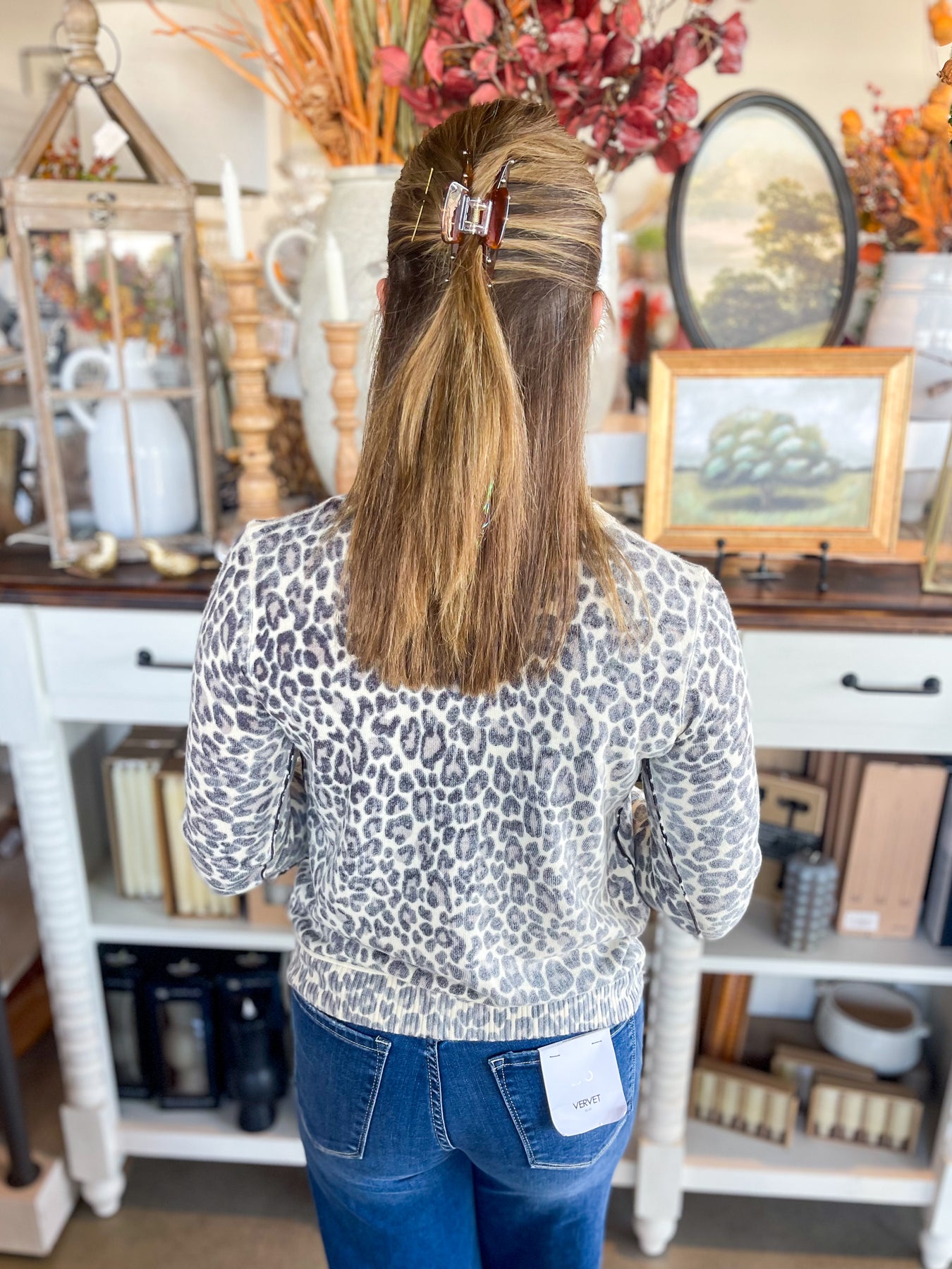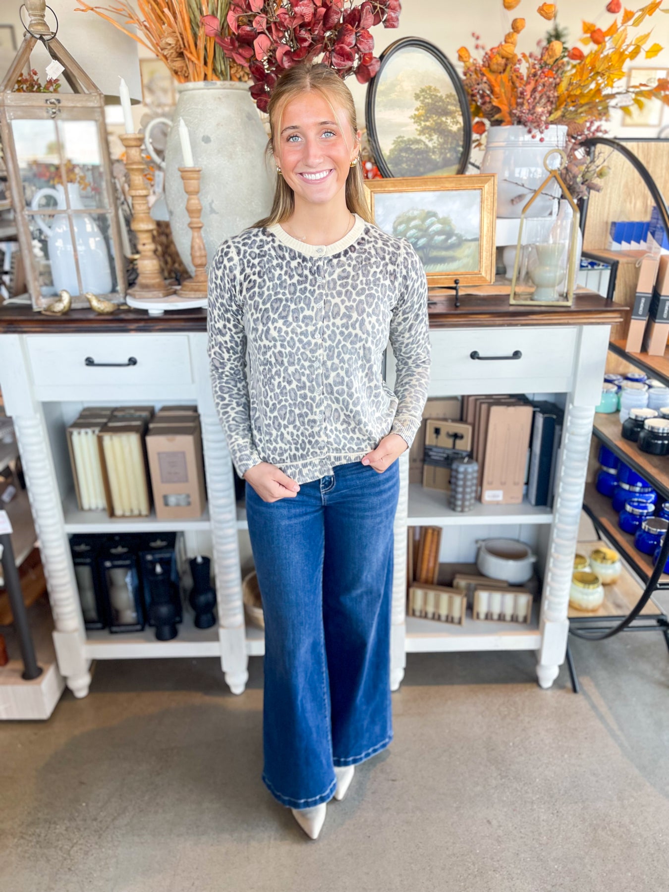 Add a wild twist to your fall wardrobe with this playful leopard print cardigan. Featuring a cozy crew neckline and small buttons down the front, its fitted style flatters every curve while the faded print gives it a cool, lived-in vibe. Perfect for layering on crisp autumn days!