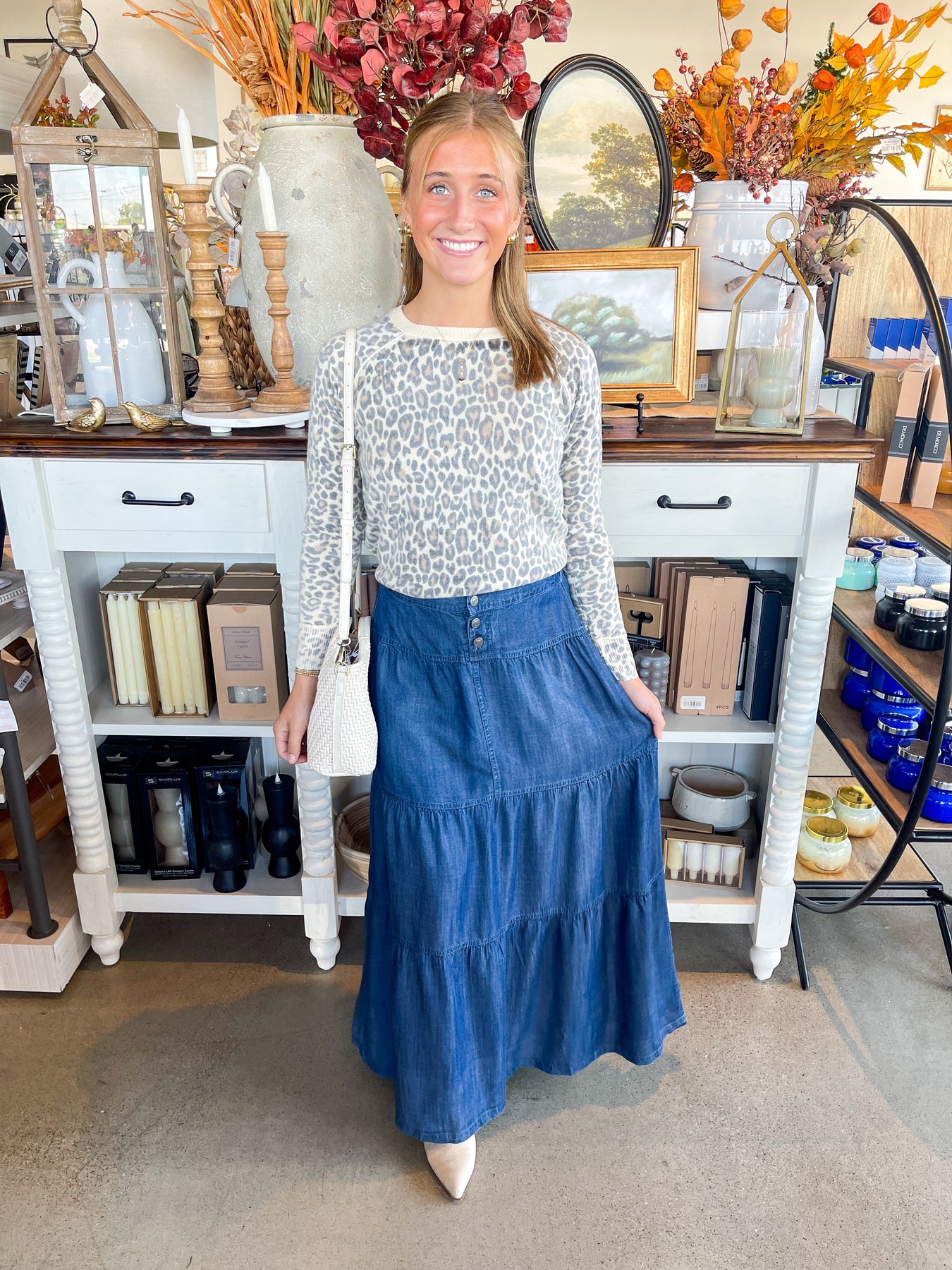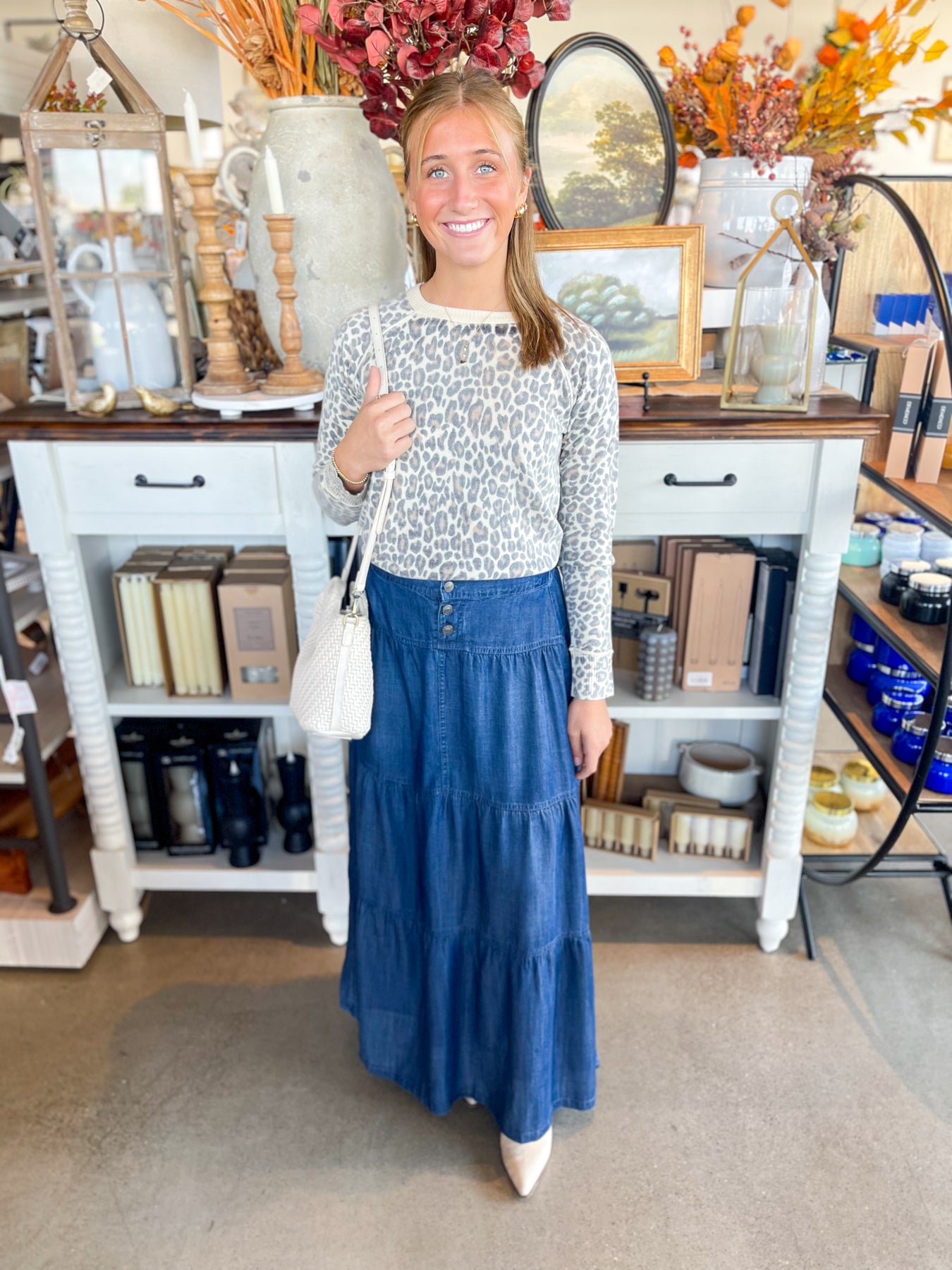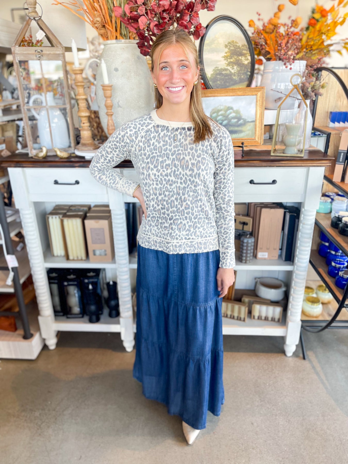 Stay cozy and stylish this fall with this super soft, fitted sweater. The crewneck design and faded leopard print add trendy details that make it a perfect go-to for cooler days. Play up your look with this effortlessly cool, fall-ready favorite.