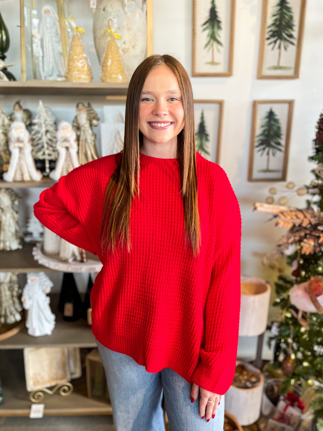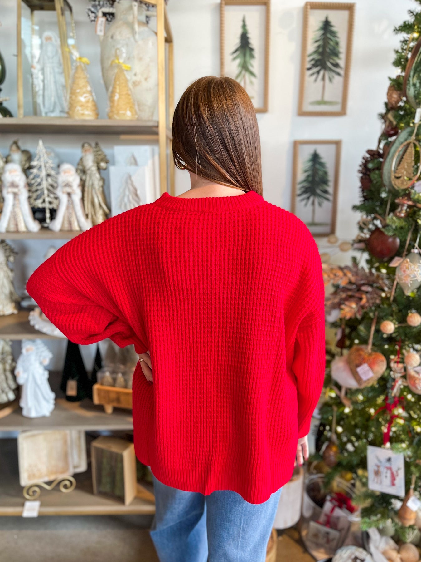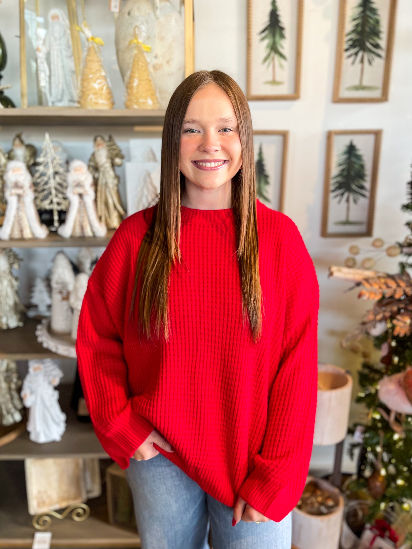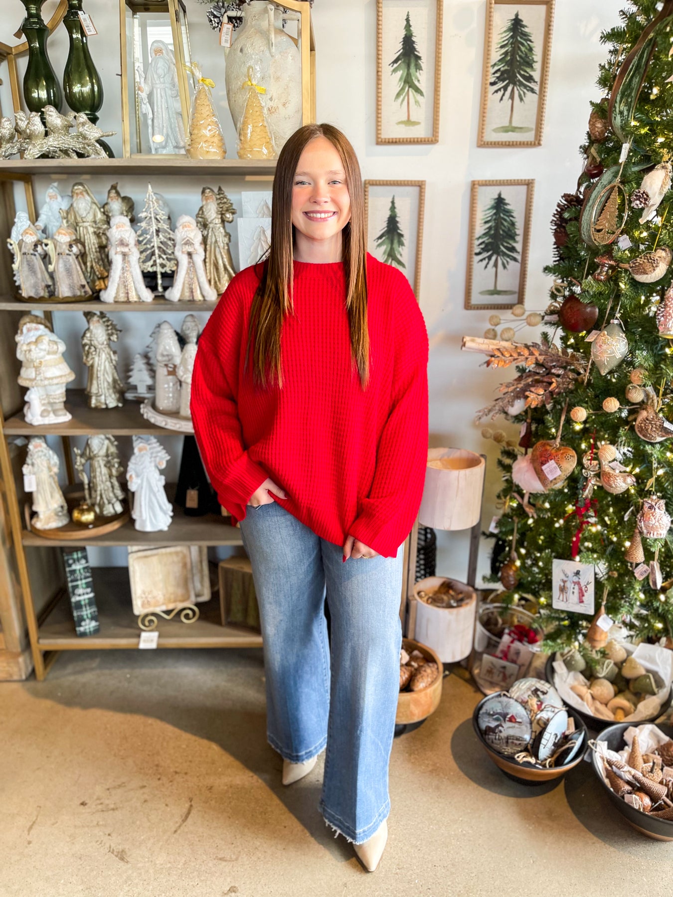 The Buttermelon Round Neck Red Sweater is your cozy dream come true. This stunning chunky knit in rich red is perfect for holiday gatherings and beyond—it's the sweater you'll reach for all year long. The oversized silhouette wraps you in comfort while the scoop neckline keeps things effortlessly chic. Long sleeves provide warmth without the bulk, making layering a breeze. Whether you're sipping cocoa by the fire or out running errands, this trendy and stylish sweater delivers that perfect balance of snug and sophisticated. Your new favorite is calling.
