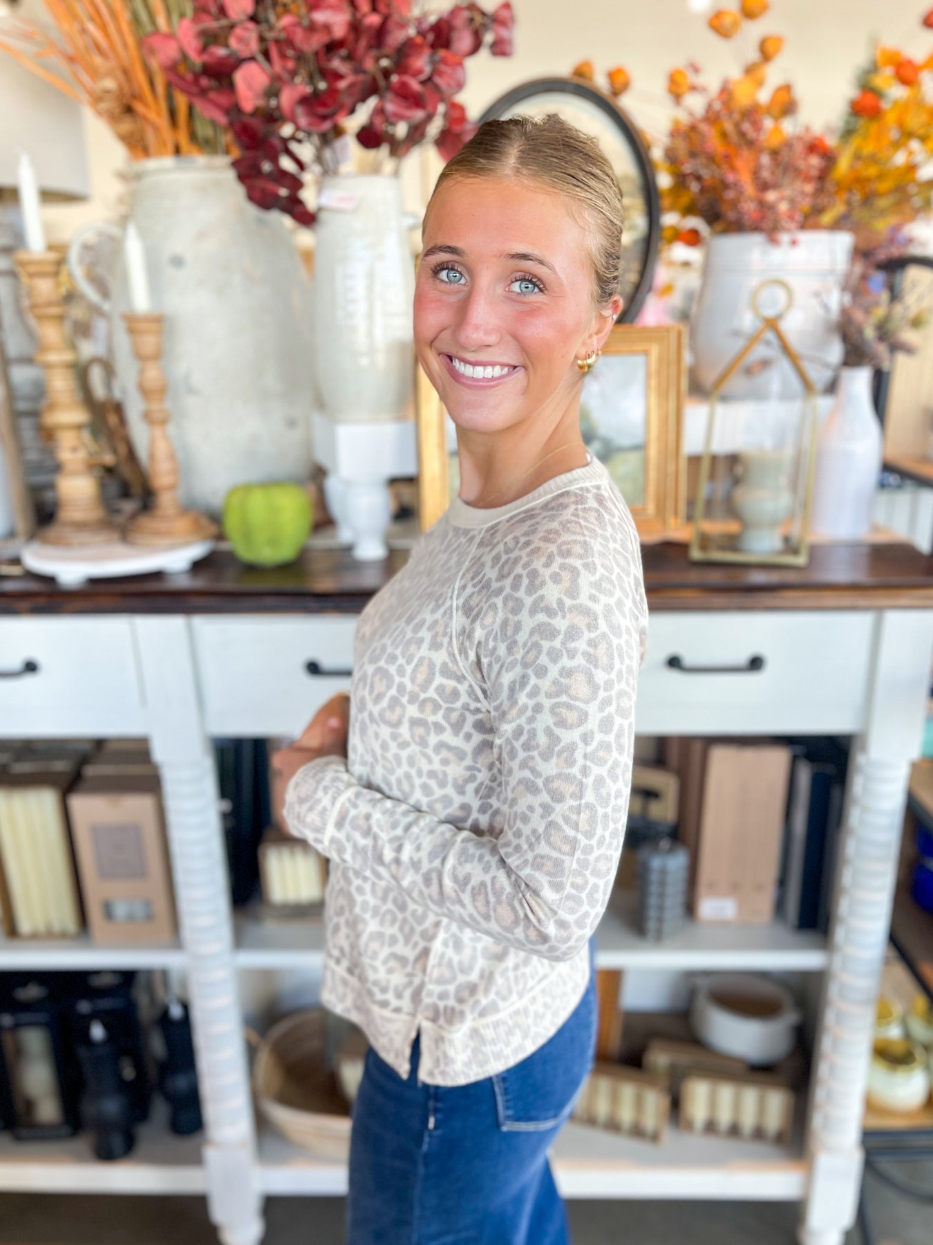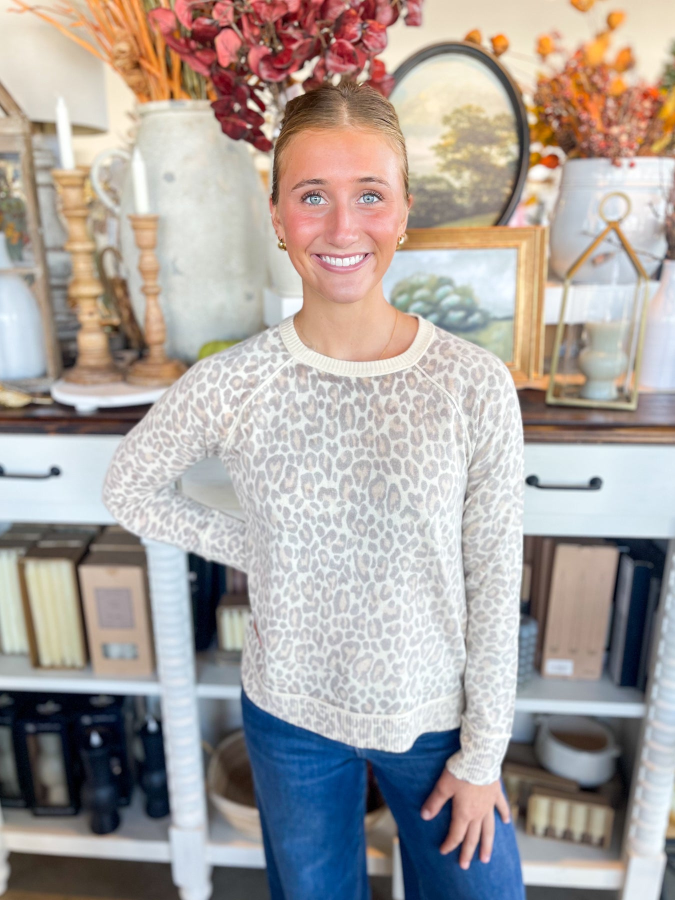 The Camel Inside Out Sweater is your new favorite fall essential. With a stunning faded animal print and playful exposed seams, this fitted, super soft sweater combines casual comfort with cute details. Its crew neck, side slits, and long sleeves make it perfect for layering or wearing solo in cozy style all season long.