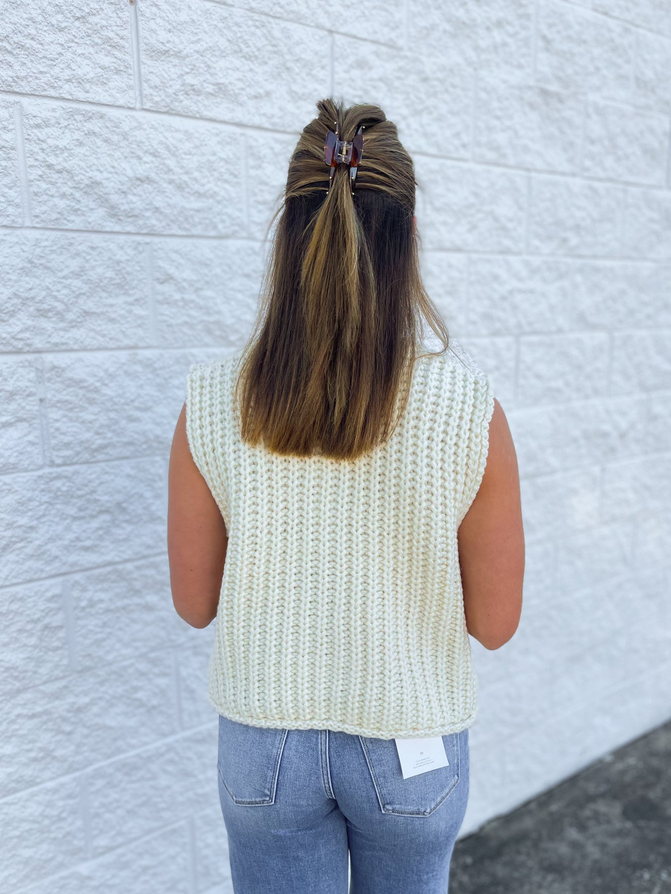 Step up your style game with the Cream Sleeveless Chunky Sweater Vest. The stunning olive green knit paired with shiny gold buttons and handy front pockets makes this vest both trendy and practical. Perfect for layering, it can be styled up or down to match any playful mood.