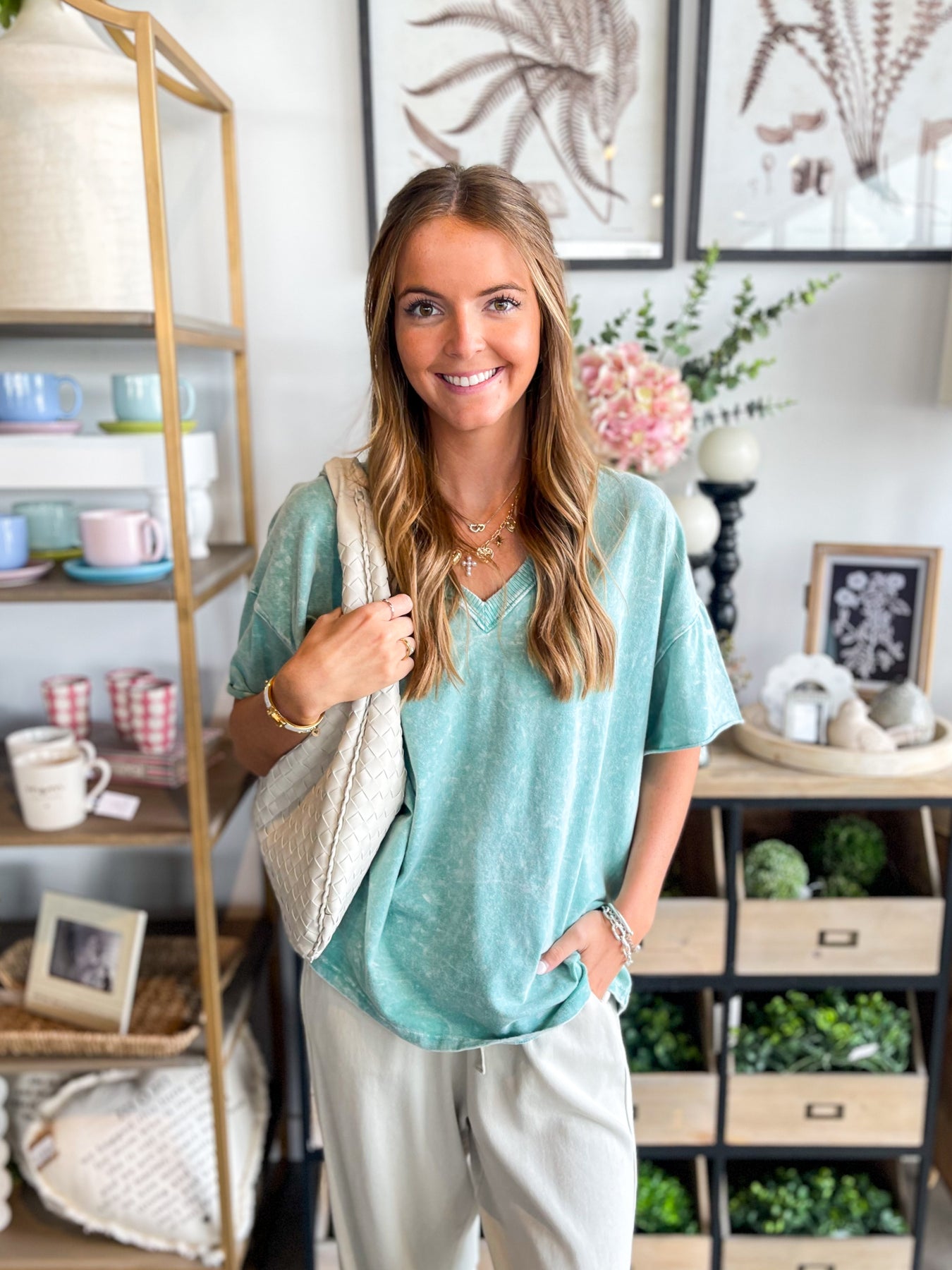 Indulge in the sweet style of our Cyan Beasley Top! With its cute v neck and soft mineral wash fabric, this top will satisfy all your fashion cravings. Perfect for any occasion, this top will have you looking and feeling your best. (But please, no actual cupcake stains!)