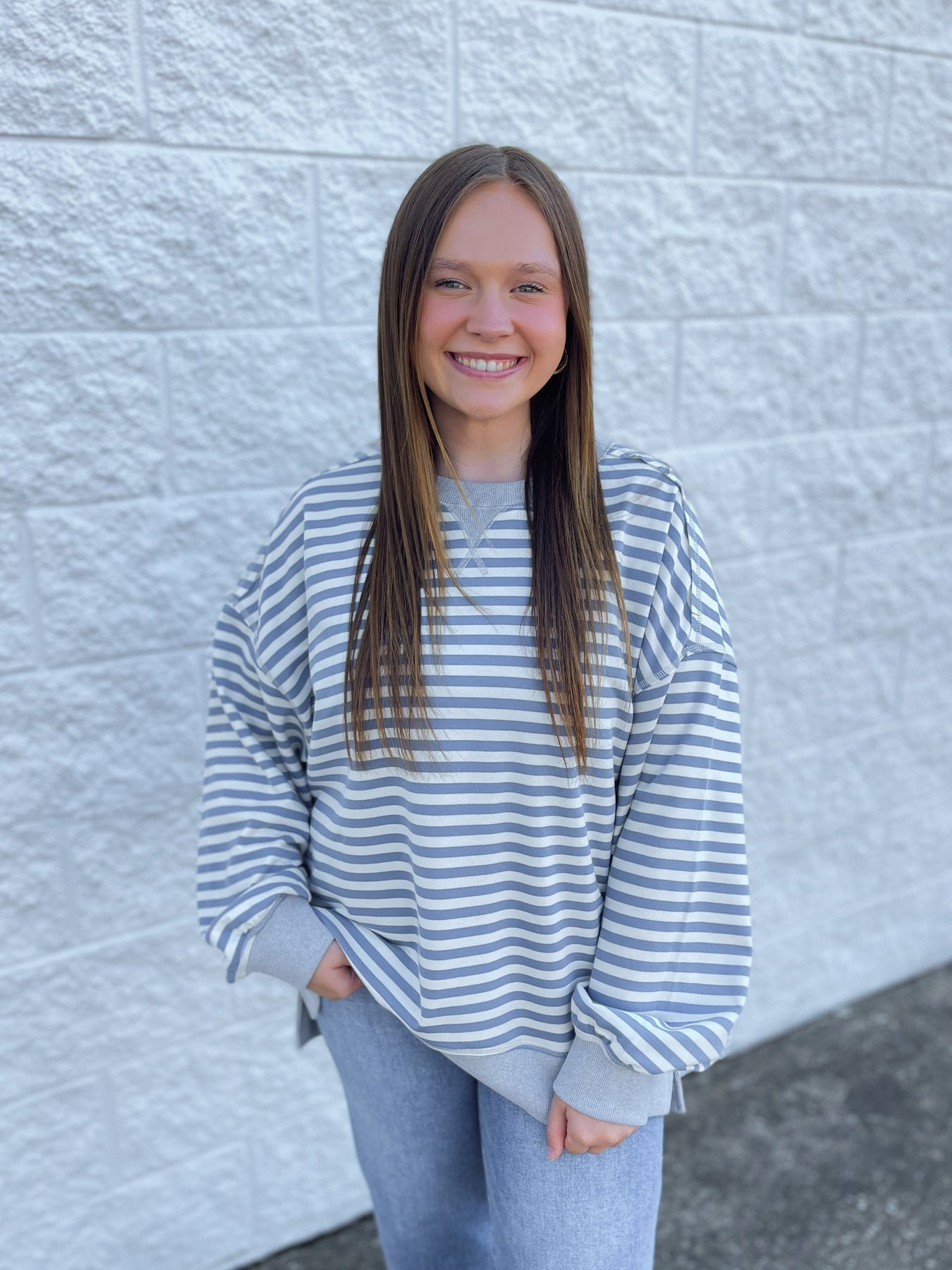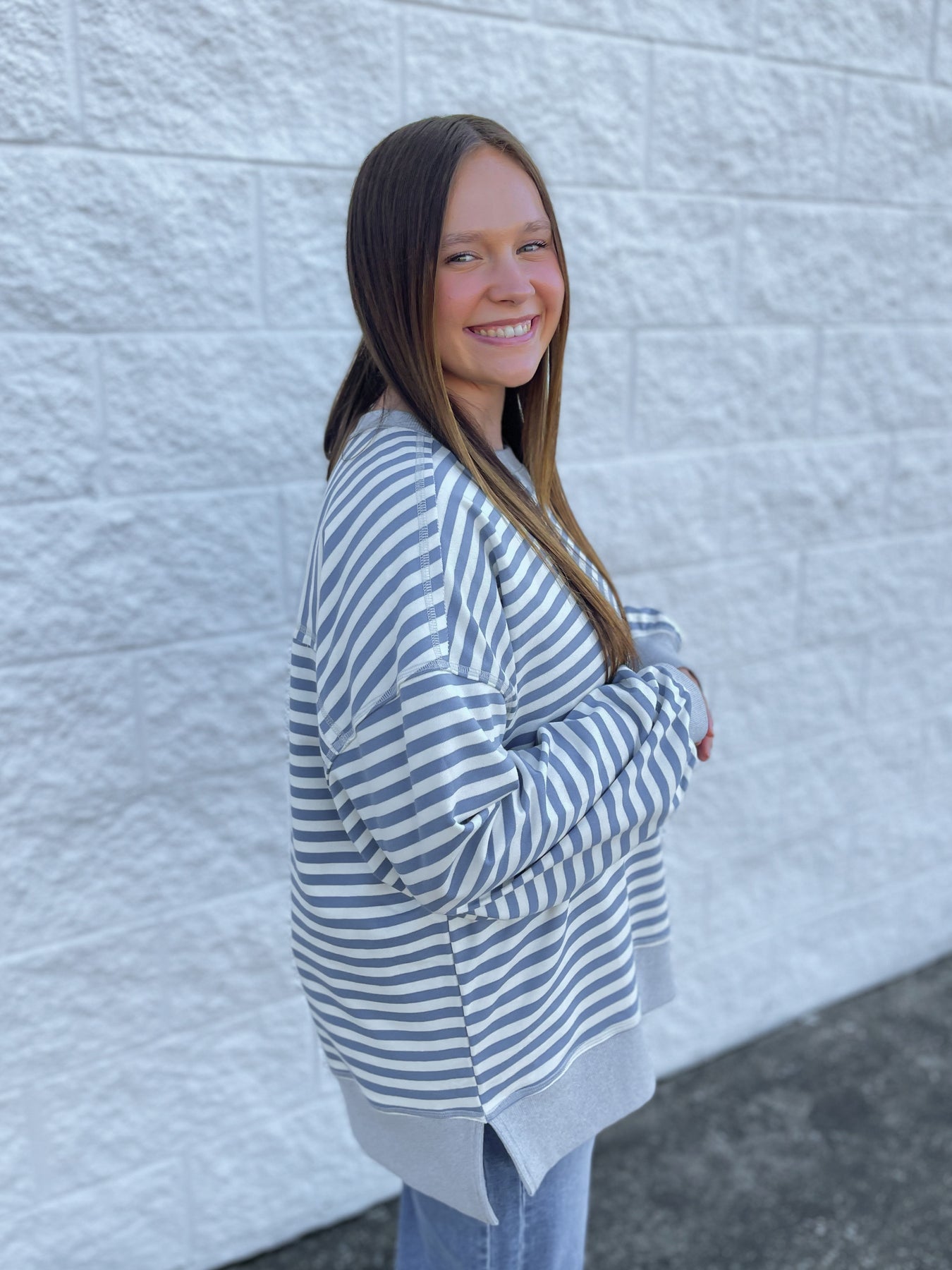 Cozy up your fall looks with this playful blue and cream crew neck pullover. Its slightly oversized fit and trendy stripes make it an easy, stylish choice for layering on crisp days.