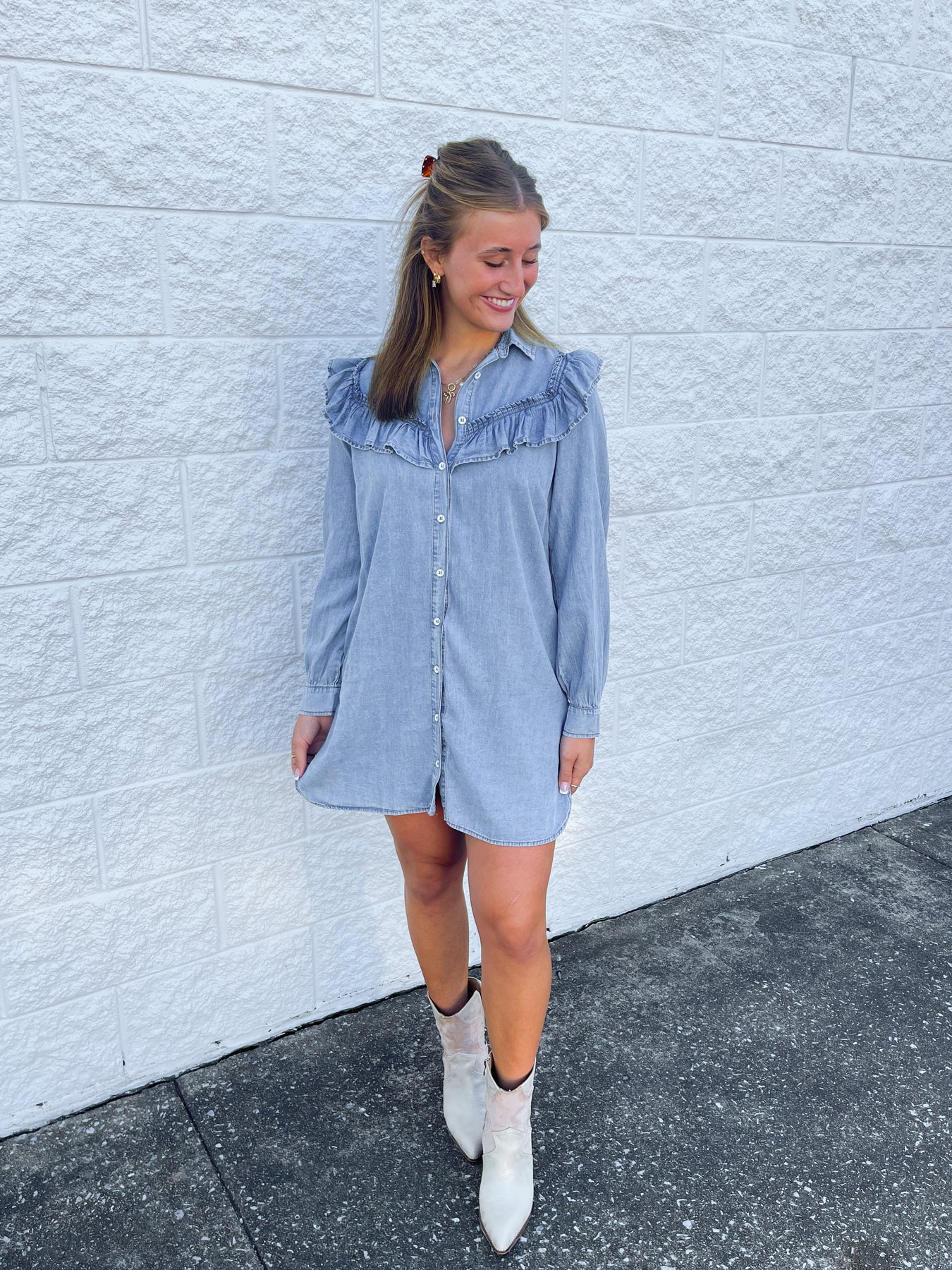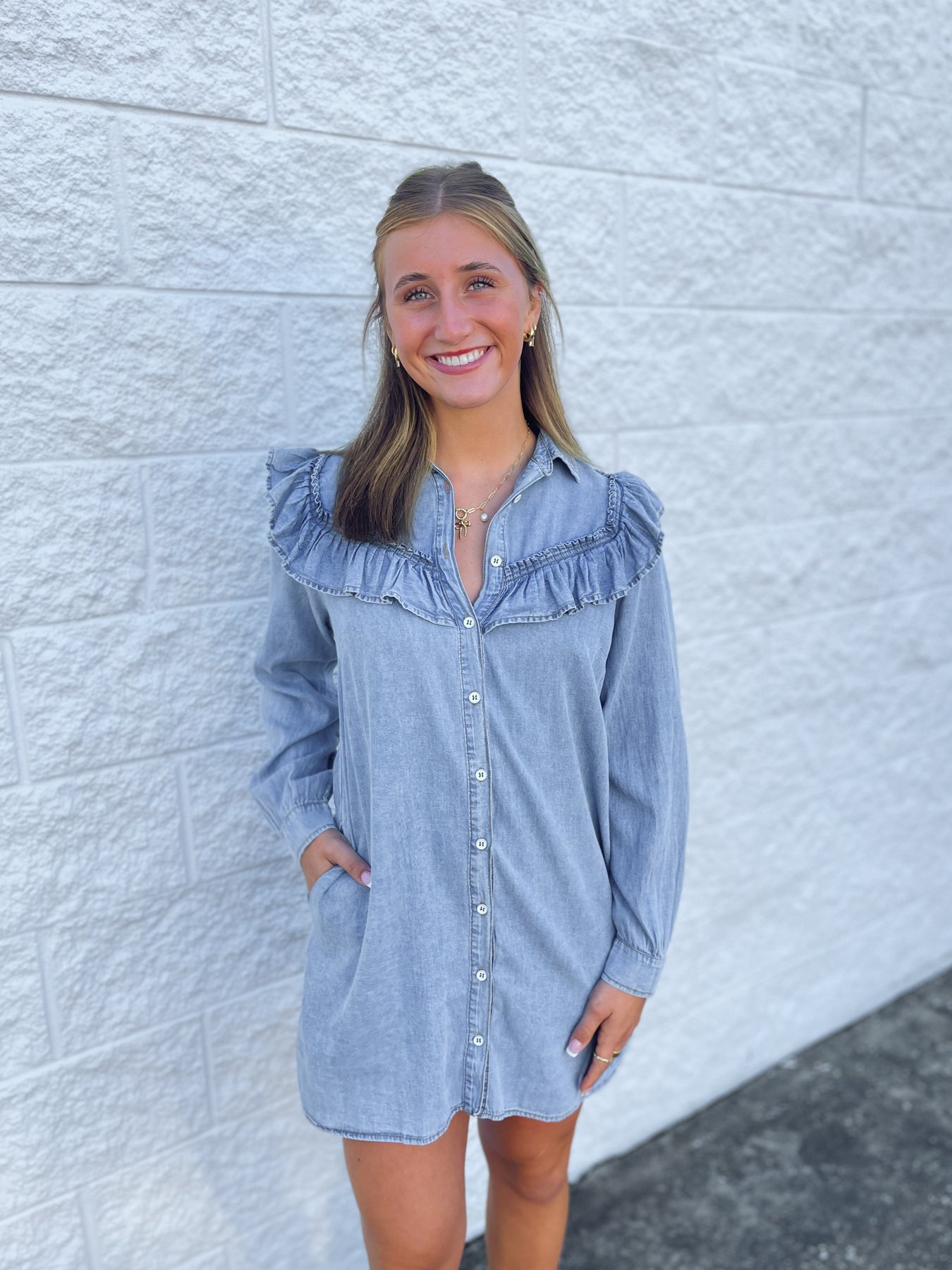 Step into fall with the Denim Reagan Dress, featuring a playful ruffle collar and buttons all the way down for easy style. This light wash, long-sleeve dress offers a fun mix of comfort and charm, making it your go-to for crisp autumn days.