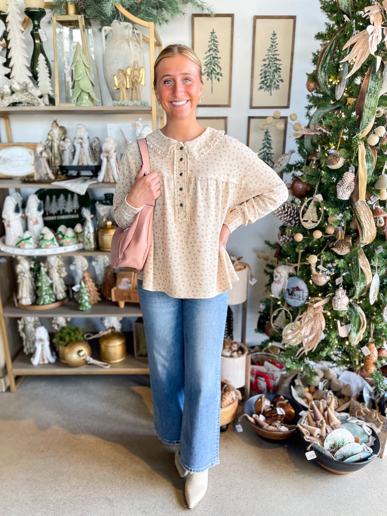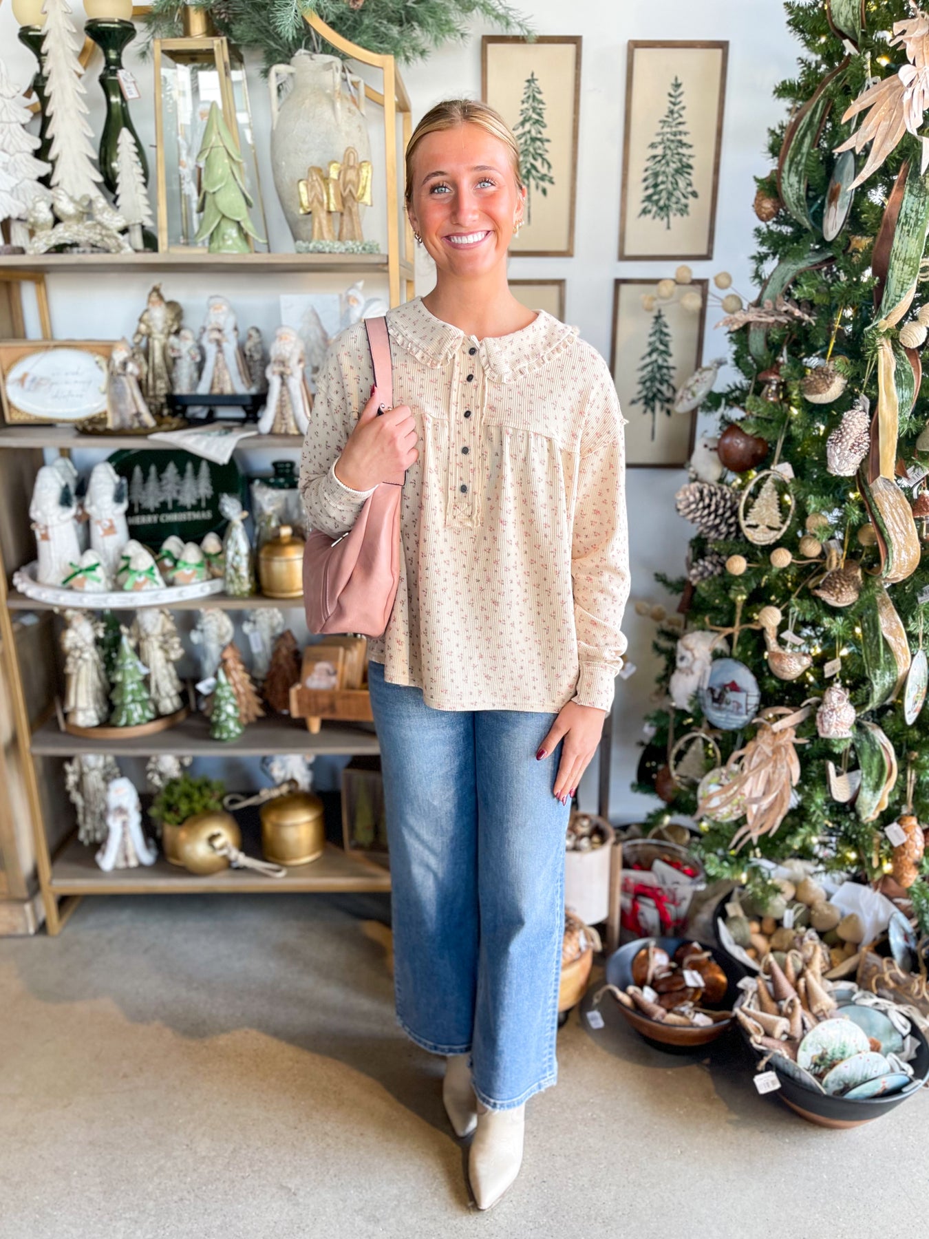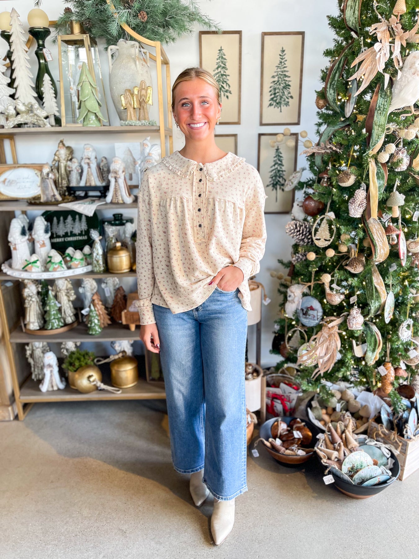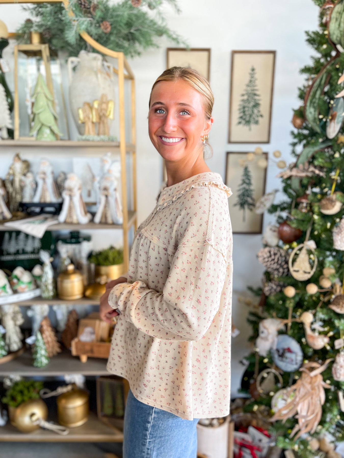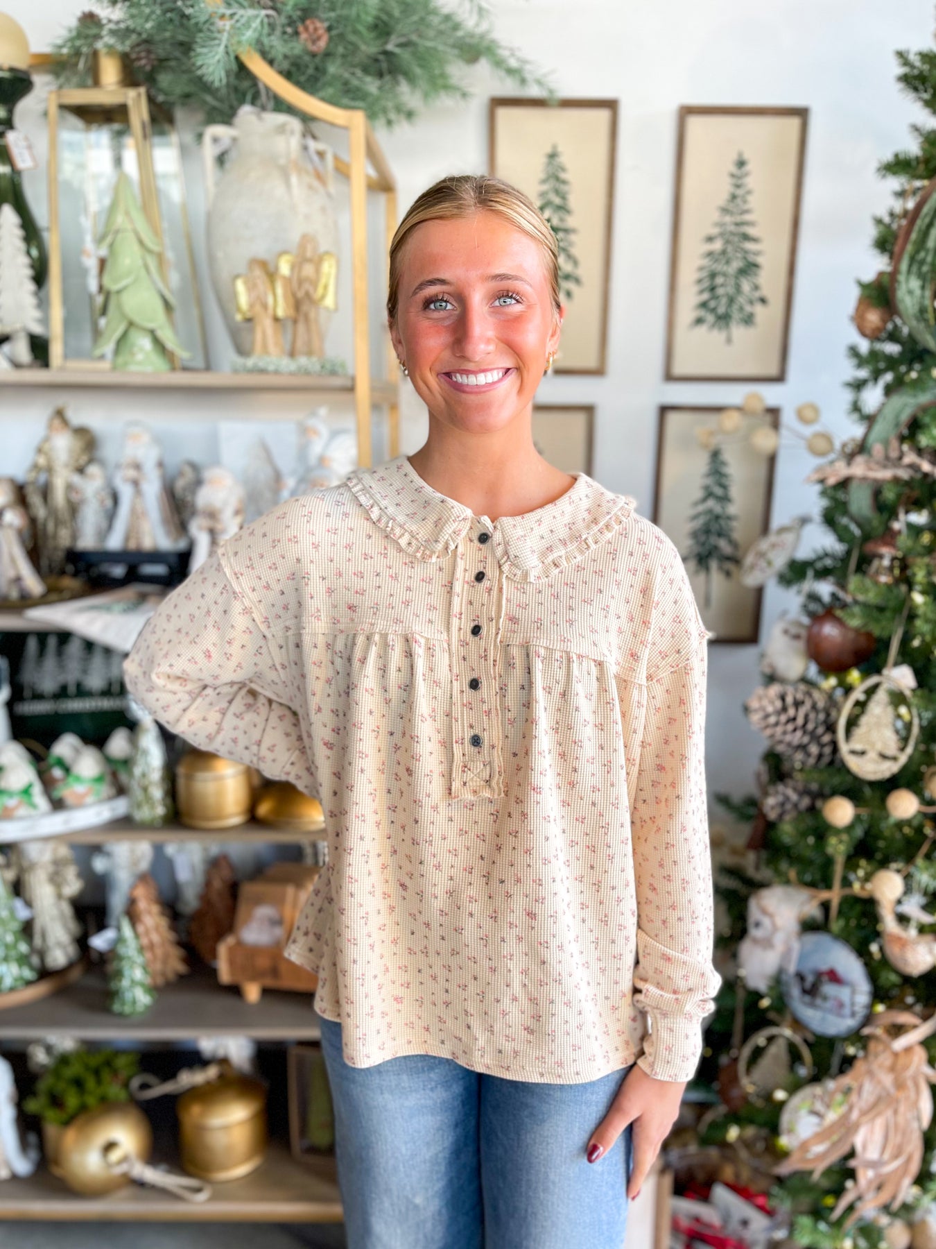 Meet your new layering obsession! This lightweight waffle knit top feels incredibly soft against your skin and won't bulk up under sweaters or jackets. The charming ruffle collar adds a touch of personality, while bronze button closure at the neckline keeps everything in place. Long sleeves provide easy coverage, and exposed seams give it an artfully undone vibe. Perfect for building effortless outfits that feel as good as they look.