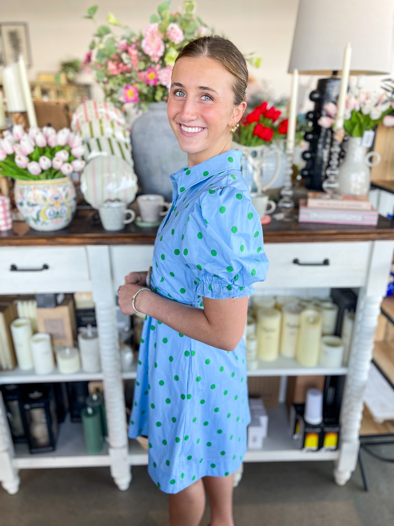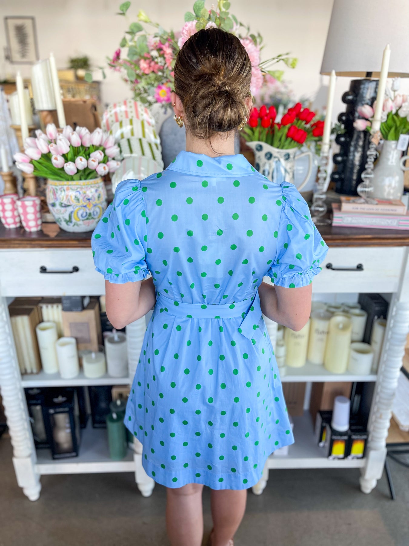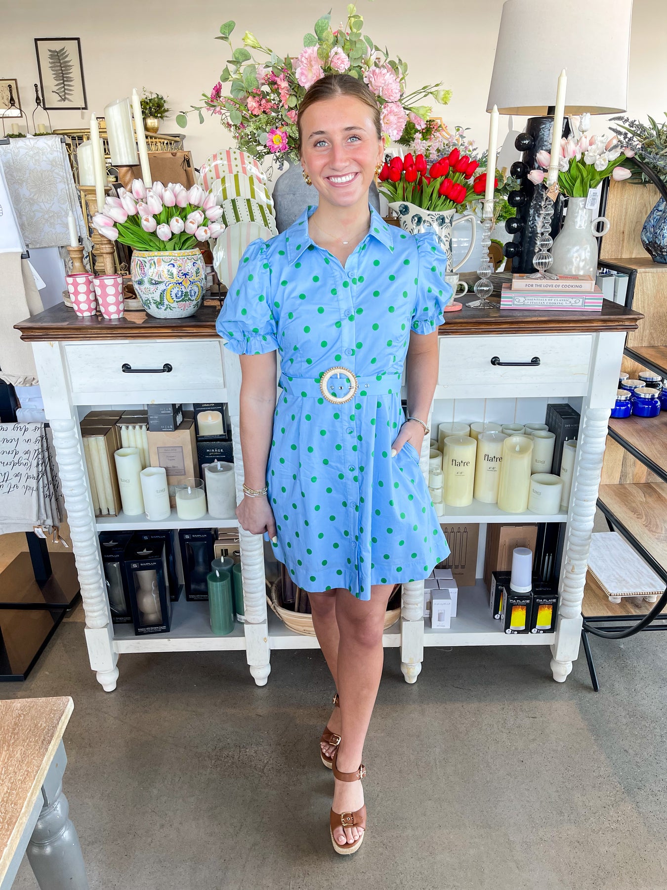 Elevate your wardrobe with this stunning blue dress featuring charming green polka dots. The lightweight, flowy fabric moves beautifully with you, while a decorative rattan belt cinches the waist for a flattering silhouette. Finished with a classic collar detail and button accents, this piece effortlessly transitions from casual to dressed-up occasions.