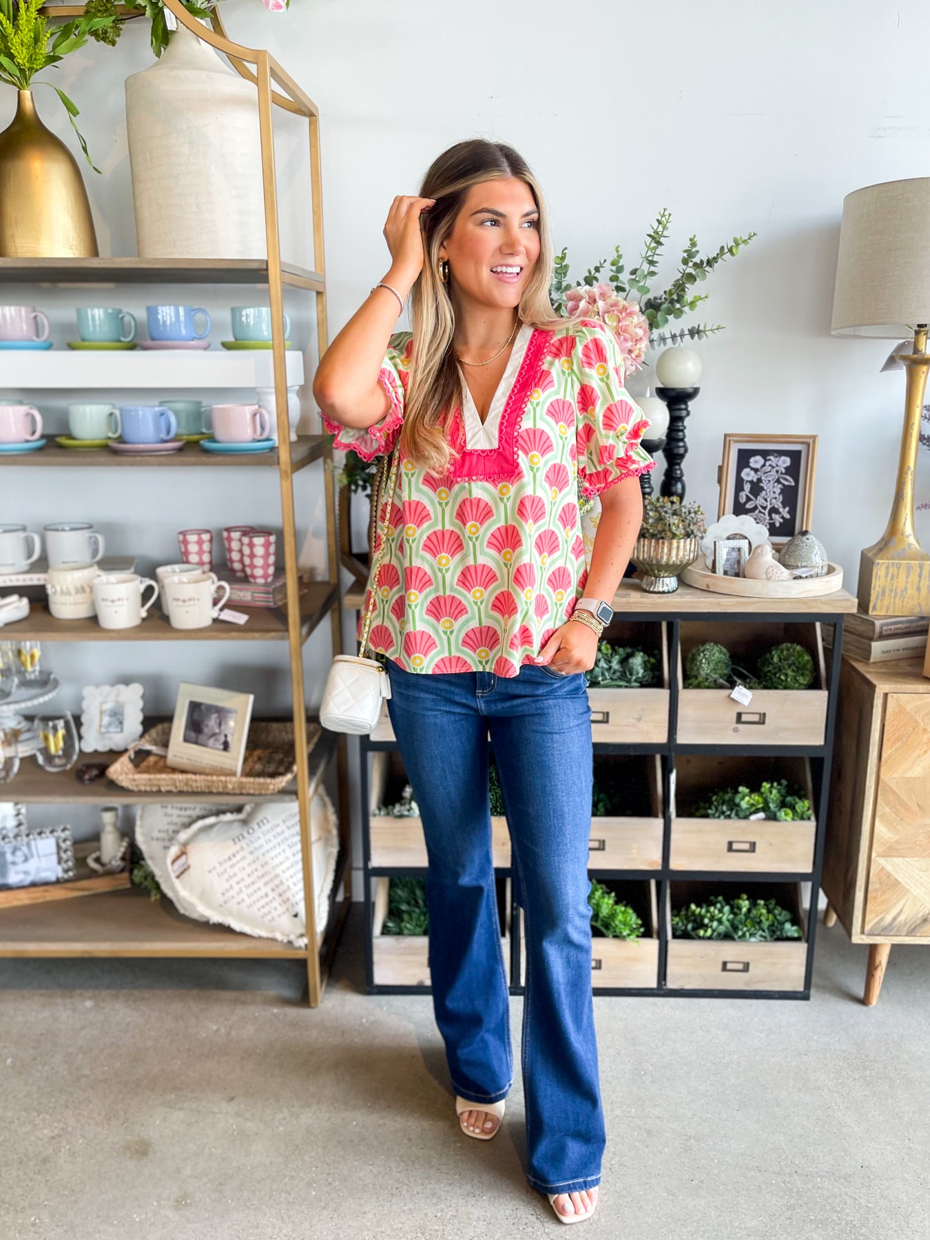 Dive into vibrant style with our Entro Coral Calypso Top! This eye-catching piece features a stunning print bursting with bright colors that'll have everyone asking, "Where'd you get that?" The super soft fabric feels like a dream against your skin, while playful ric rac and eyelet details dance along the neckline and sleeves for that extra pop of personality. Trendy, comfortable, and guaranteed to brighten your wardrobe – what's not to love?