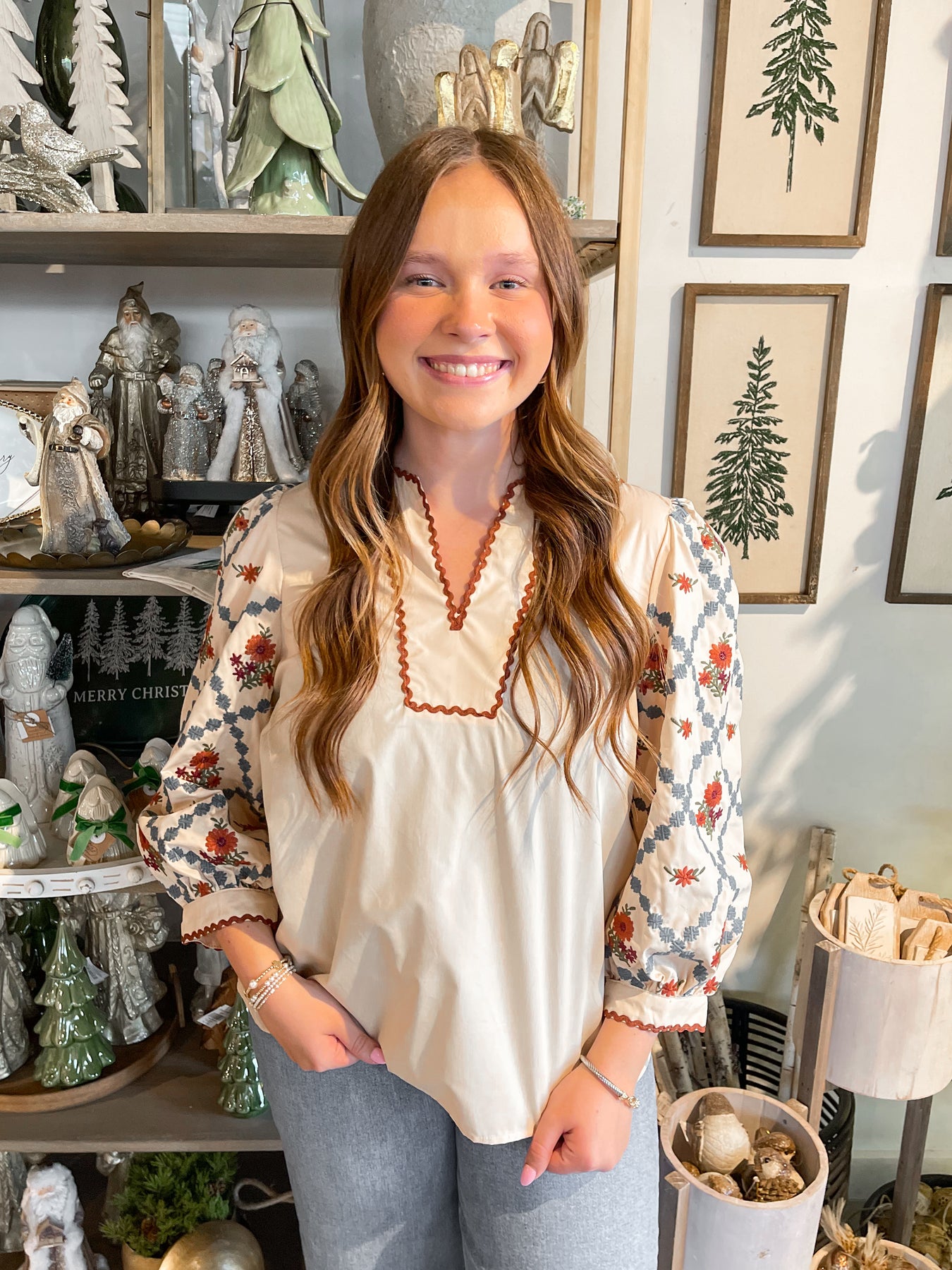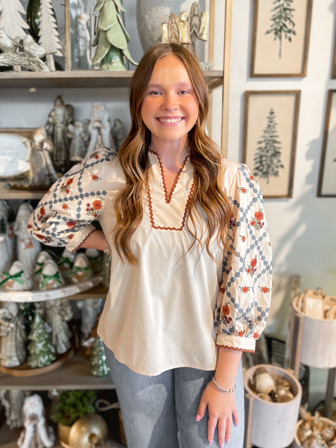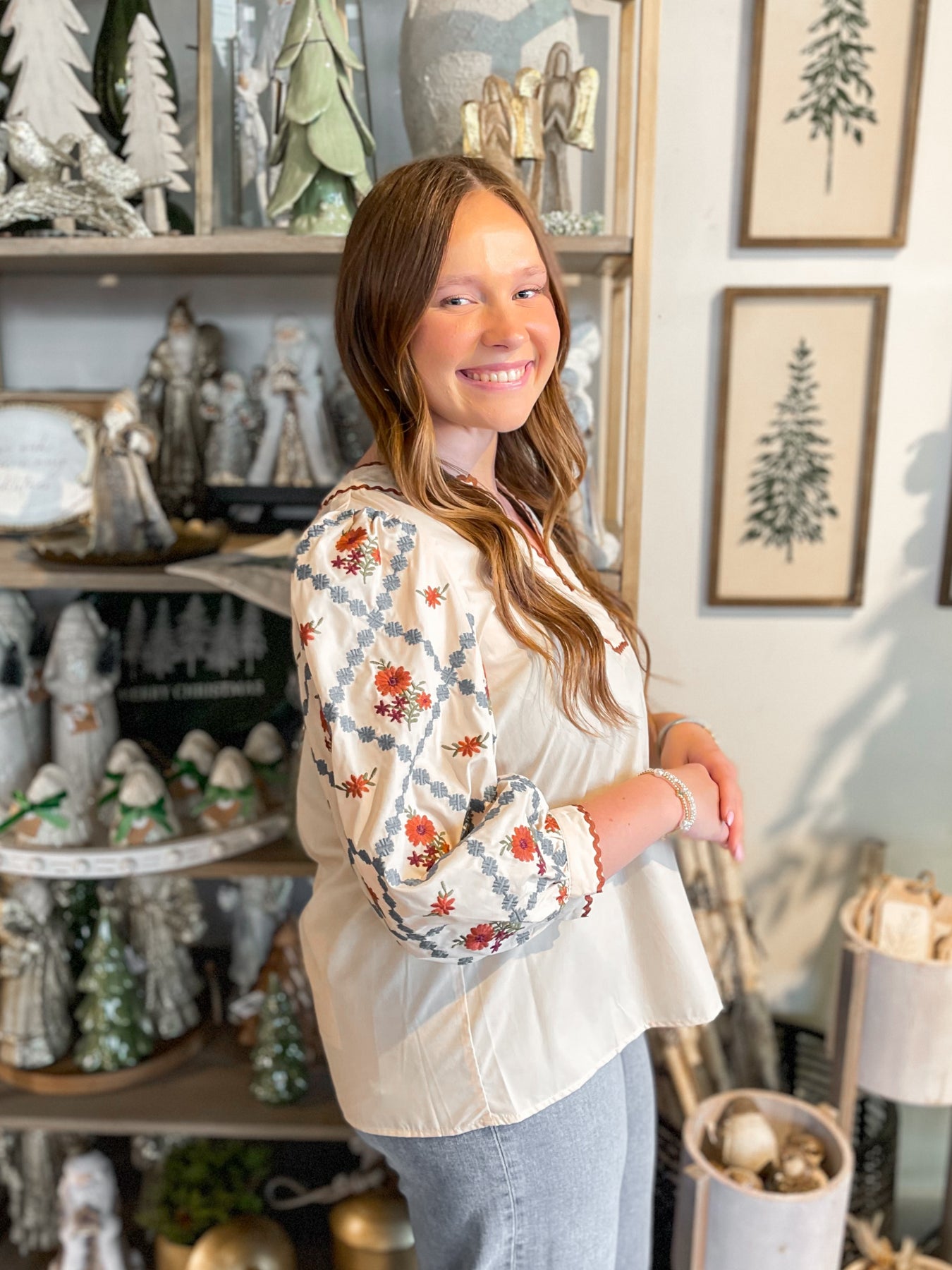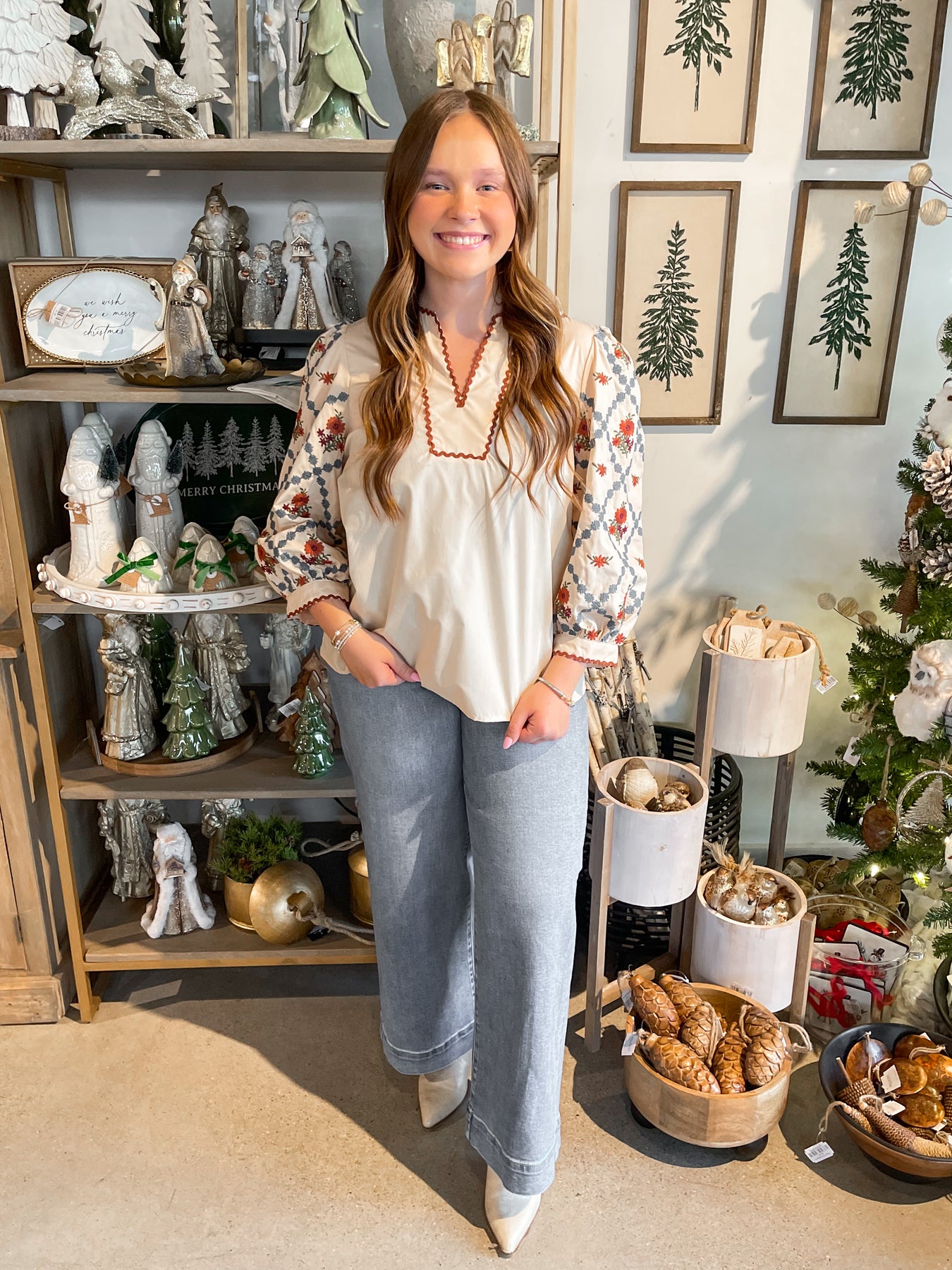 This stunning ivory top is bursting with whimsical charm! Delicate ric rac trim adorns the neckline and bust, adding a sweet, vintage-inspired touch. Colorful embroidery on the sleeves features pops of blue, red, orange, and green that bring playful personality to every wear. The flowy silhouette drapes gracefully, creating an effortlessly elegant look that works beautifully dressed up or down. Perfect for adding texture and visual interest to your wardrobe, this artfully detailed top brings joy and character to any outfit you create.