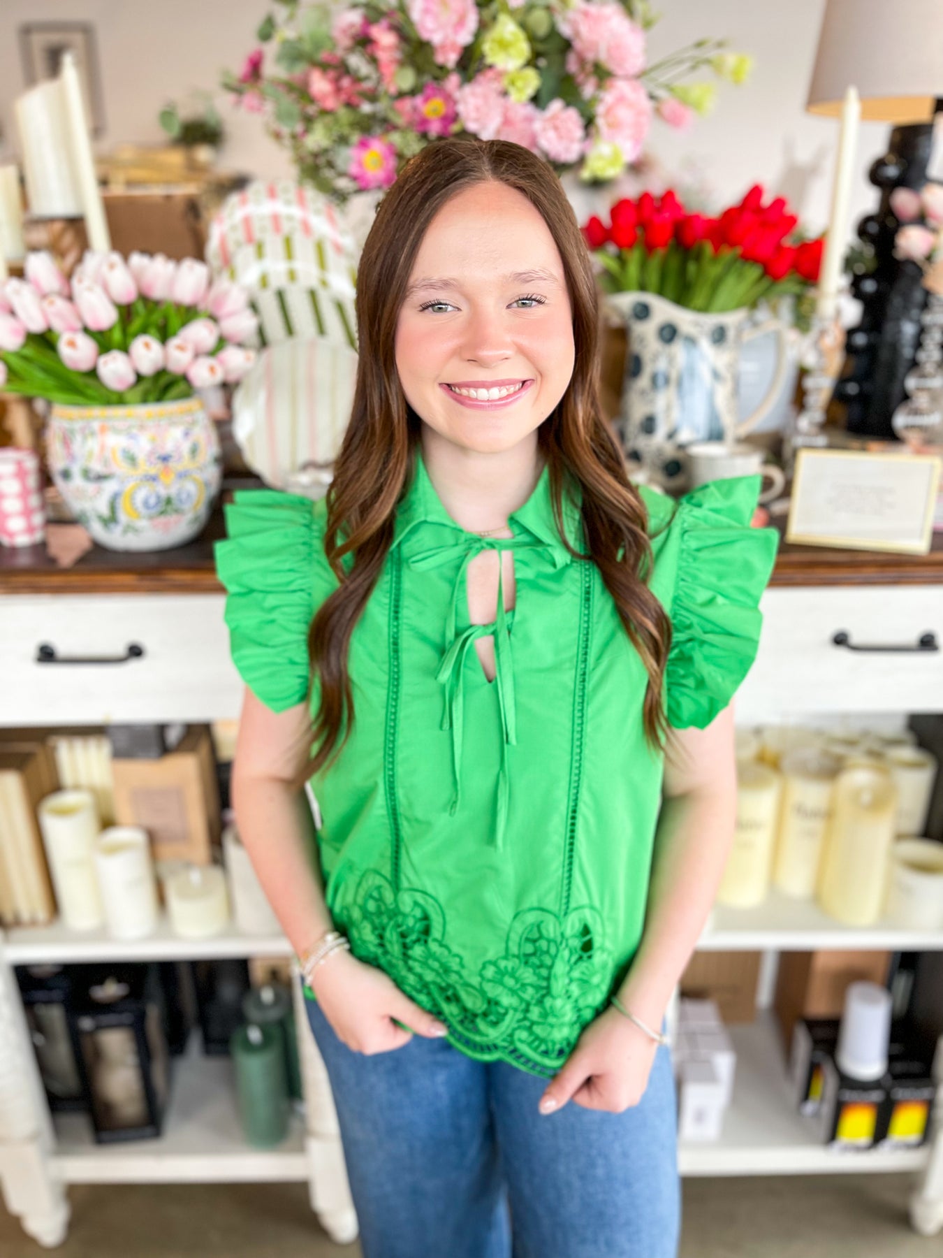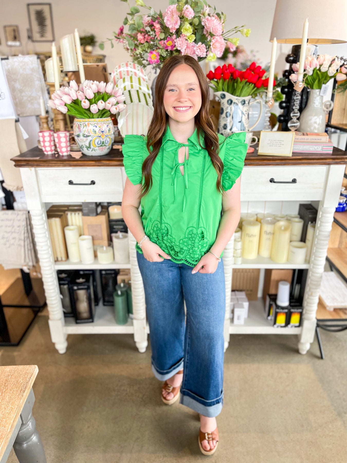 Elevate your wardrobe with this stunning green Isla top featuring delicate ruffle sleeves, eyelet lace at the hem, and a charming tie closure at the neckline. Perfect for creating effortless, on-trend looks, this piece combines contemporary style with feminine details. Whether you're dressing up for a night out or keeping it casual, this versatile top delivers the polished, stylish aesthetic you're looking for.