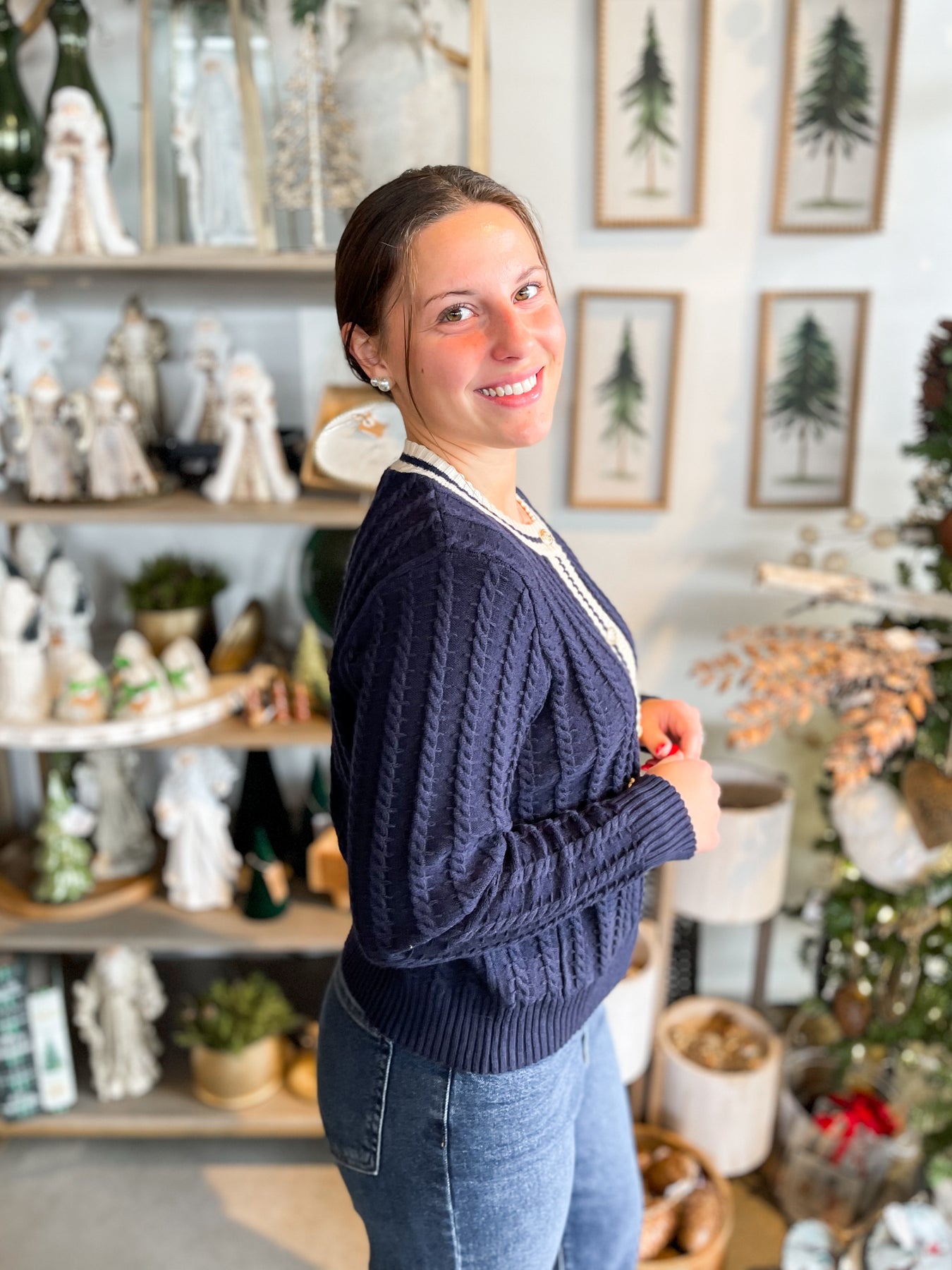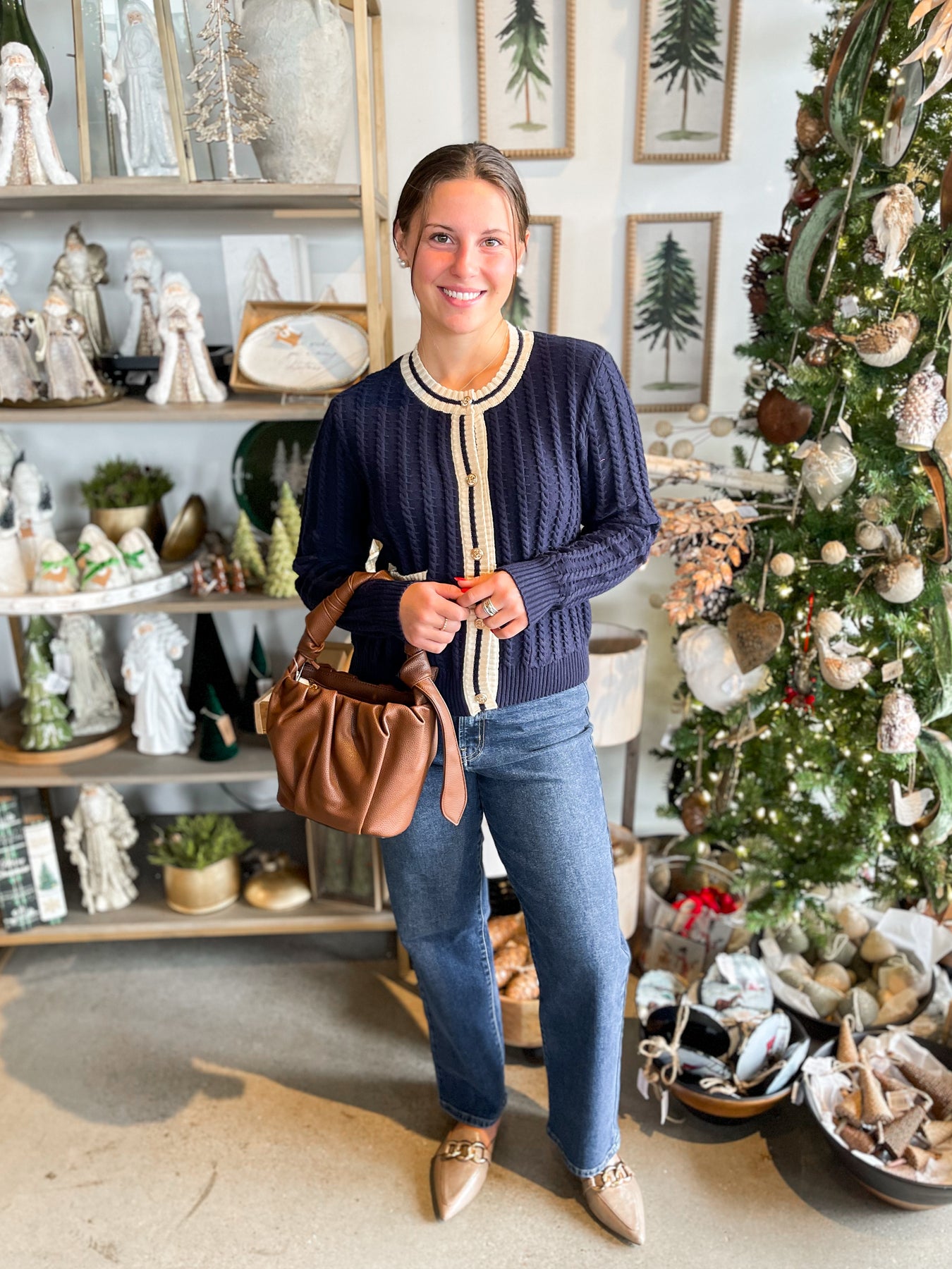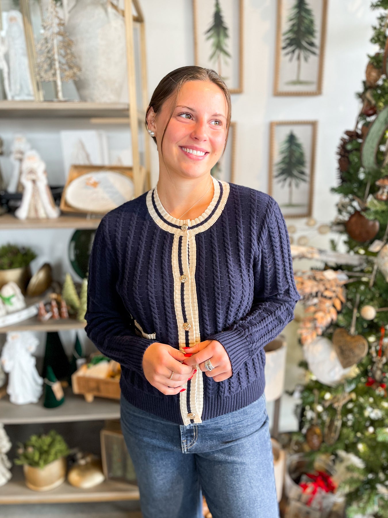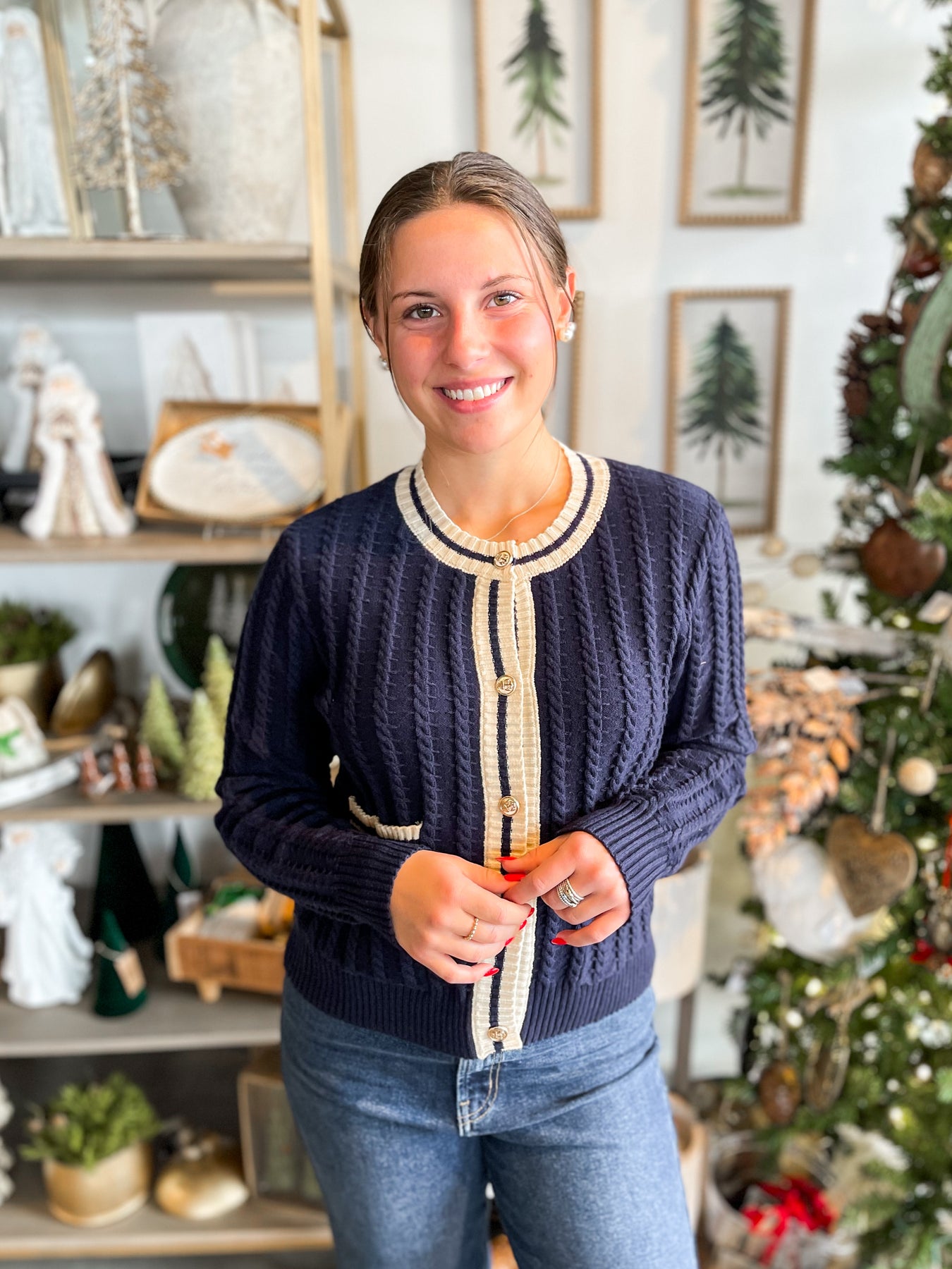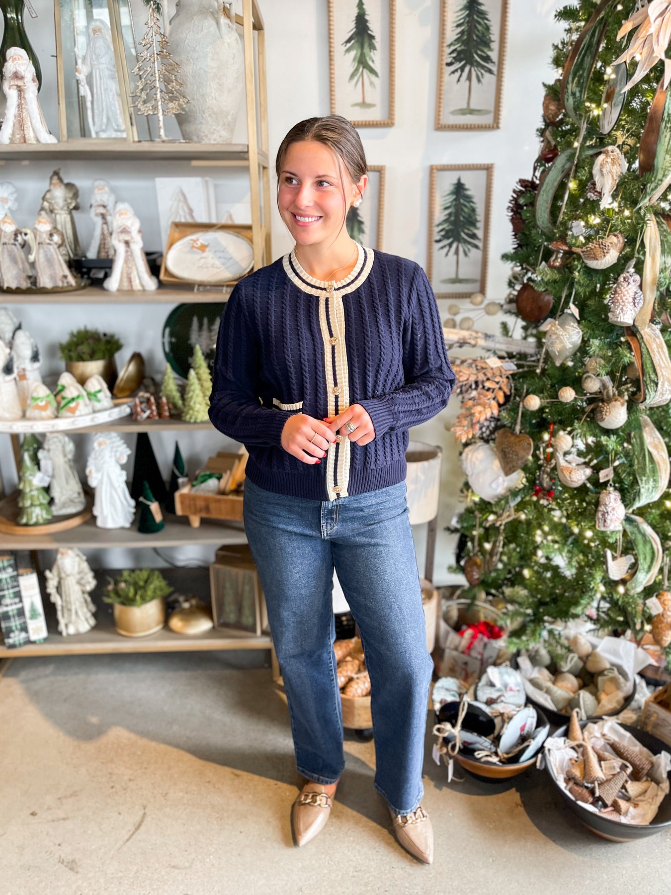 The Entro Navy Isabell Cardigan is your new wardrobe MVP! This stunning navy knit features elegant cream accents and shimmering gold details that elevate any outfit. The slightly cropped and fitted silhouette is super flattering, while practical front pockets add both style and function. Layer it over your favorite tee or dress it up for a night out—this playful cardigan transitions seamlessly from casual to polished. It's the perfect piece to add a touch of sophistication to your everyday look!