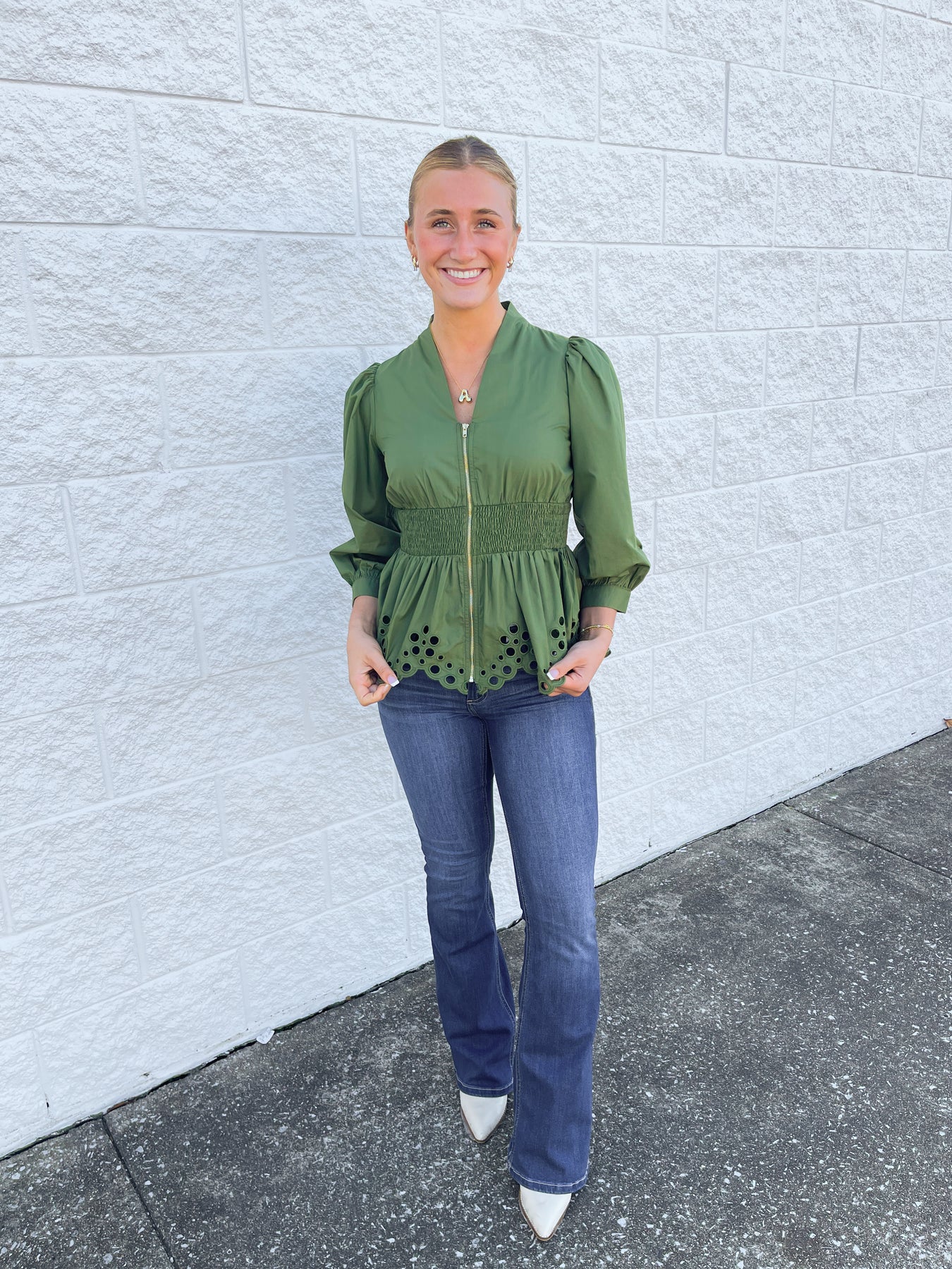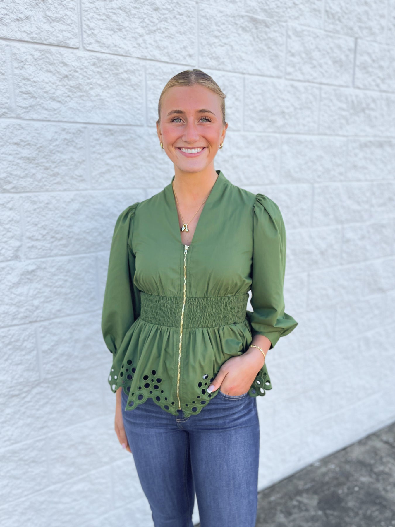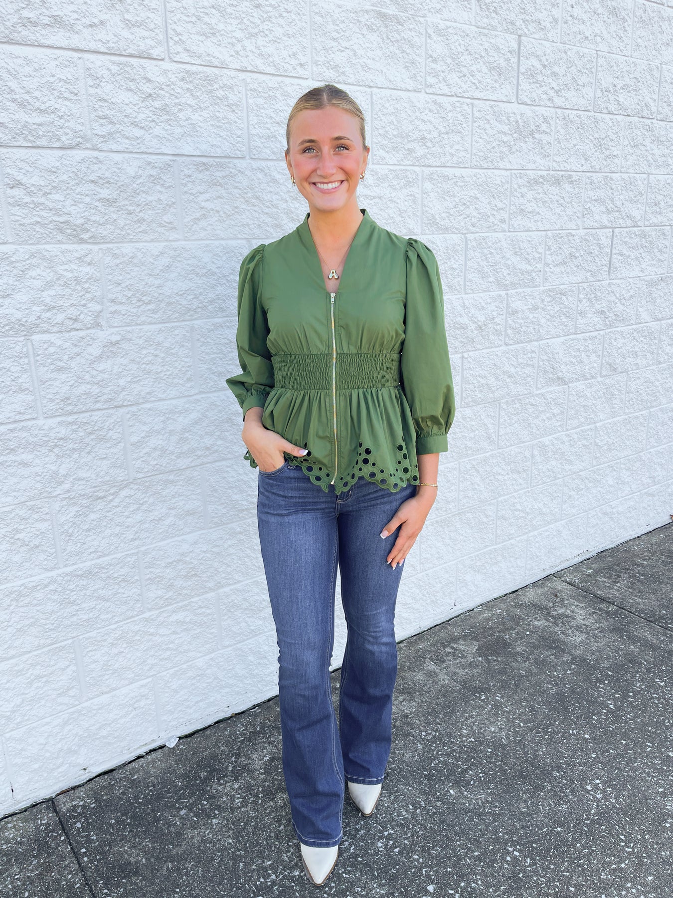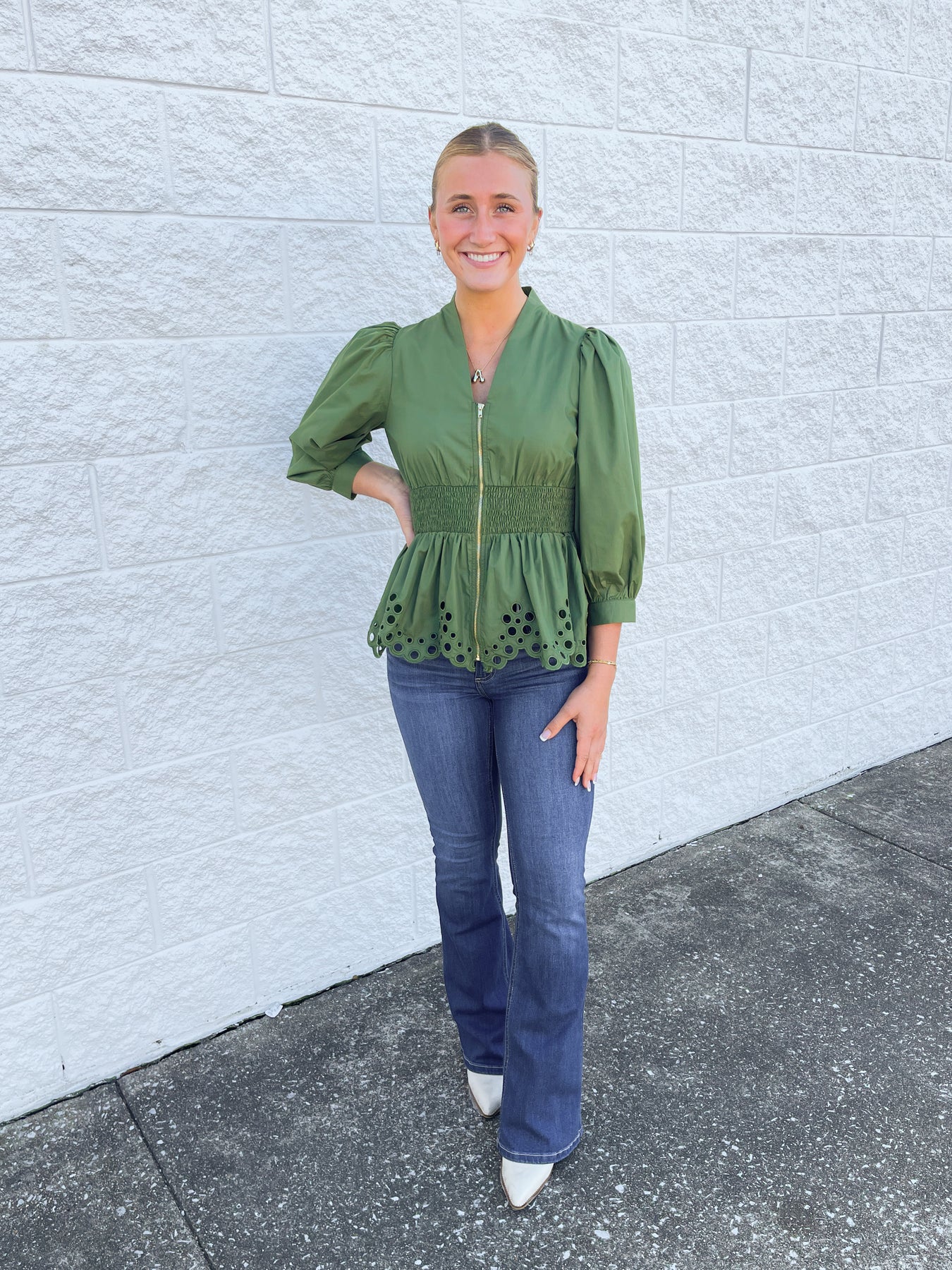 Fall in love with the Entro Olive Greer Top! This stunning olive green piece features a trendy smocked waist and playful eyelet details along the bottom. With a chic V-neckline, gold zipper accents down the front, and breezy 3/4 sleeves, it’s the perfect stylish pick to brighten up your autumn wardrobe.