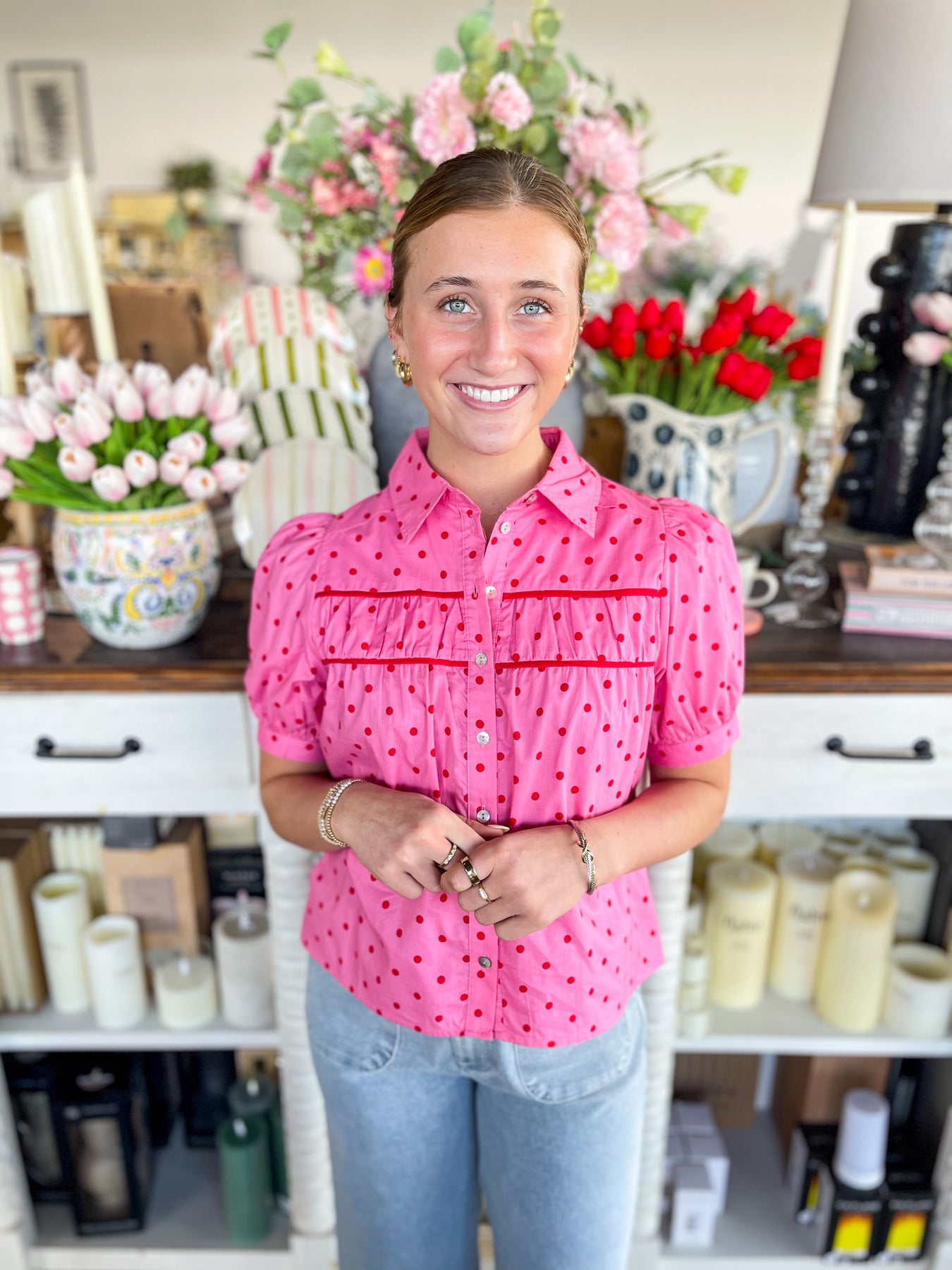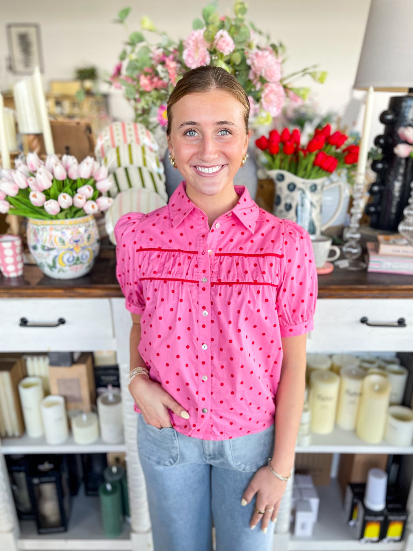 Elevate your spring wardrobe with this stunning Entro Pink Irya Top, featuring a captivating Pink and Red polka dot pattern that brings playful sophistication to any outfit. The trendy short puff sleeves add a contemporary touch, while the green lining accent along the bust creates an elegant detail that catches the eye. Perfect for layering or wearing solo, this piece combines vibrant style with flattering design for the season ahead.