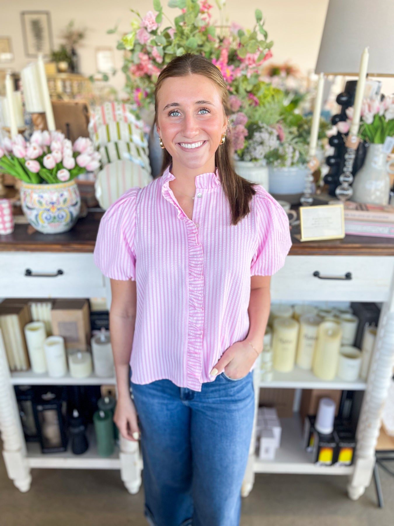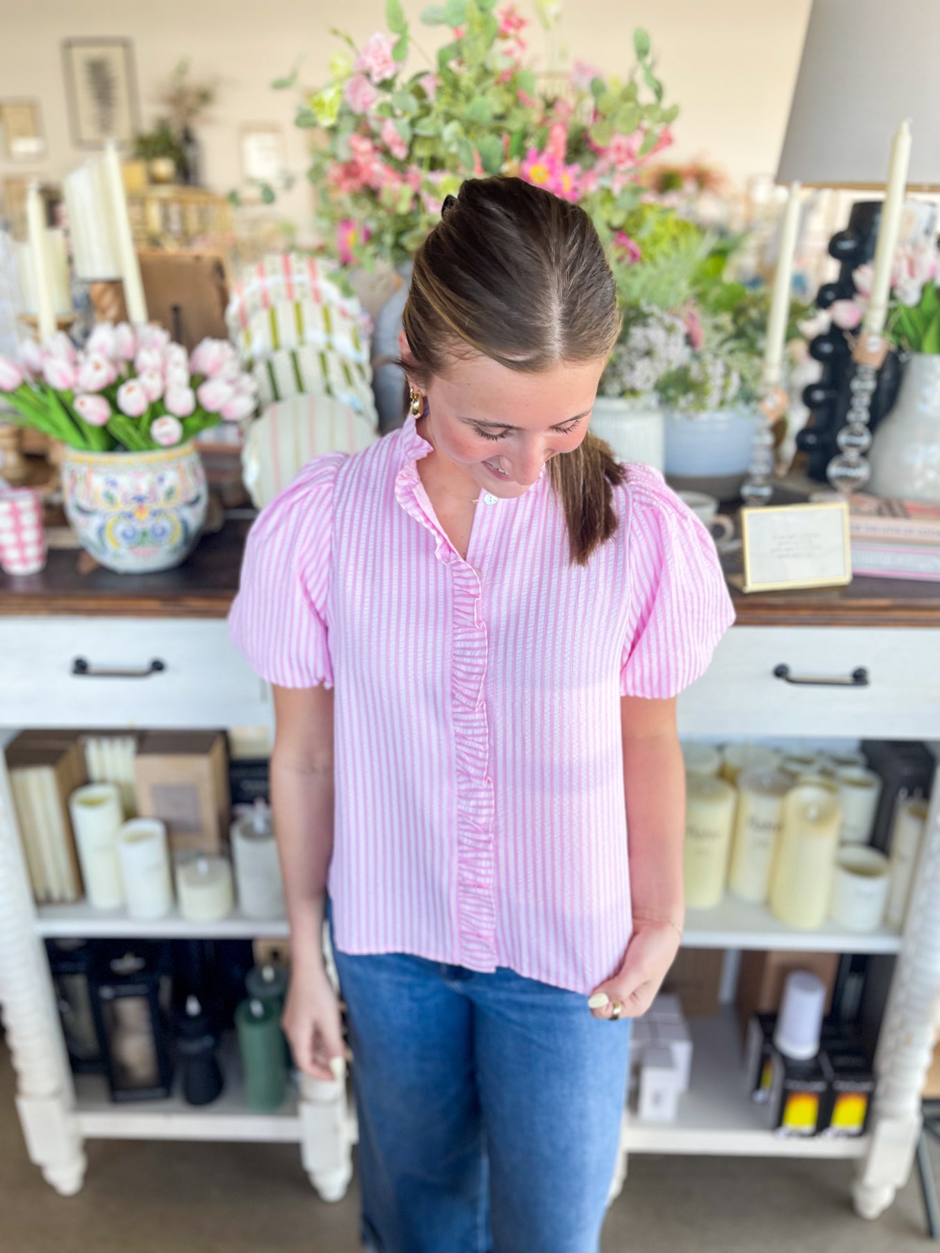 Elevate your spring wardrobe with this stunning dual-tone pink striped top. Featuring charming puff sleeves, a flattering V-neckline, and functional button front, this piece combines style with comfort. The loose, lightweight silhouette makes it perfect for warm weather layering or wearing solo. Effortlessly chic and versatile, it's an essential addition to your seasonal collection.