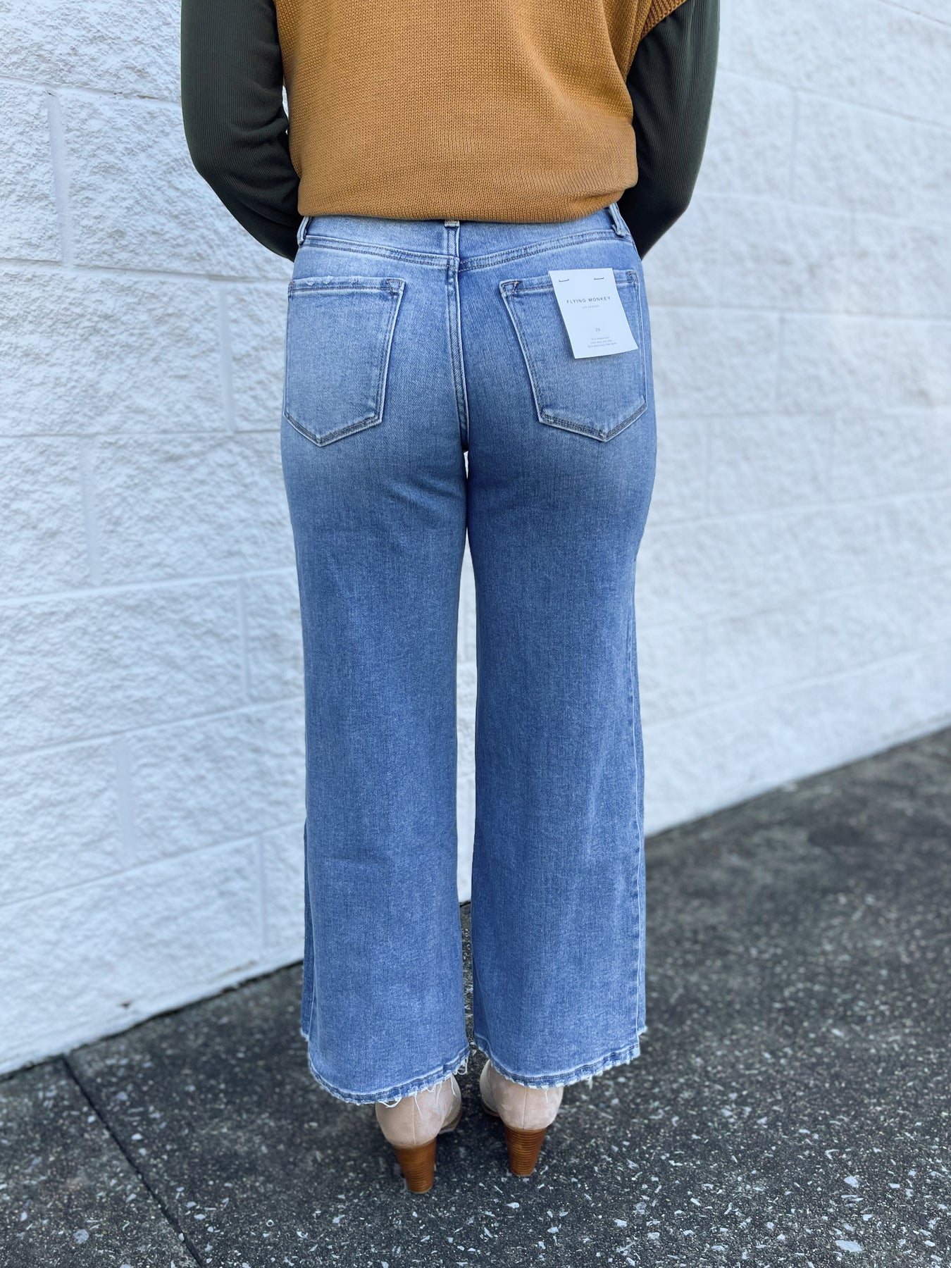 Step into fall with the super cute Flying Monkey High Rise Wide Step Hem Jeans. These medium wash jeans feature a trendy distressed hem, slightly cropped length, and classic belt loops, making them the perfect playful addition to your seasonal wardrobe.